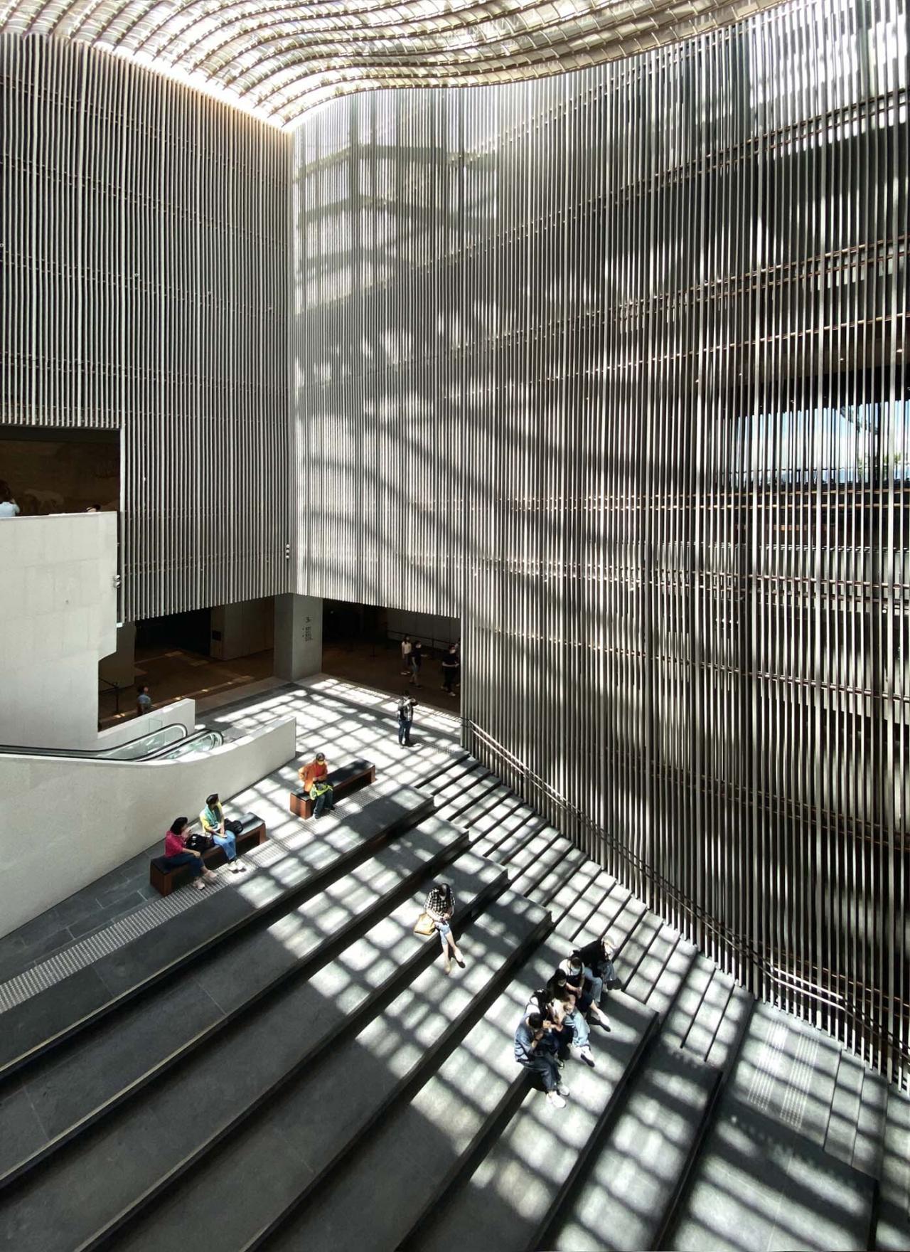博物馆入口前方设有开阔的平台广场,可供展出大型装置或进行传统节目及舞蹈表演。广场呼应故宫的城墙设计,外侧由回廊包围,一直延伸至博物馆入口。经过广场进入博物馆,访客便置身偌大的大堂空间中,可以稍作停顿,闲聊片刻,并了解展出中的展览。