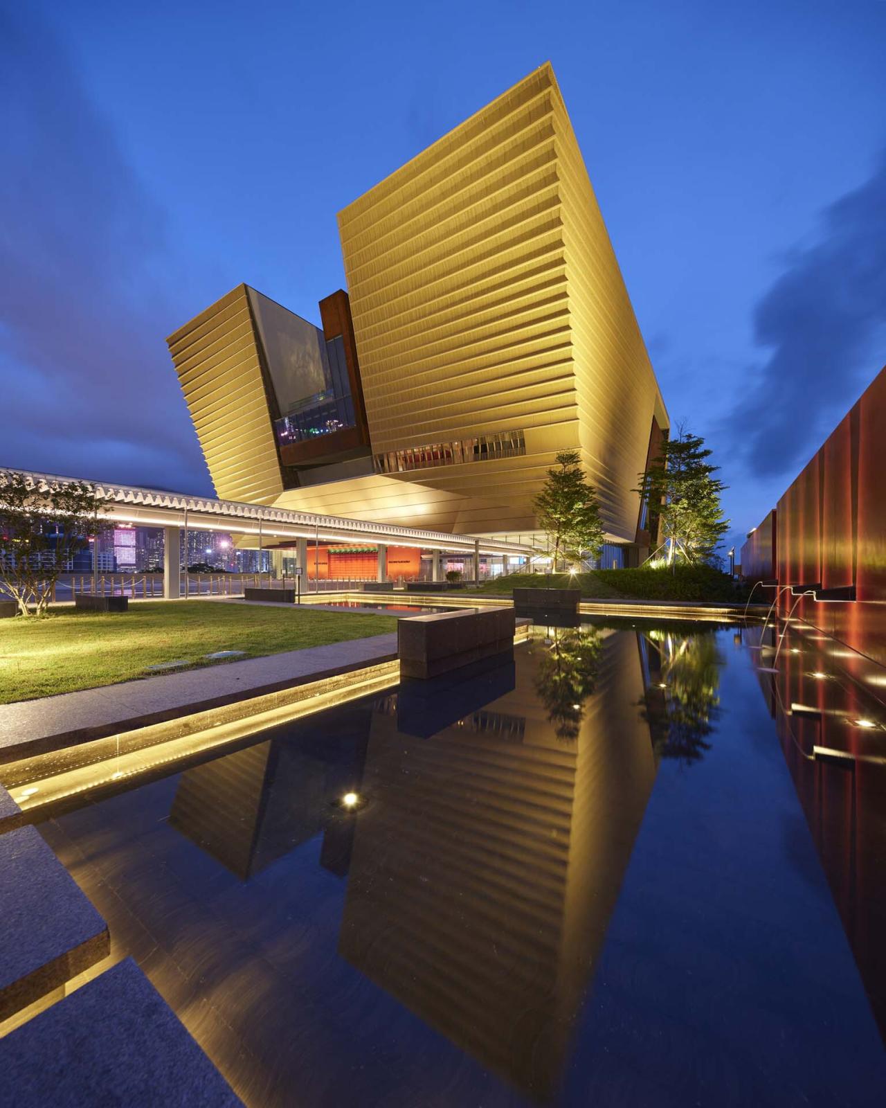 博物馆总建筑面积达30,000平方米,坐落西九文化区的西端海旁,毗连艺术公园,维多利亚港海景一览无遗。设计以博物馆积极向现代观众推广中国传统文化的理念出发,以当代建筑语言重新演绎中国传统空间概念,参照了北京故宫里院殿沿中轴水平递进的空间布局,利用三个中庭空间层层迭加塑造出连贯的楼体,引导访客穿梭各个楼层。另方面,垂直递进的中庭空间设计呼应香港高度密集的城市肌理,巧妙地令地面层得以最大程度保留开放空间和绿化园境。