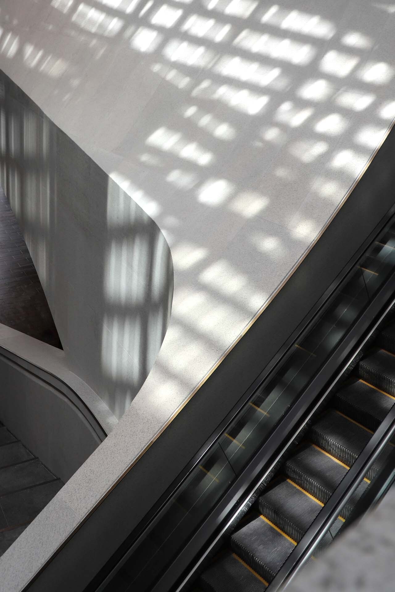 博物馆内部以波浪形的黄铜天花连贯整个空间,设计让人联想到北京故宫的金黄屋顶。特色天花沿动线中轴一直延伸,由下以上包裹整个楼体,除了加强了垂直连贯的空间感,亦让自然光从顶层充分照进室内空间。天花设计极具雕塑感和方向性,与主要以石材配搭混凝土的楼体结构相映成趣,为博物馆的细腻格调增添了亮点。