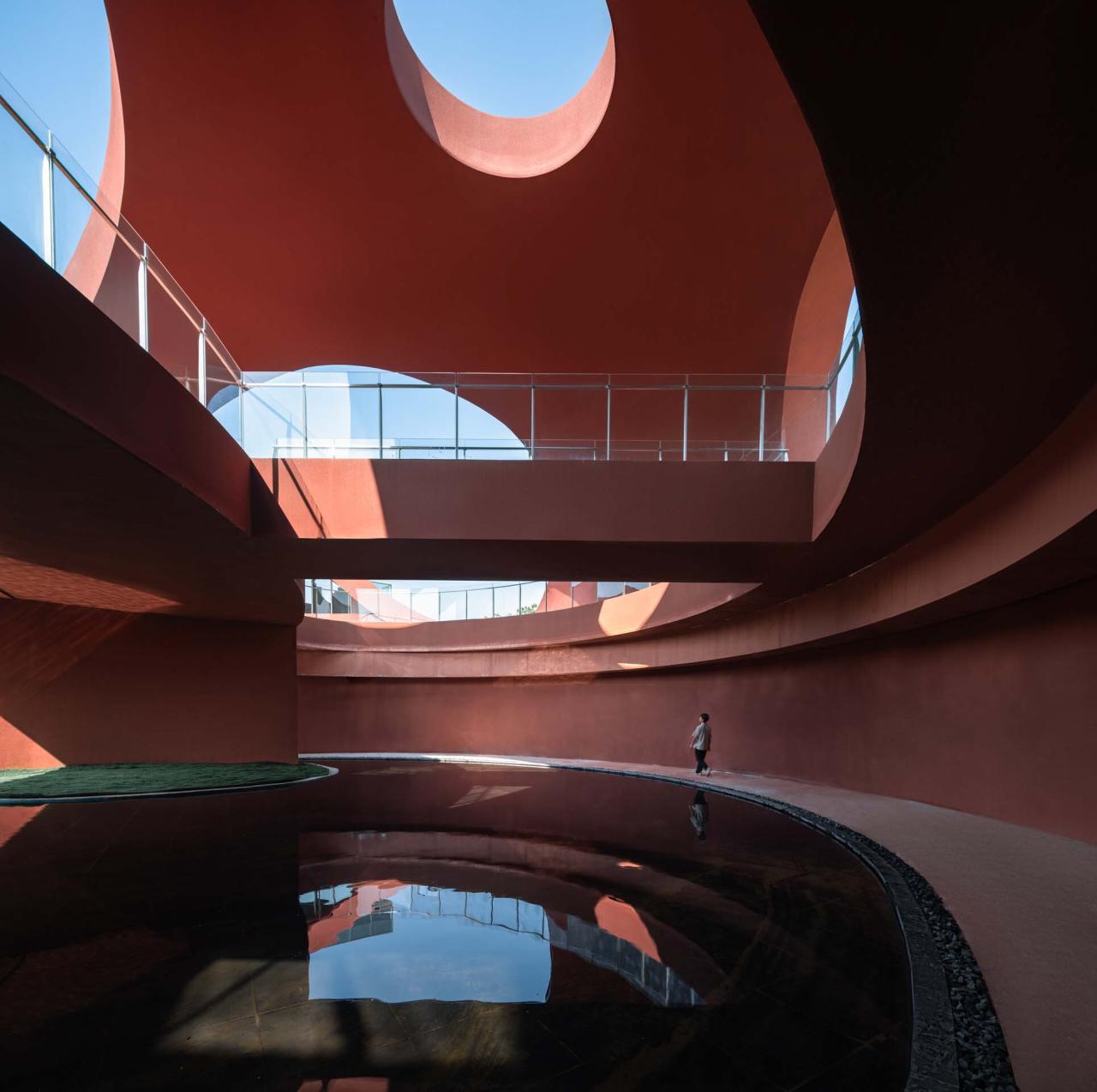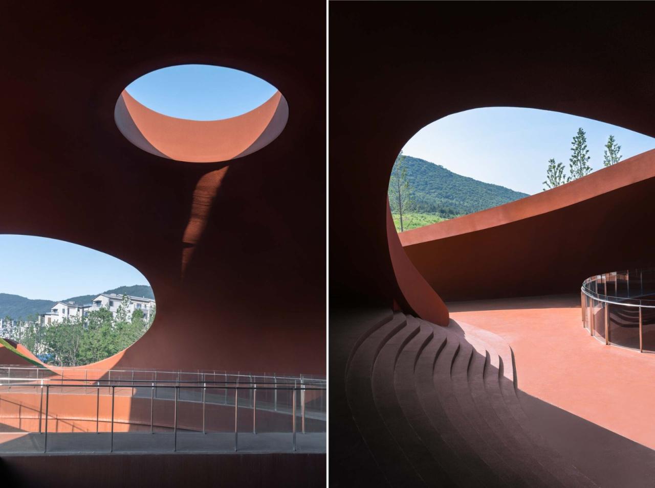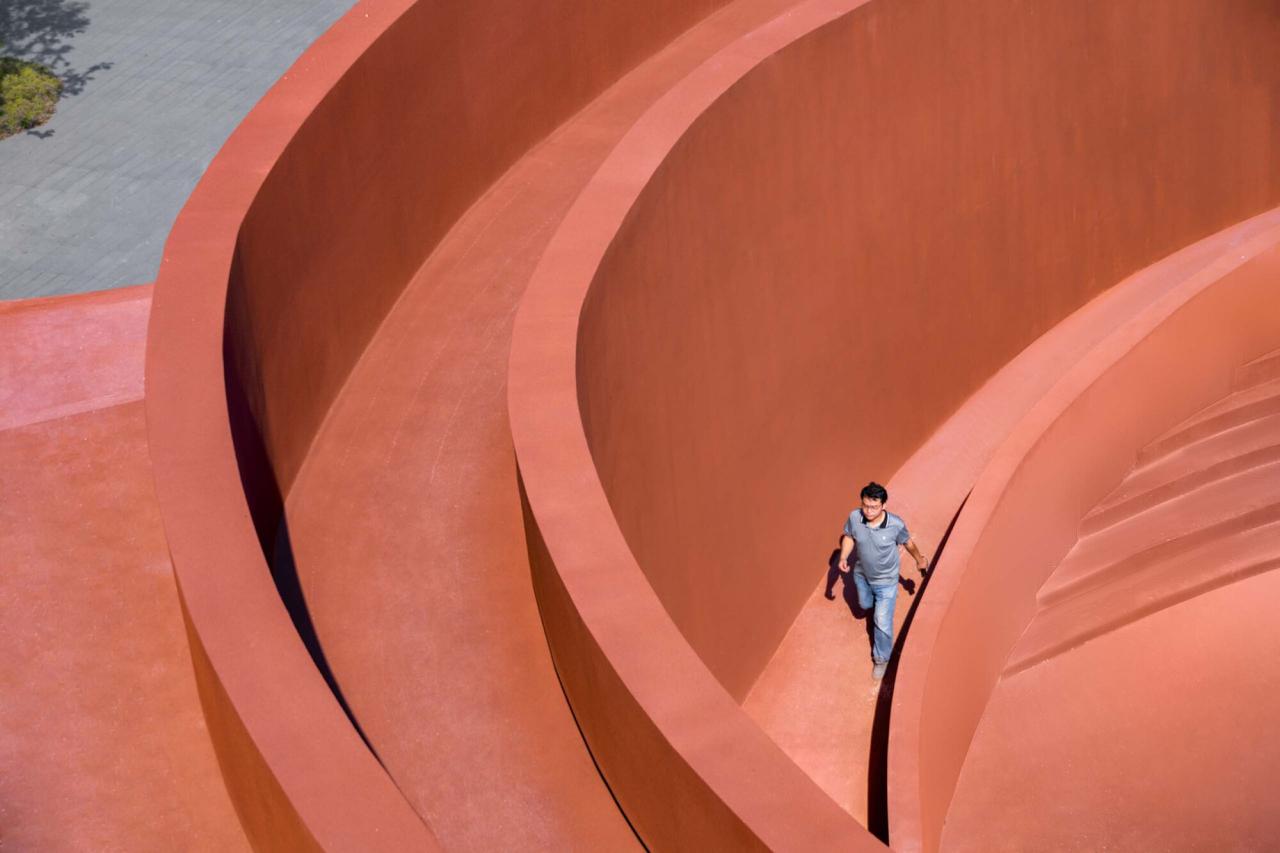 展陈自然的雨后倒影半圆形的壳面洞口使远景的山脉进入了建筑的“橱窗”。一阵小雨后的大平台,半圆形洞口在镜像作用下,反而完型了。这不是可以说“是故虚胜实,以不足胜有余了”场所的观影丰富自由的曲线,处处可见对外部环境的独到剪裁。这些瞬间的剪影在整个建筑的行走过程中形成了一帧帧具有电影感的画面,连在一起,就是一场自然的完美演出。