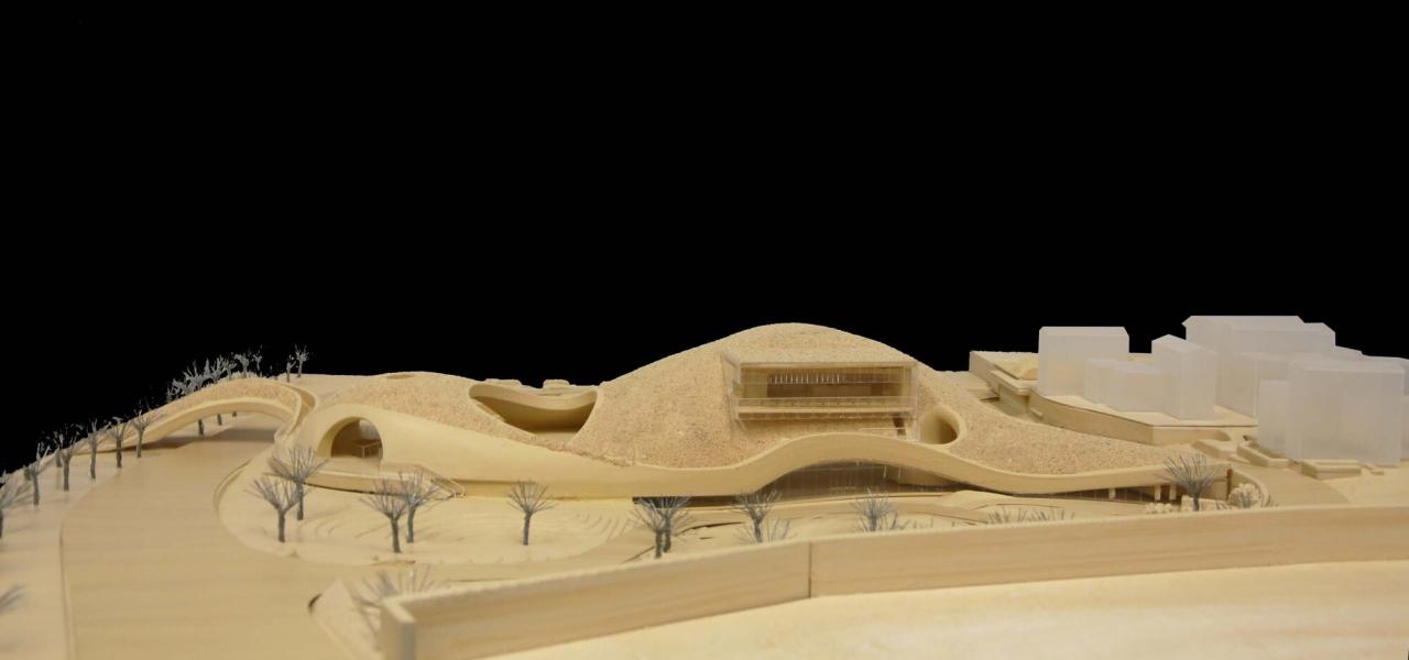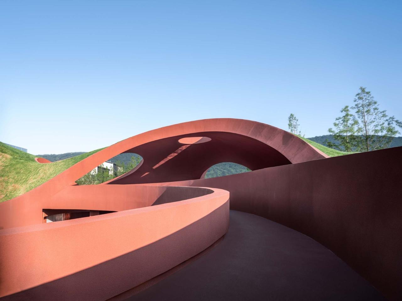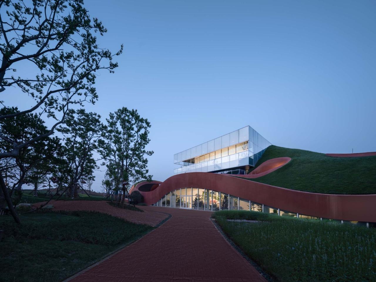 线索于自然的形态演绎建筑的‘模形’起始于山体和大地等高线的‘投影’;通过一条虫子蠕动的运动过程将地质运动改变大地地貌的力量对‘模形’进行了‘壳体’运动的演绎,虫的路径亦成为了建筑室内外‘壳面’的边界;在‘虫洞’的位置,嵌入了贯穿自然要素的观景方盒子。柔和的形态是展露其外的对外部山体的成像,刚性挠度的曲率线条则是内在蕴藏的源于令人敬畏的地表之下大地力量的含蓄侧露。整个建筑就像从地壳之下被自然造山力量挤压出地面似的,是地质空间的三维剖面。种植在壳体表面的绿植屋面,使得这个建筑仿佛不是被建筑师空降在这个场所里,而更像是原本存在,只是没有把附着在外的地表揭开被见而已。