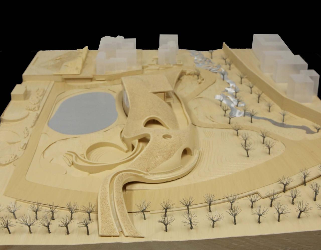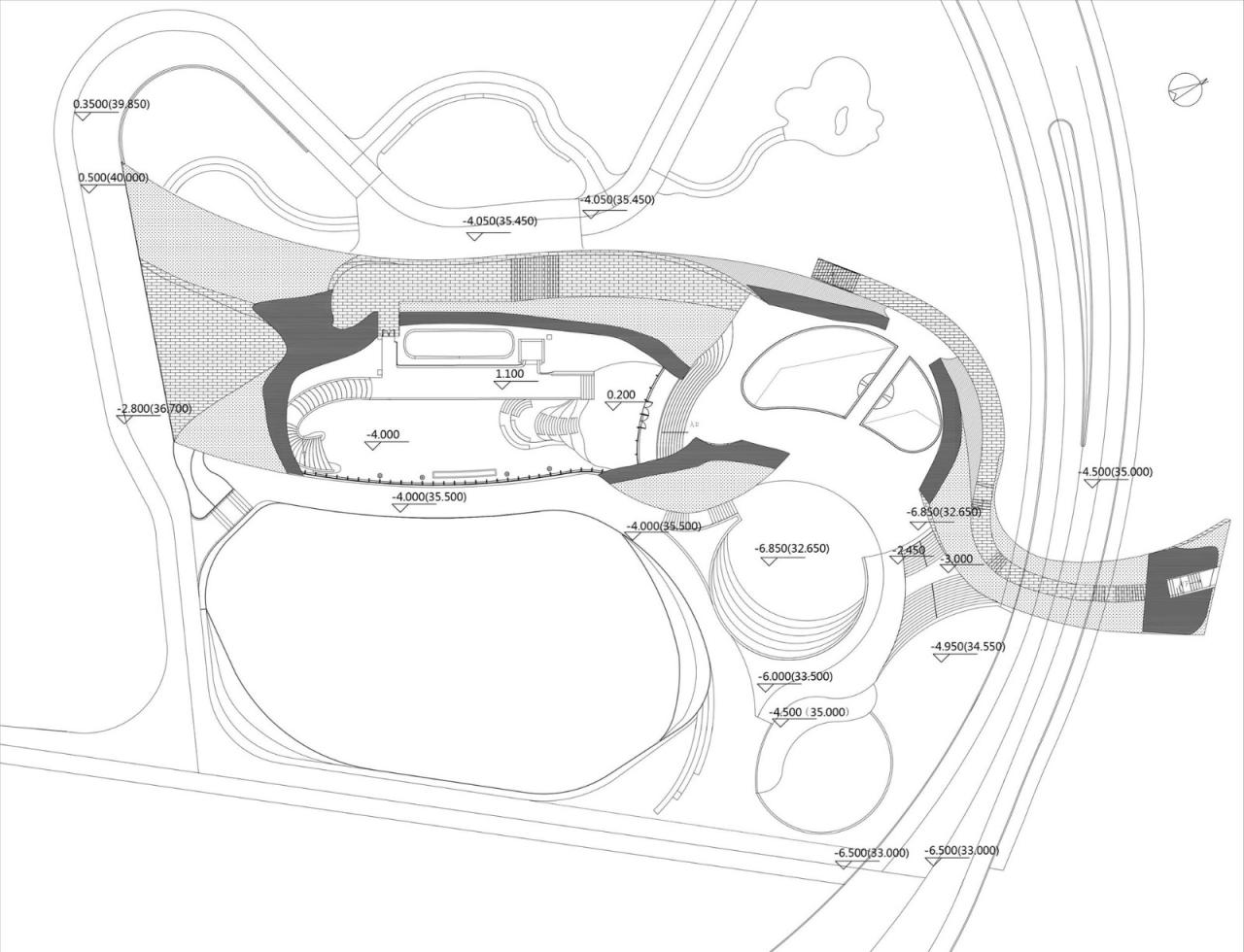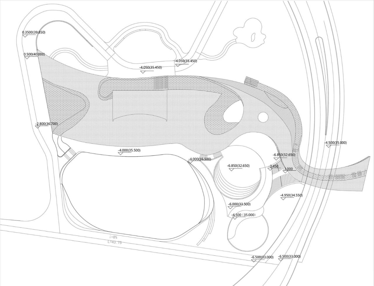 露天剧场比喻山体切面的片墙构成了通往建筑下沉空间的边界,在边界之间,是一个下沉的露天剧场。这个剧场将会承担未来建筑的室外表演场地。下沉空间剧场的视觉灭点,是穹壳下通高空间下的下沉水面,自然雨水在这里被汇集。当雨水被排干,水面消失的时候,也可以作为一个表演的小舞台。