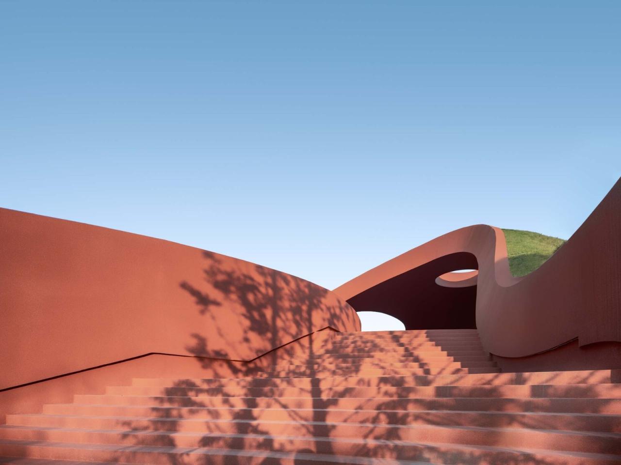 有形的建筑,无形的边界大自然是没有边界的。作为自然环境中的一部分,建筑的边界就是随性所致的在环境中行走的时刻。坡道进入进入建筑的第一条路径是通过前场外置的半空高度的坡道进入,并将人缓缓导向一个令视觉振奋的穹型壳面空间。大台阶进入进入建筑的第二条路径是从朝向跨越道路的屋面下空广场的景观台阶上去,同样把人导向了那个穹壳空间的下空。屋面进入跨越市政道路的屋面,同时也是一个联系南北地块的步行桥面。从桥上走过,欣赏着建筑和远山的叠影重重,不经意间,也走向了那个穹壳空间。