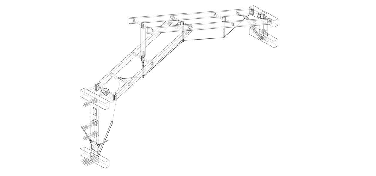 小会议室在弧向桁架梁基础上,每4.5°辐射布置一榀开缝次梁三角屋架。大小会议室不同的屋架形式与传统木构等级制契合。在此基础上,结构与屋顶采光及设备管线融合,桁架梁成为侧高窗的源泉,匀质布置的开缝次梁间隔了一条8cm槽,其间游走消防喷淋、照明灯具以及其他设备管线。