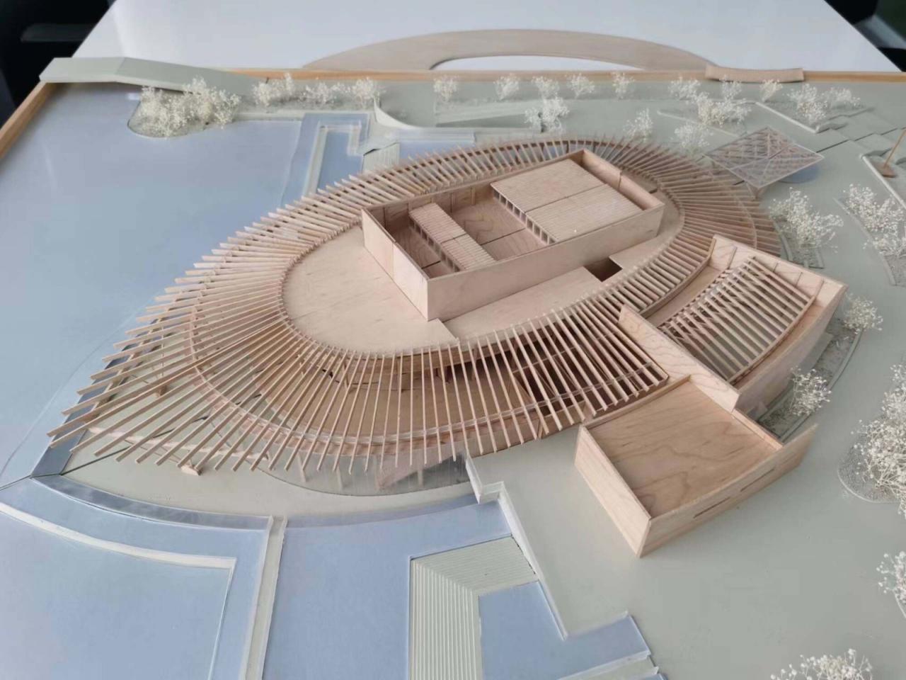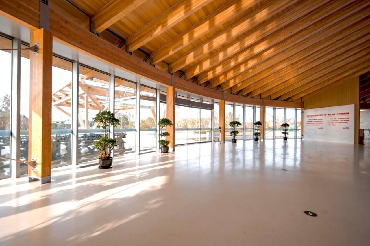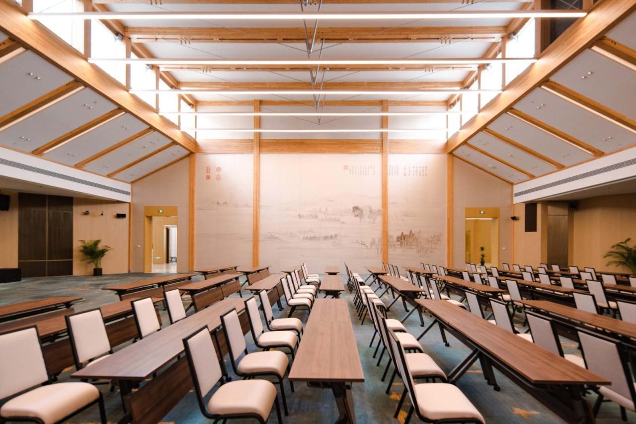 建构建筑在材料建构上传承于传统之“木”“石”,用现代木结构演绎传统之大木作。环形屋面内圈从南至北环梁逐渐高起是传统营造“举折”的现代演绎,外侧屋檐自然形成由低到高再逐渐降落的曲线,通过简单规则创造出曼妙的屋顶曲面。大会议室的建构体系是对传统穿斗抬梁式建构的现代转译,山墙壁画处的木柱穿插寓意穿斗,其间根据剖面抬升的桁架及其间架设的次梁寓意抬梁,由此形成具有传统厅堂意味的会议空间。