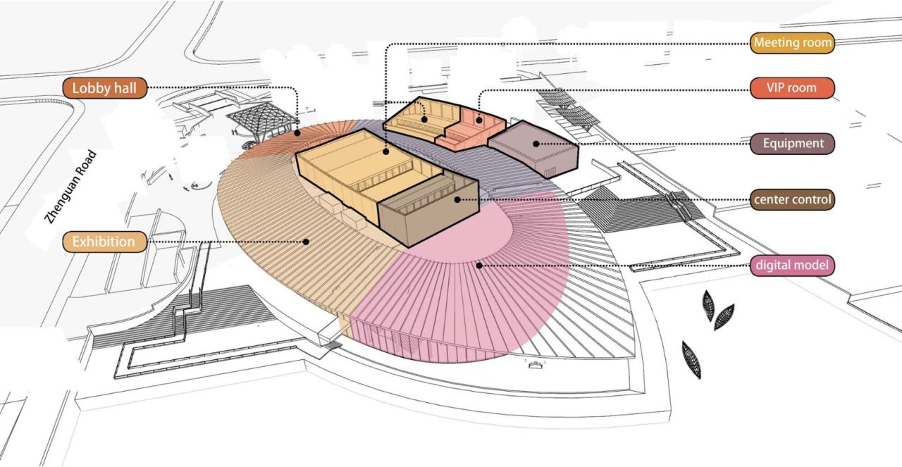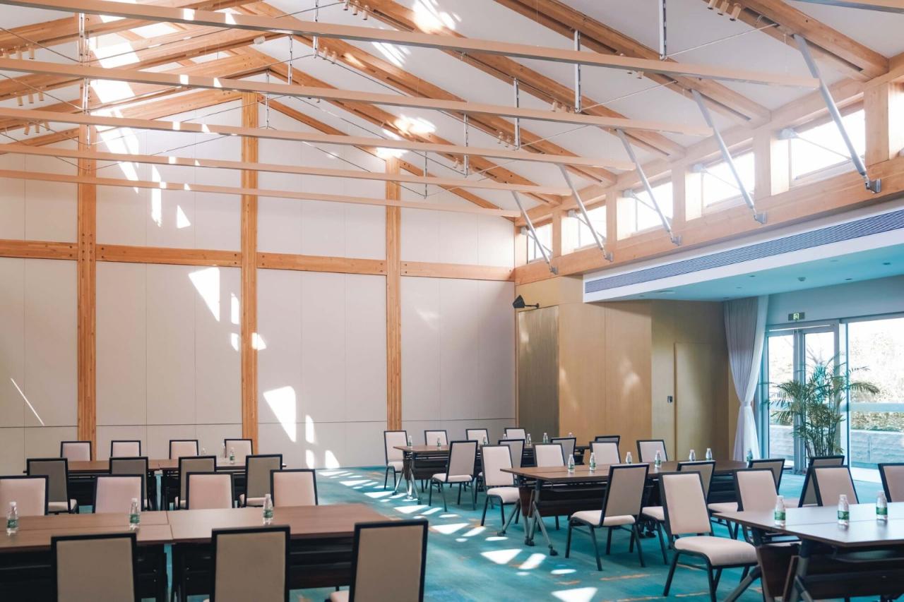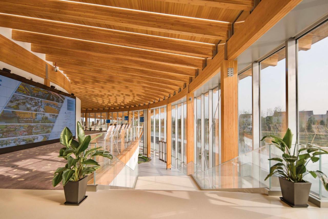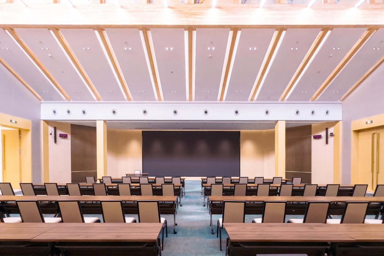 建构建筑在材料建构上传承于传统之“木”“石”,用现代木结构演绎传统之大木作。环形屋面内圈从南至北环梁逐渐高起是传统营造“举折”的现代演绎,外侧屋檐自然形成由低到高再逐渐降落的曲线,通过简单规则创造出曼妙的屋顶曲面。大会议室的建构体系是对传统穿斗抬梁式建构的现代转译,山墙壁画处的木柱穿插寓意穿斗,其间根据剖面抬升的桁架及其间架设的次梁寓意抬梁,由此形成具有传统厅堂意味的会议空间。