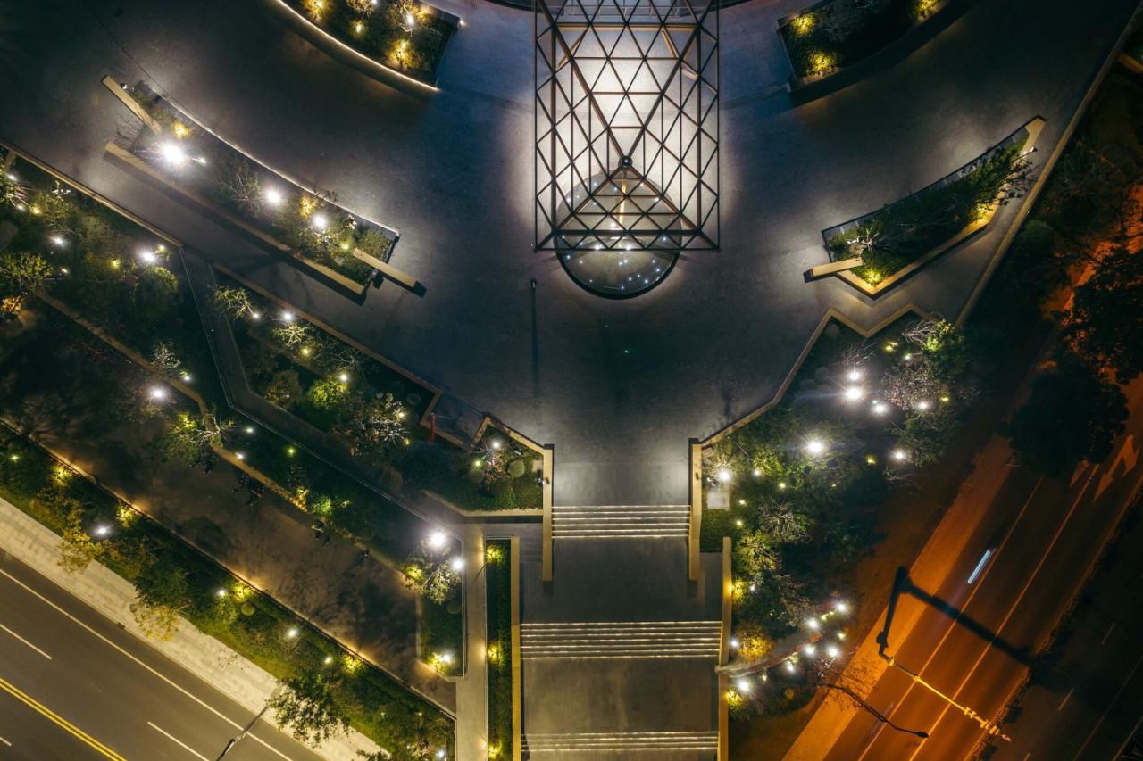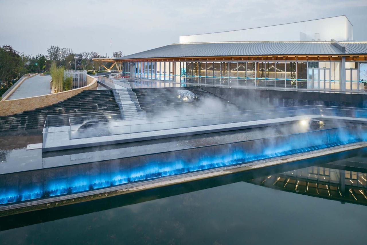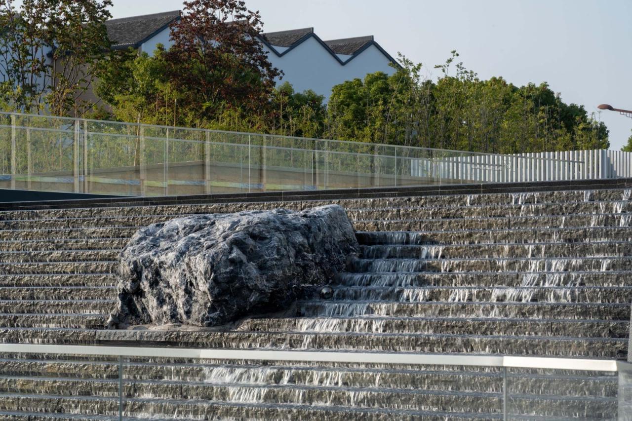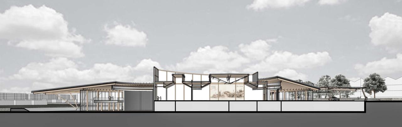 场所建筑周边场地之高低水陆关系的处置缘于传统造园“掇山理水”的传统。水是江南灵秀的源头,围绕建筑的环形水面,将建筑置于水的环抱倒映,正如西塘古镇之于水的亲合。十里港水系在建筑两侧被放大内凹,这里是古镇水口码头的再现。建筑与自然水乳交融。于平展中创造山水起伏的自然场所。大台阶跌水与自然的十里港水面融为一体,其上的三块景石演绎自传统的“一池三山”。西北角入口三段抬升的大台阶是古镇拱桥台阶的抽象,创造俯揽之势,拾级而上,多层次的绿植广场依次展开。沿轴线呈现的盛景,大台阶—大雨棚—弧面大屋顶和玻璃天窗是传统中轴秩序的体现。