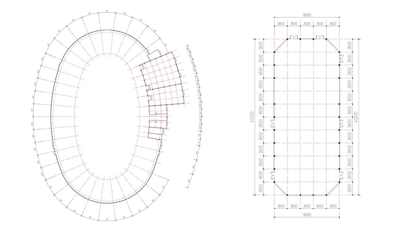 秩序环廊的建构秩序由四段两两相切且对称的圆弧控制,南北短弧9分为15°的小跨,东西长弧10分为4.5°的小跨,玻璃幕墙、金属屋面分板、屋面密肋梁排布以及小会议室三角屋架的辐射也都在此基础上进一步细分。大会议室的建构由1.8*1.8米的匀质网格衍生,12榀18米跨的钢木组合桁架横跨东西山墙,其间纵向架设1.8米间距钢木张悬梁。形成两个“凸”字行的可分合会议空间。