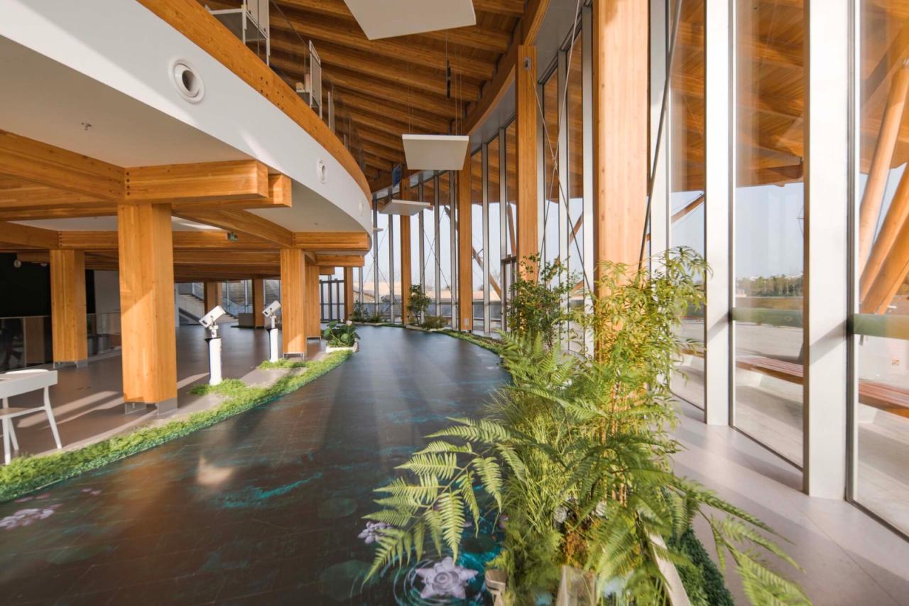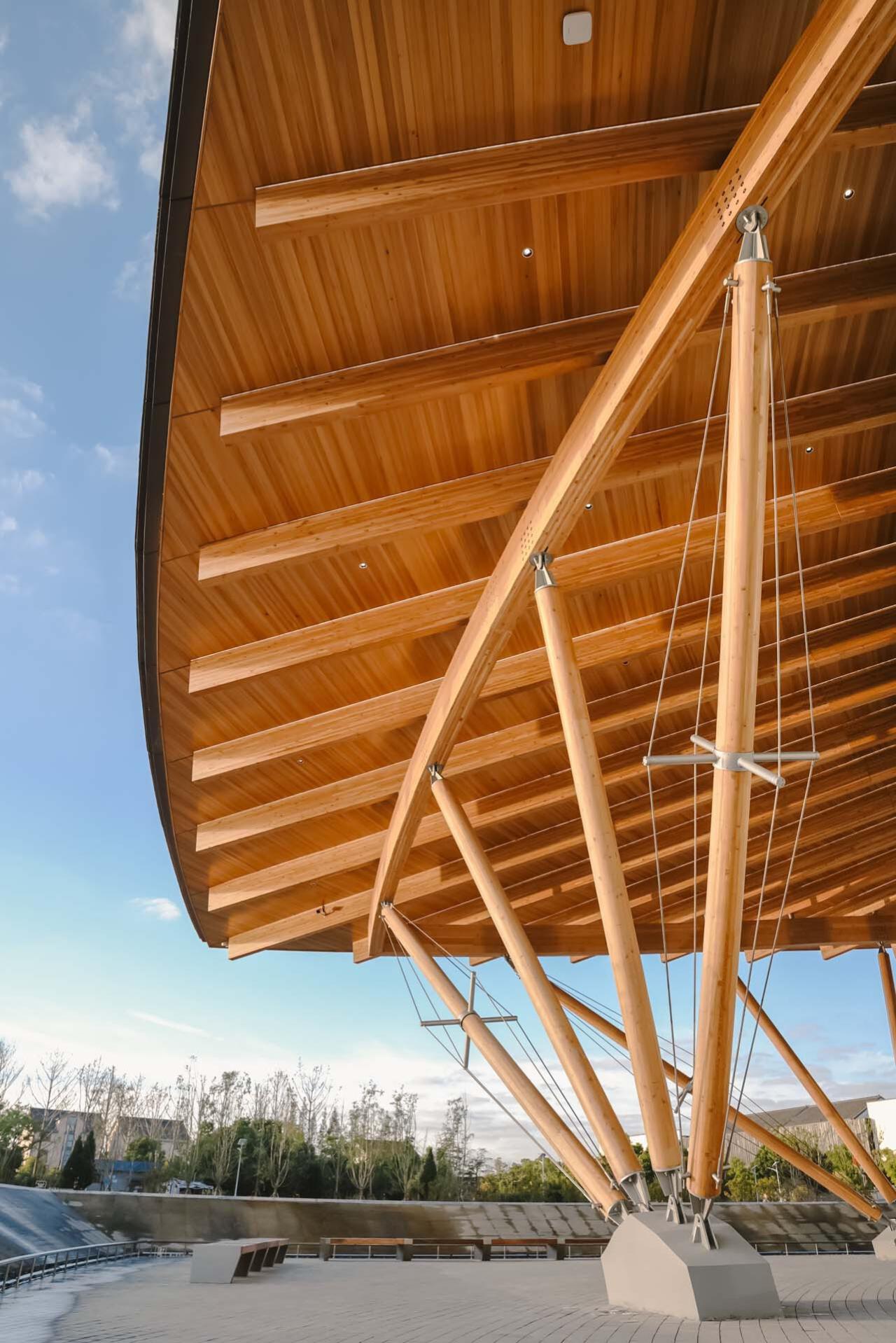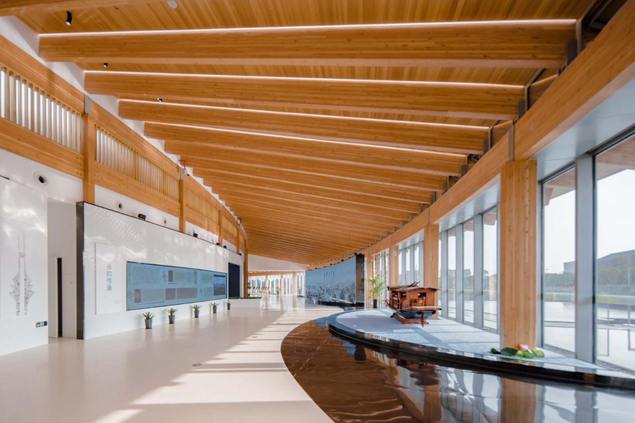空间建筑中大小会议及贵宾厅盒子的嵌入是对古镇中深宅大院民居的转译。古镇的空间结构正是由长廊环绕,穿庭入室。沿主入口环形展开的漫游渐渐引人入胜,窗外的景色从绿植到水面渐次展开,到船头却发现置身于二层,极目远眺,视线被无限伸展的屋檐进一步压低引向水面,由此拾级而下,心随镜转,豁然开朗。窗外的甲板、跌水、建筑在此刻与自然融为一体。