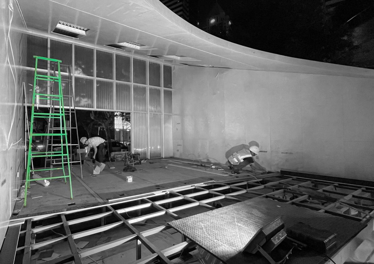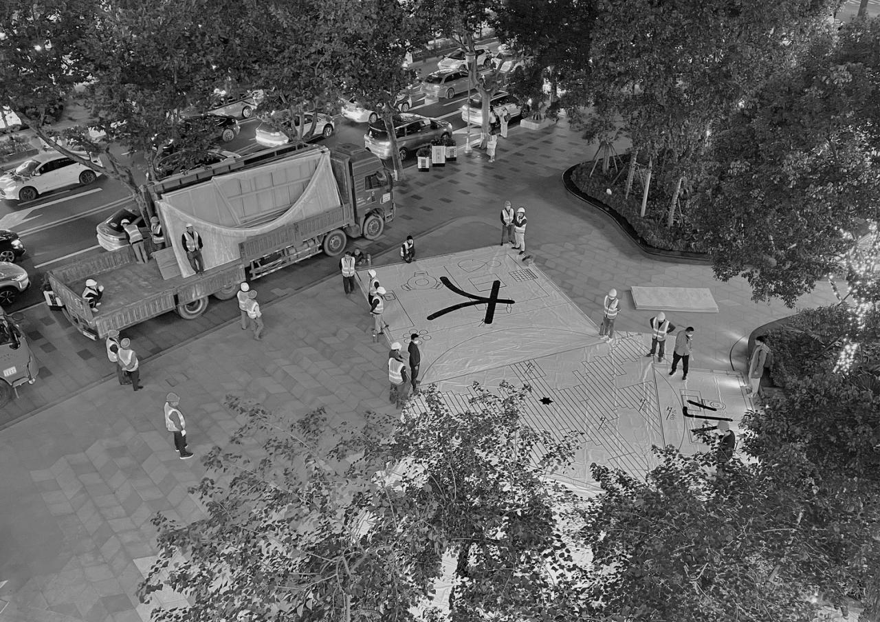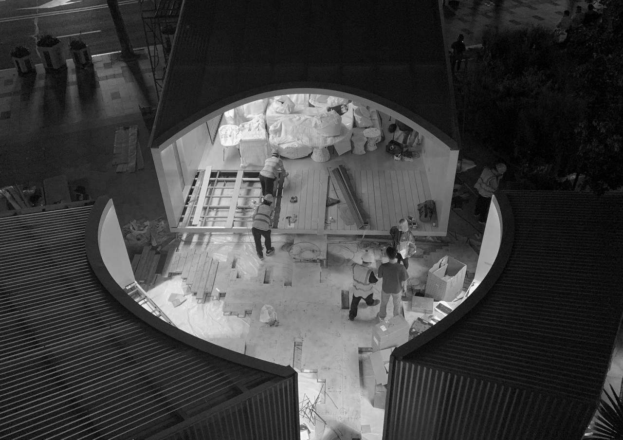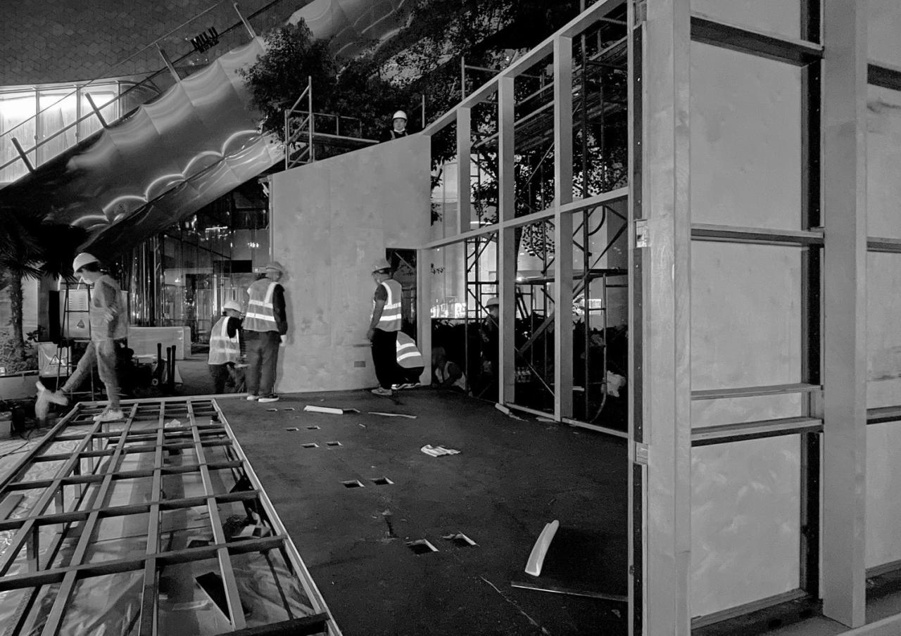 装置的搭建时间仅持续3天,且只允许在夜间作业。为此,我们与搭建方多次讨论,最终采用预制组件的方式降低了现场操作的难度。展期结束后,装置内所有的盆栽植物均又获得了二次领养,而“间园”的主要建材之一胶合板也会通过“拆除-切割-重新拼装”的方式实现“可持续”的良性循环,作为新的家具再次出现在别的生活空间里。