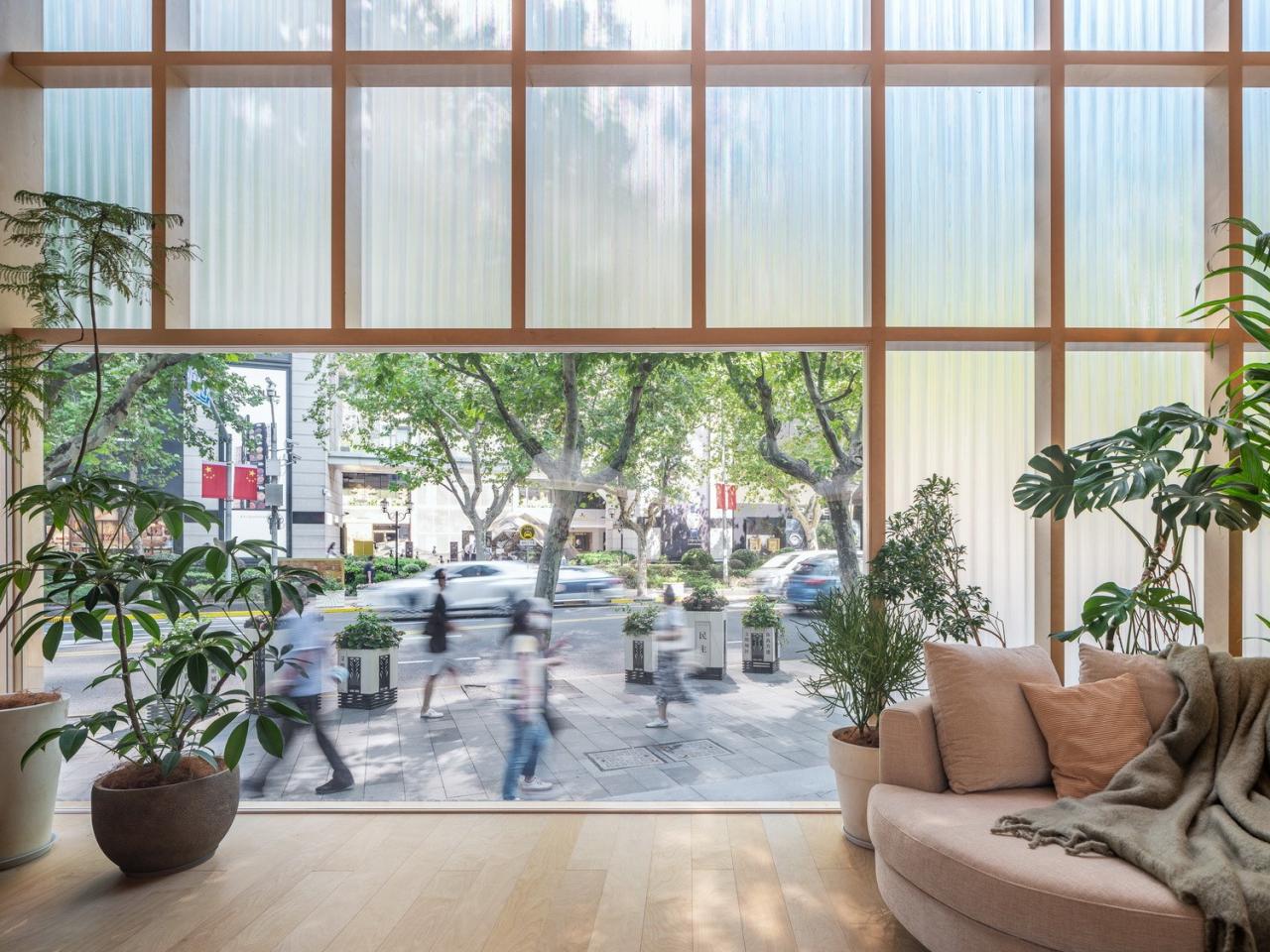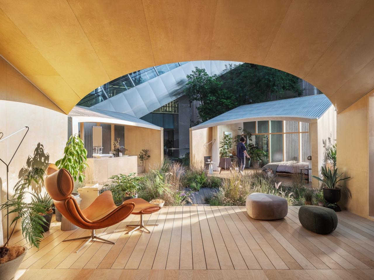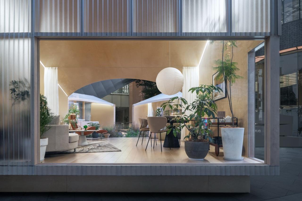 随着人们在“家”之间往来,装置微弱的边界感使自然在室内外之间流动,种类繁多的小灌木、小乔木类植物以较可控的方式栖息在屋檐下,为人带来“亲生命性”的愉悦感。室内尽可能减少了装饰性语言,让光线、植物与家具元素成为空间的主角。