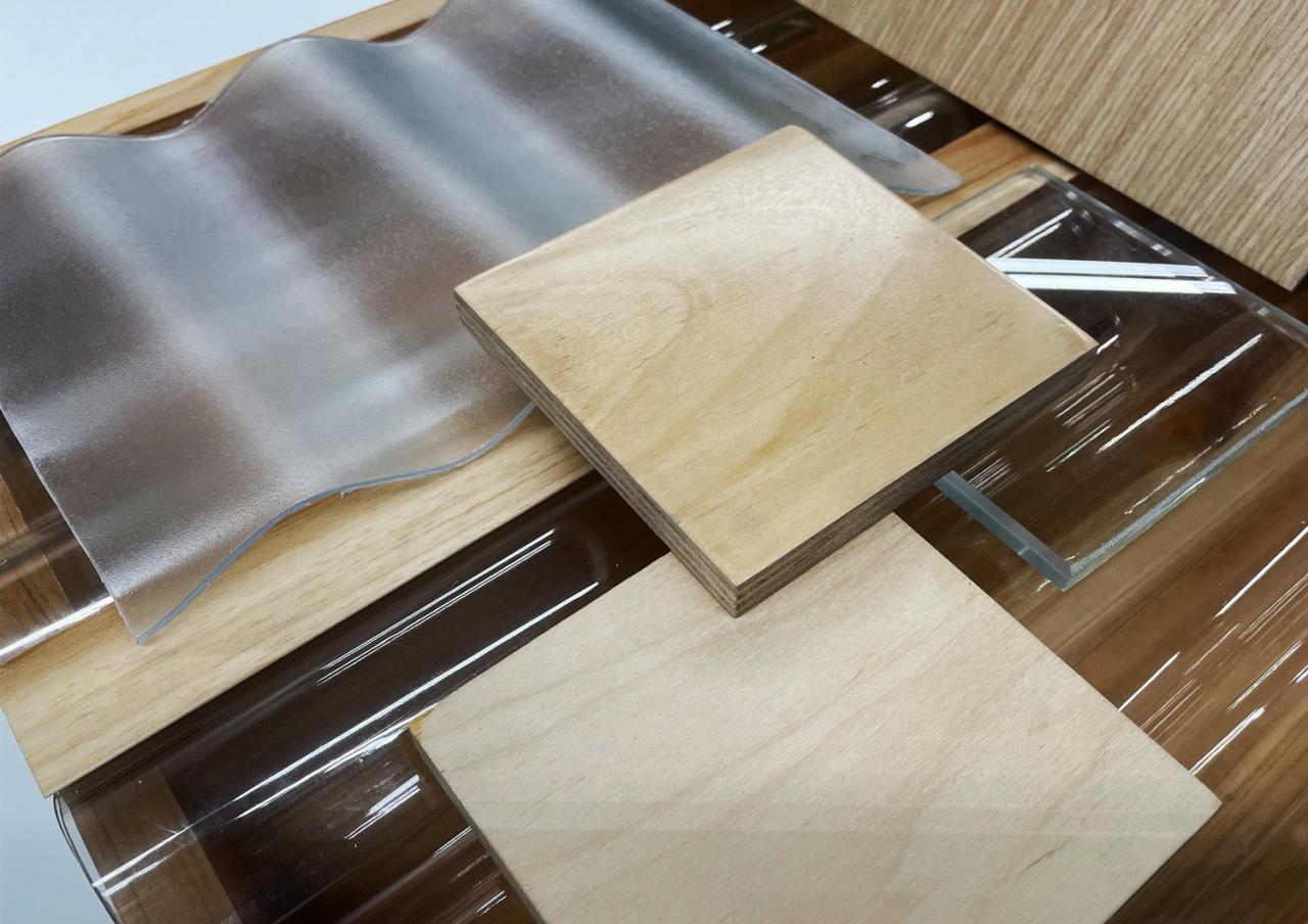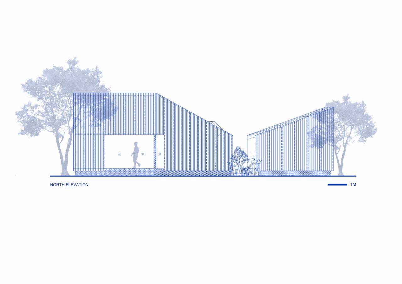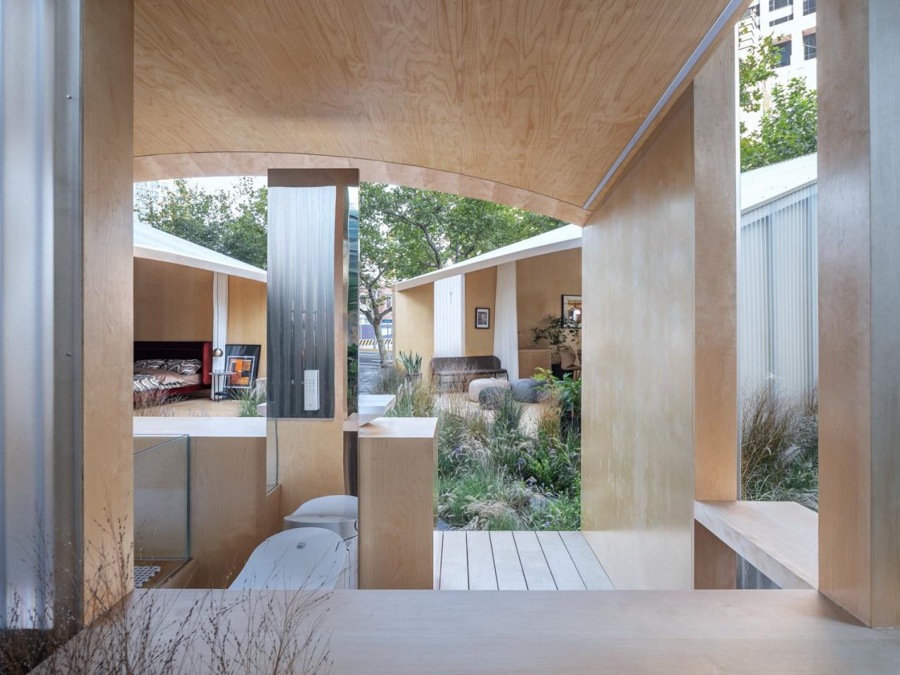 胶合木与磨砂波浪板材使装置立面呈现出两个层次内与外、实与虚的对比和融合。我们通过反向结构设计将龙骨外露,避免了内立面的繁杂,而纵向龙骨则呼应着基地周边树木的垂直生长形态。此外,三处空间在外立面的特定位置均增设窗洞,加强了局部的通透感,为室内引入更多自然光线。各组窗洞之间形成几道连续的视觉带,“家”的氛围得到释放,与植物、城市景象相互重叠,为过往“观众”带来好奇与想象。