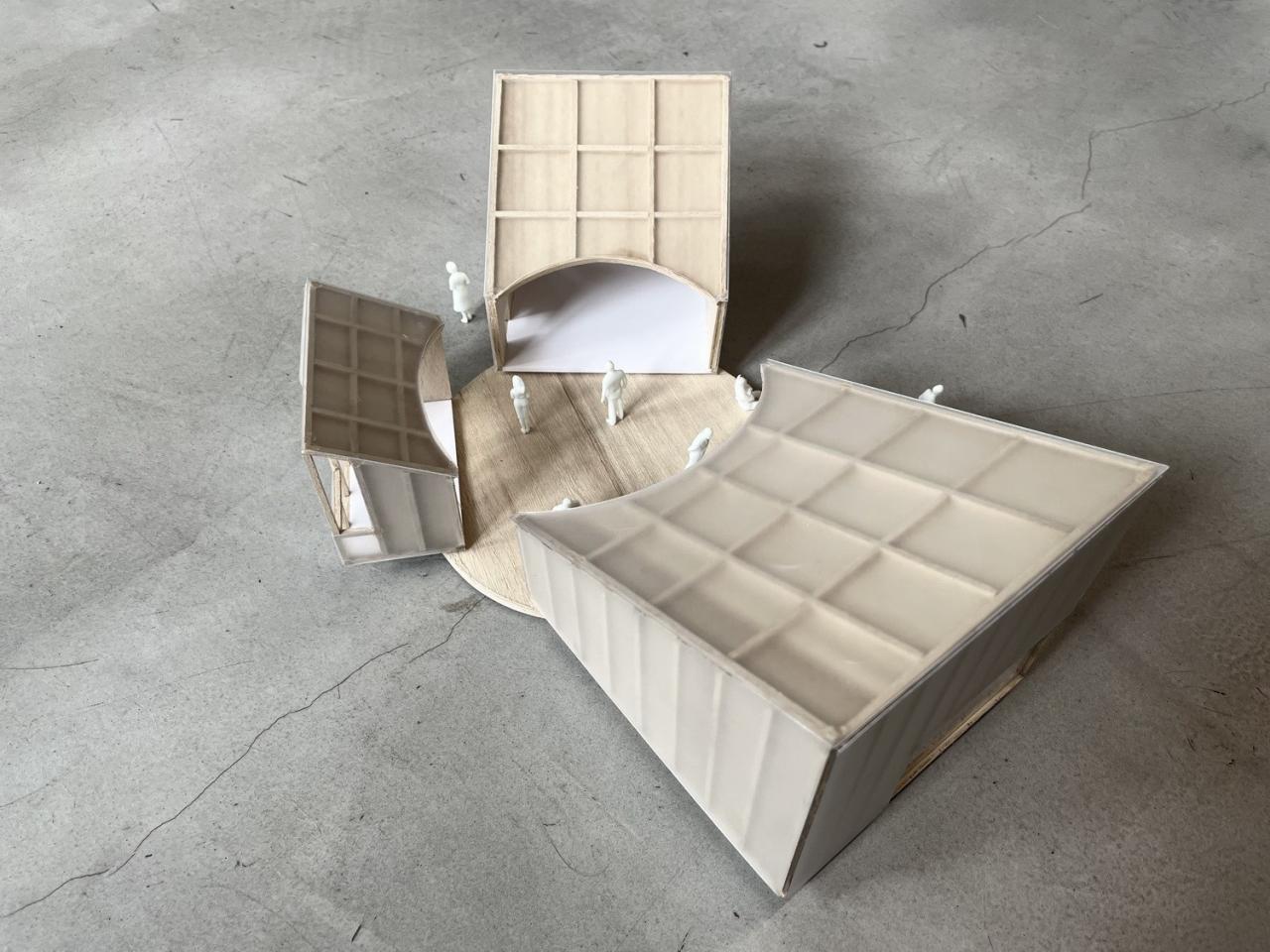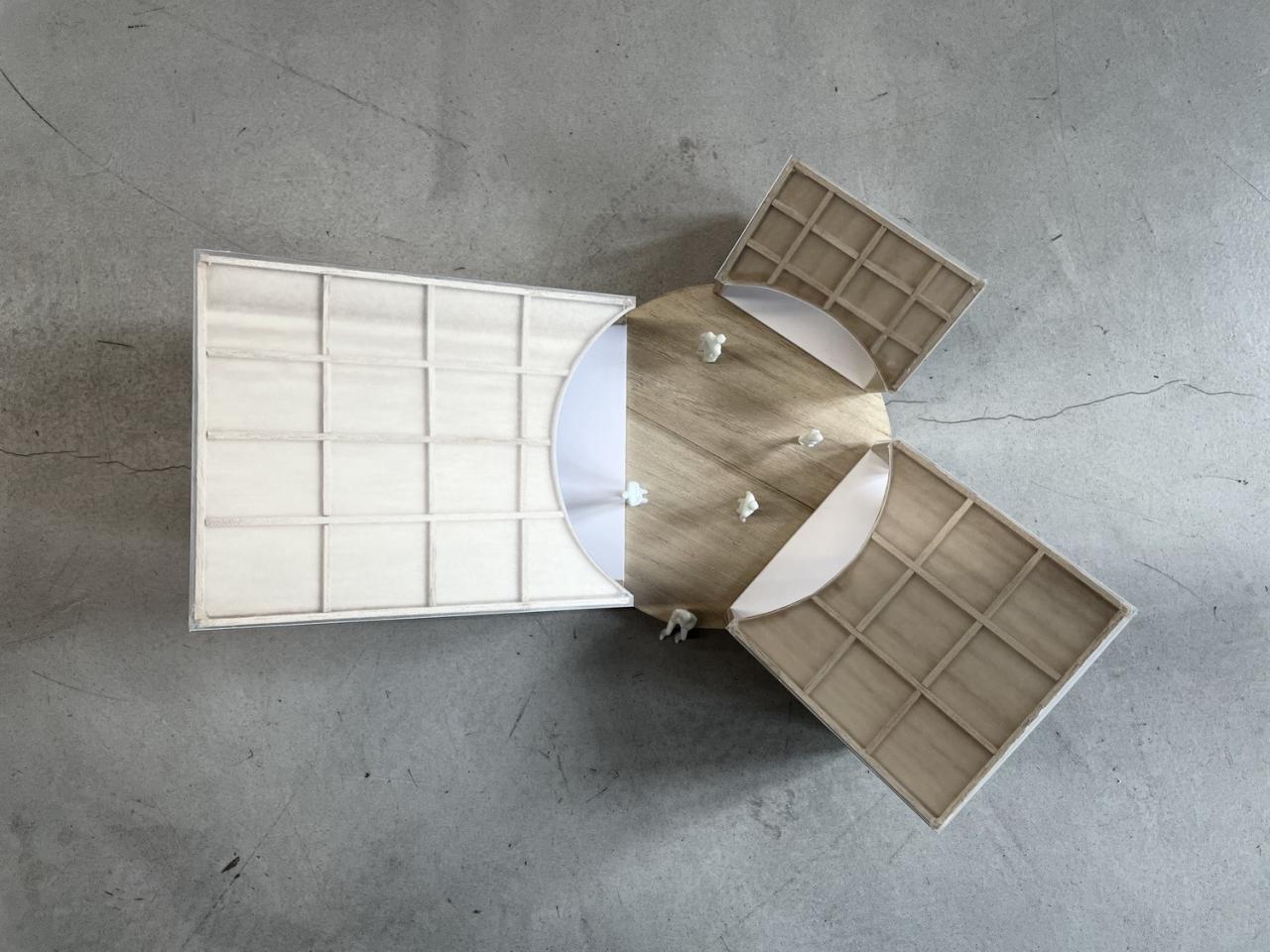 由于基地内原本就有着多条相互交叉的人行路径,建筑师便将既有动线作为切割空间的手段,划分出三个相对围合的初始体量。我们将解构后的“家”的三个基本空间:厅、室、卫分别置入其中进行重构,并随功能的不同,在面积上生出了小、中、大的差异。继而依照环境旋转角度,使其兼顾动线与沿街立面的视觉穿透性。