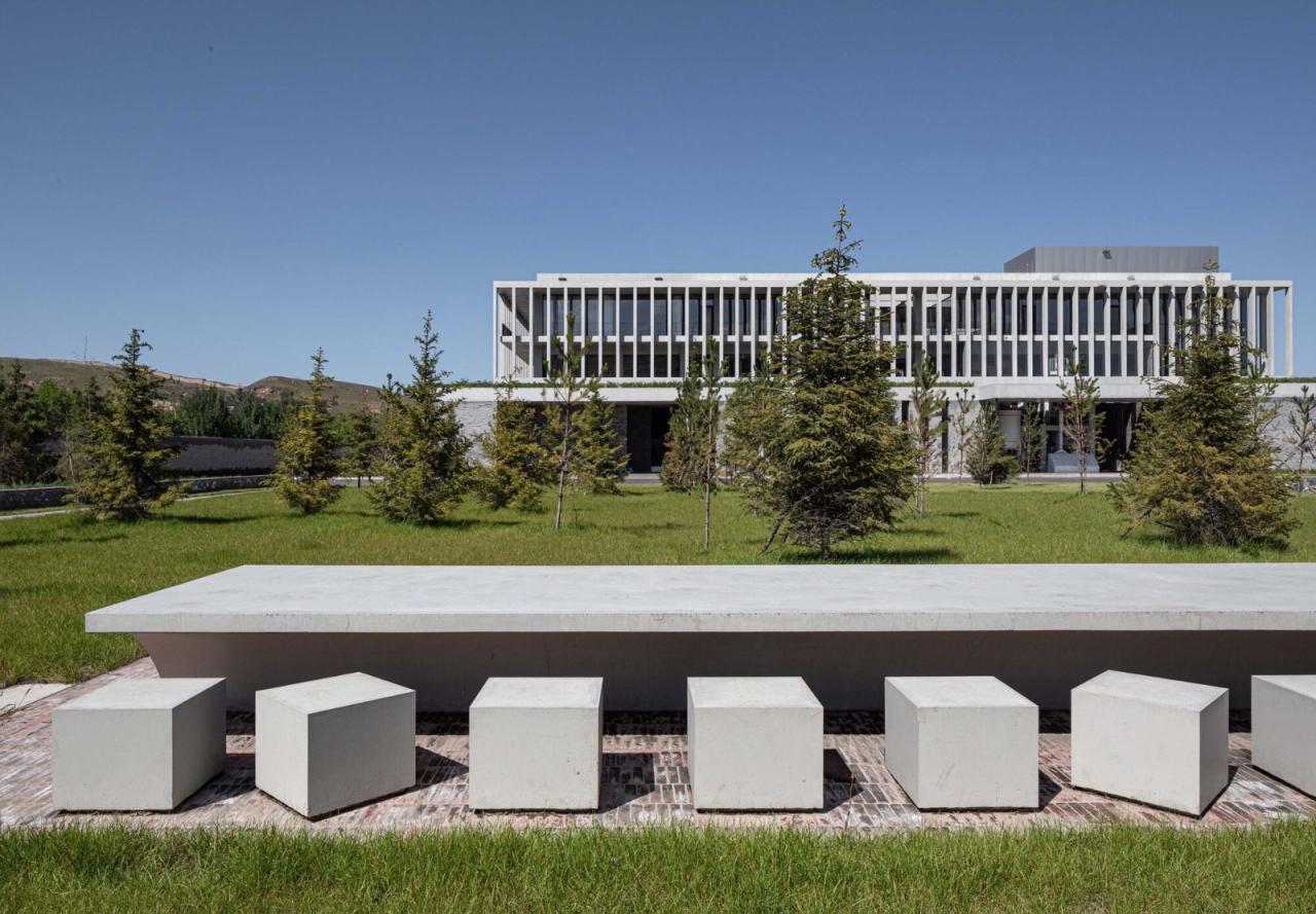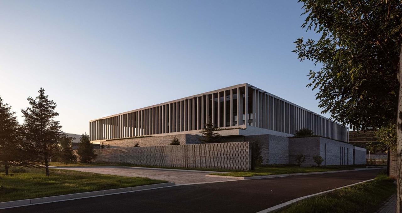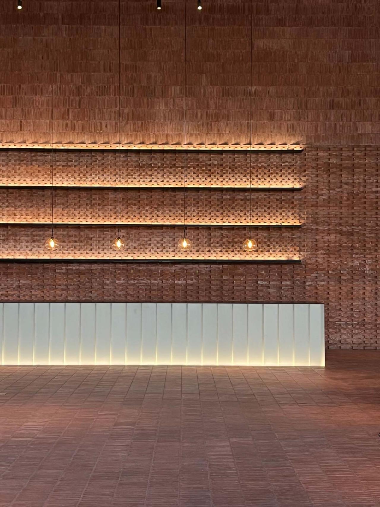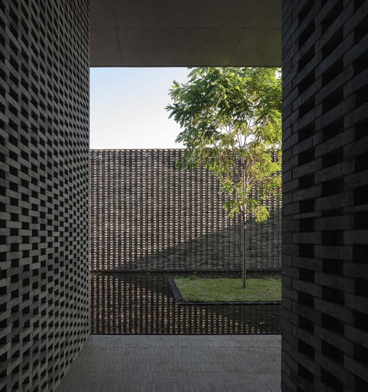 建筑材料的选择也具有很强的现实意义:使用青砖及当地的施工方法是一种与场地建立深厚关系的方式。另一方面,清水混凝土强调了建筑的现代性,并且可以使结构本身和建筑紧紧结合在一起。景观设计也完全融入到了设计过程中,屋顶收集的雨水通过现浇混凝土排水口被重新引向不同楼层的水池,使雨水的自然循环成为空间体验的一部分。水流一直顺势流到工厂的入口处,在那里汇成一道景观瀑布落下,结合12米悬空的混凝土LOGO墙,邀请参观者进入建筑。