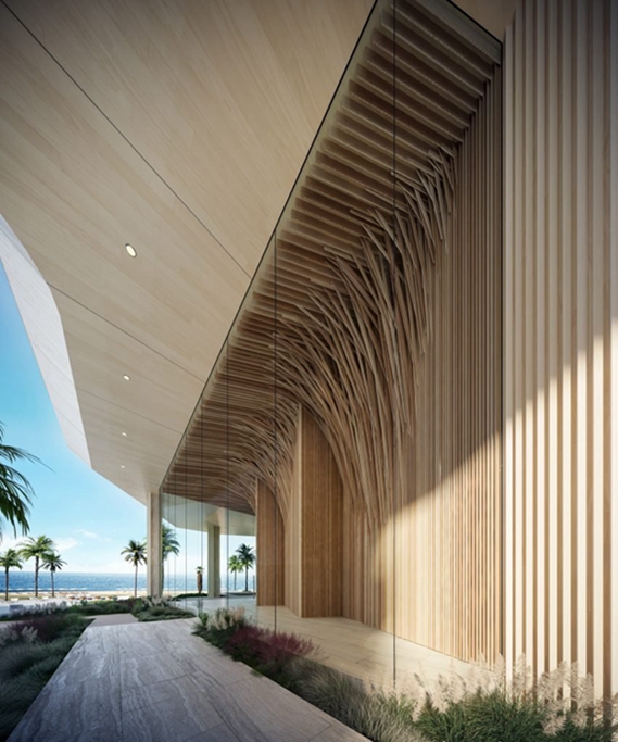 与柱子一致,木制格子将沿着立面两侧延伸,间隔成百叶窗,以延续底部的树枝状形式,同时为塔楼的玻璃提供阴影和纹理。地板的形状将是不对称的,形成一系列起伏的落地玻璃窗,其位置将允许尽可能多的海滩景观。地板将是超薄的,建筑工作室将每一块都称为“刀刃板”。建筑单元中的每个公寓都将有一个露台,结构朝顶部逐渐变细,在15楼形成一个稍大的露台。住宅的内部将包括更多参考日本材料,包括纸和屏风,以及带有水疗设施的宽敞浴室。该设计包括两栋建筑之间的外部景观,其中一个下沉的水池嵌入花园周围的石板中。