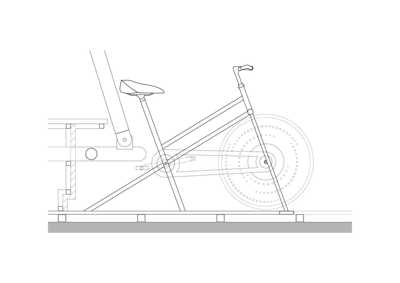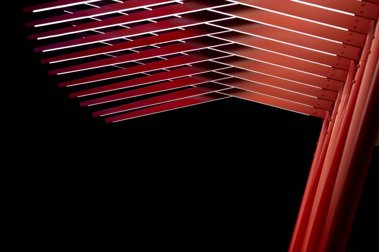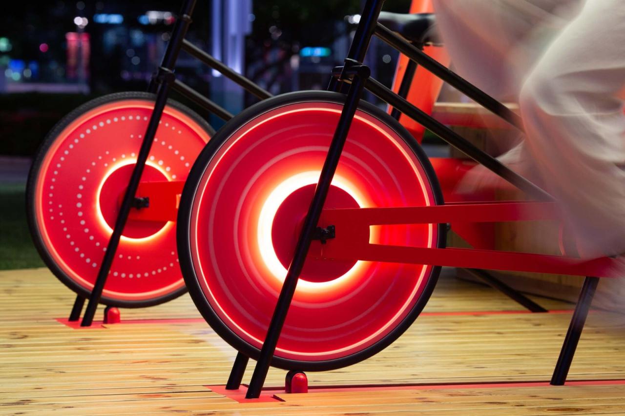 参观者踏上单车轮子带动机翼缓缓的上下拍动。泛红色的线条交错,散合有序,驱使参观者坚持脚步,咬紧牙关地振翅飞翔。