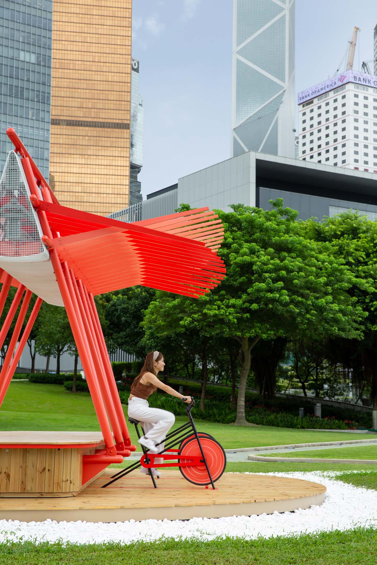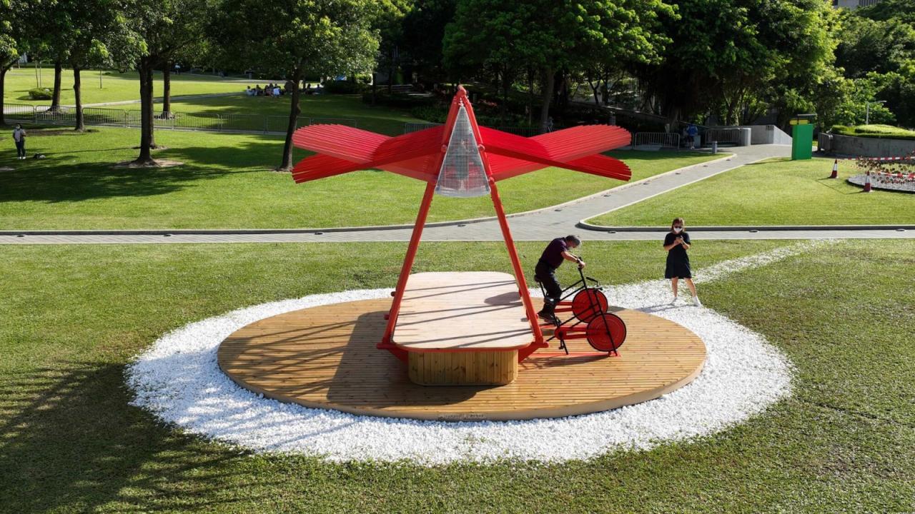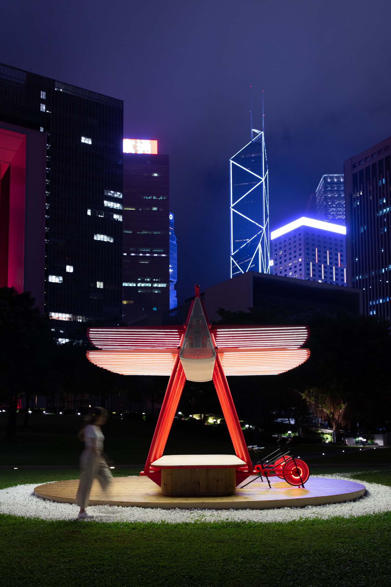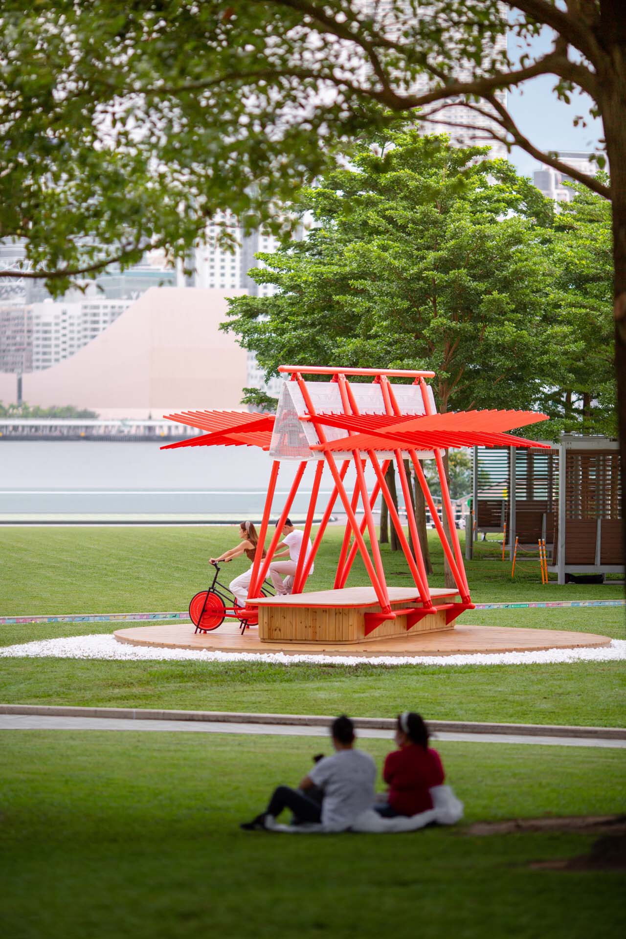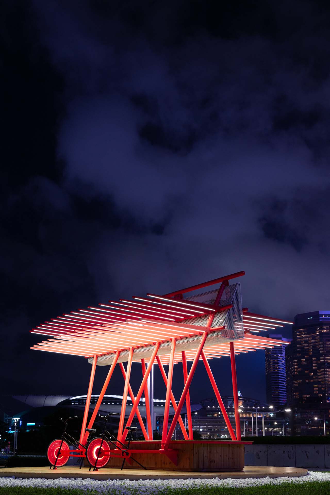 此艺术装置的灵感启发自它们的机械原理,一对双层的飞机翅膀与单车装置,伫立在草地中央,透过婆娑光影,营造出遮荫的公共空间。