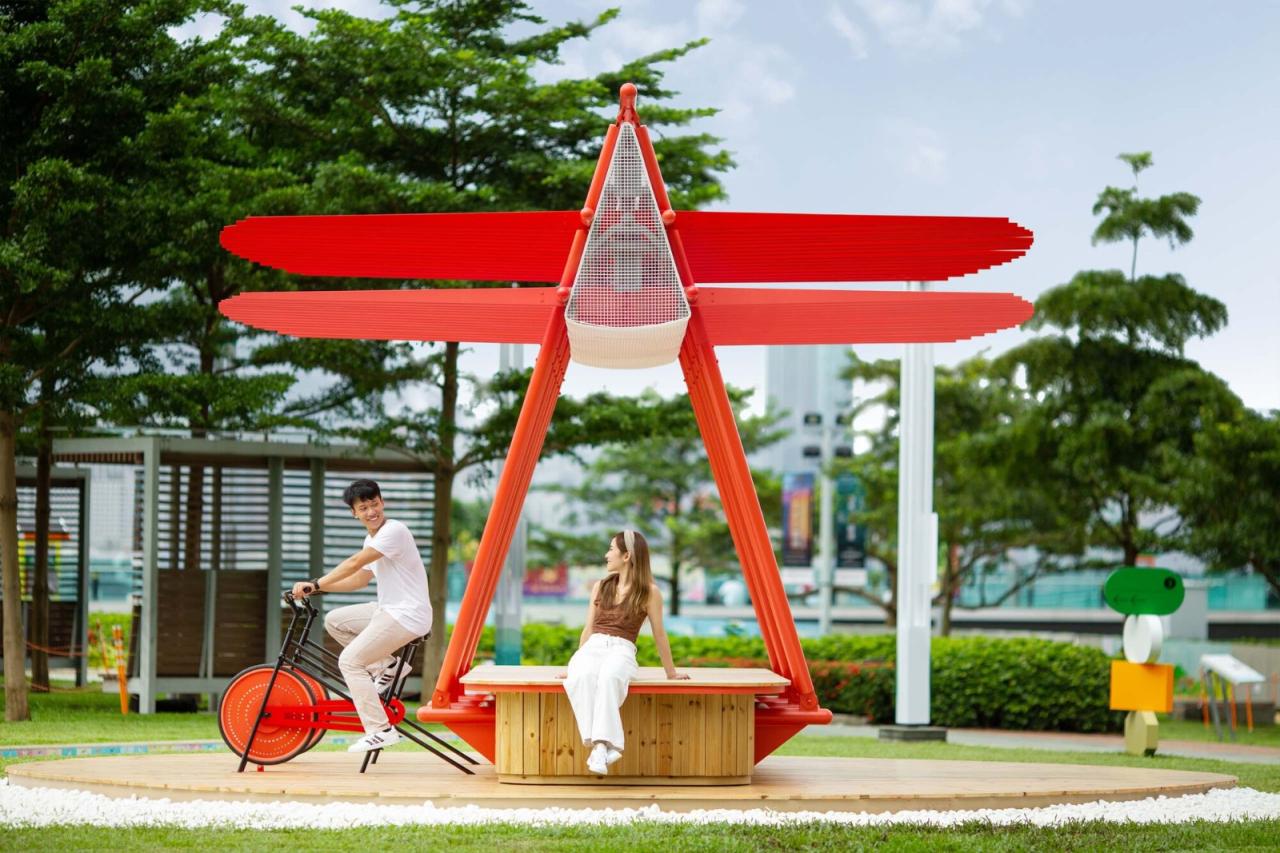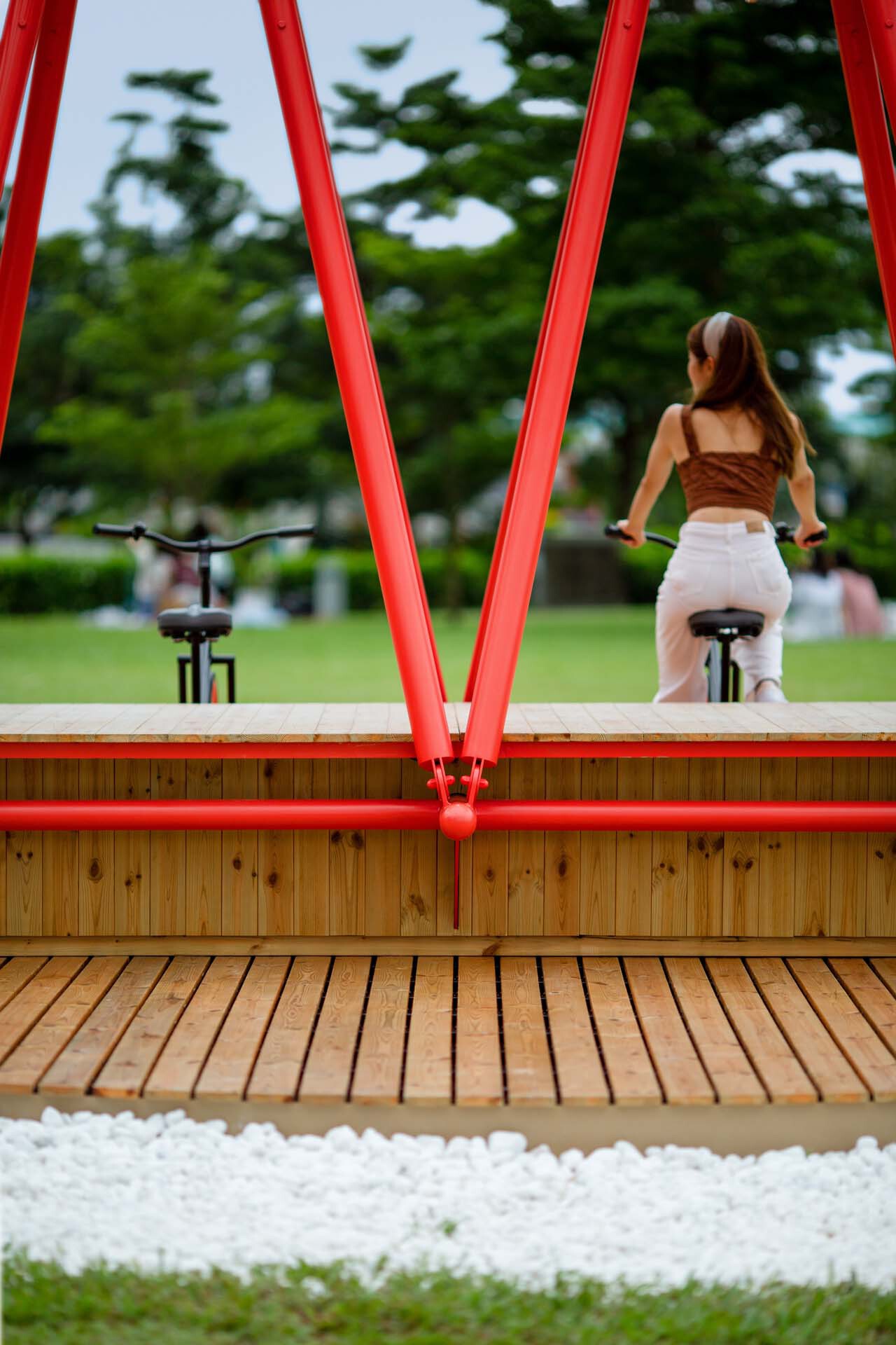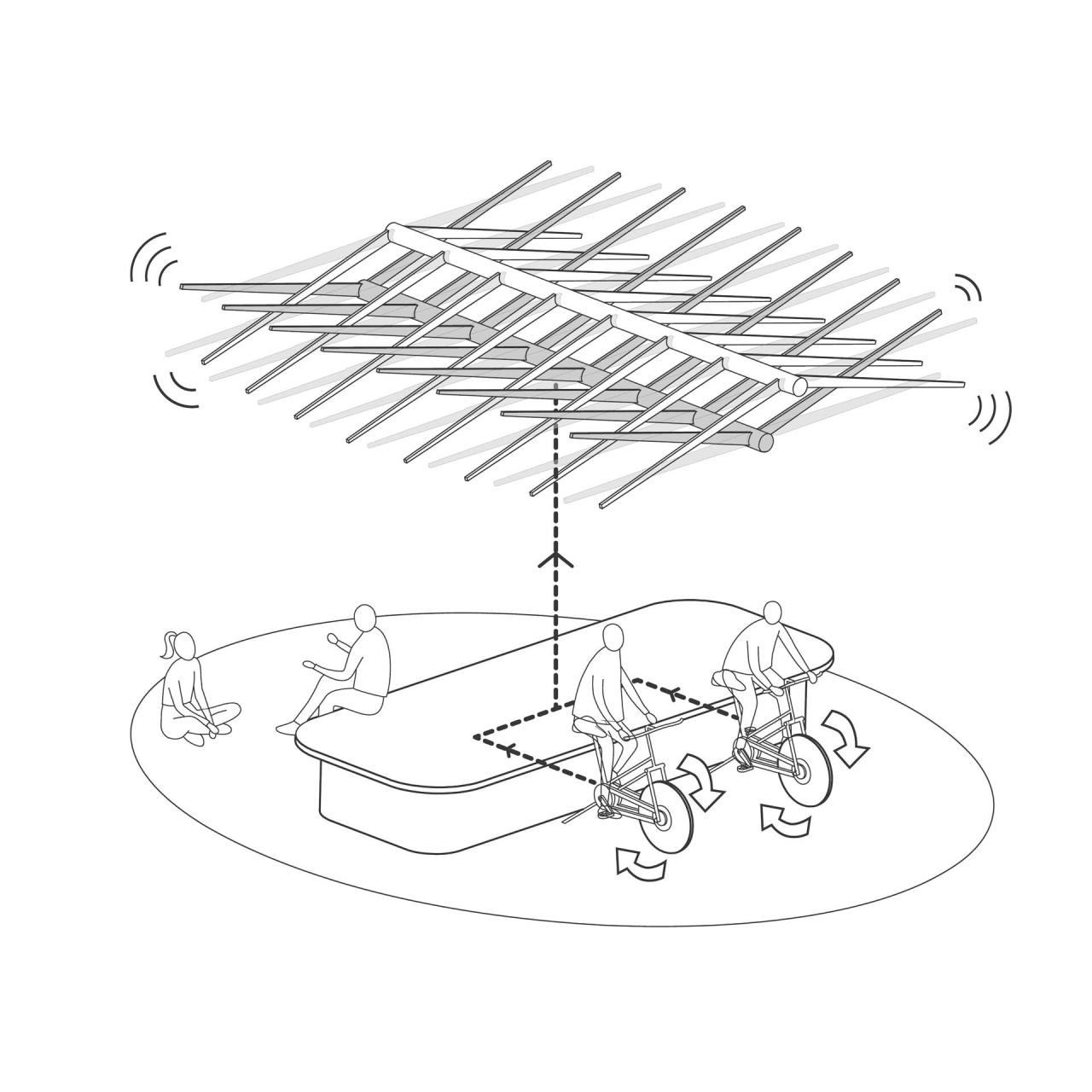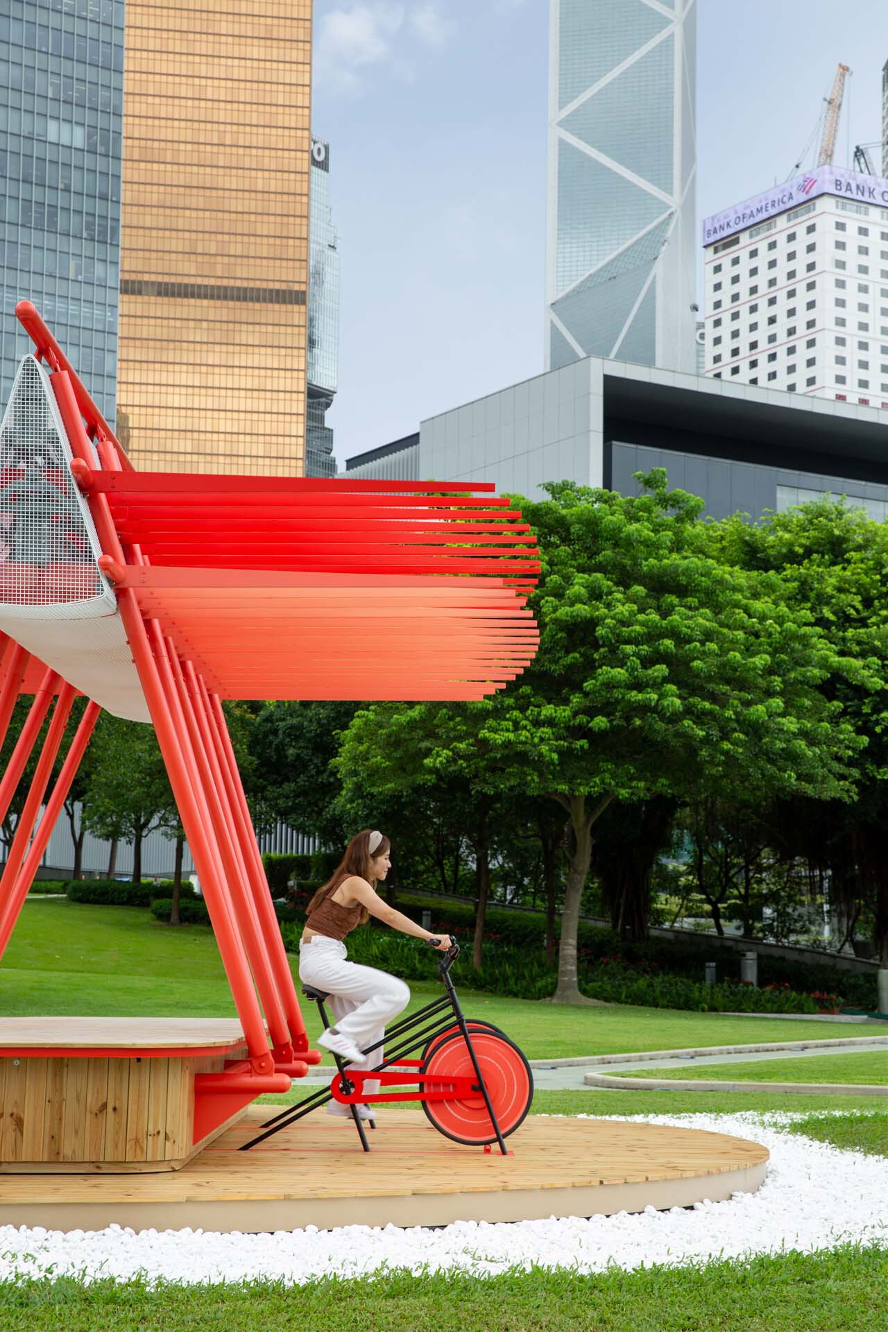 此艺术装置的灵感启发自它们的机械原理,一对双层的飞机翅膀与单车装置,伫立在草地中央,透过婆娑光影,营造出遮荫的公共空间。