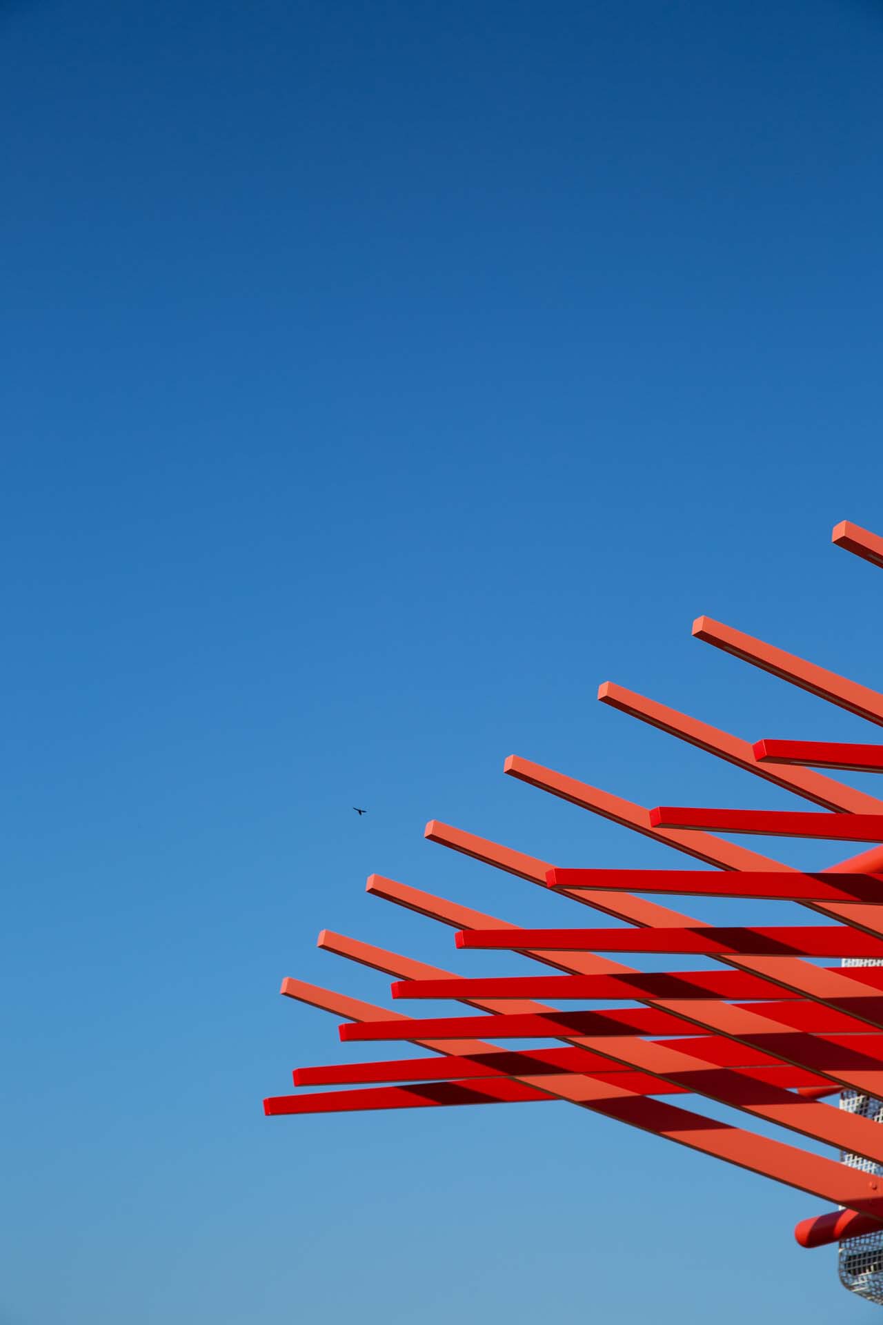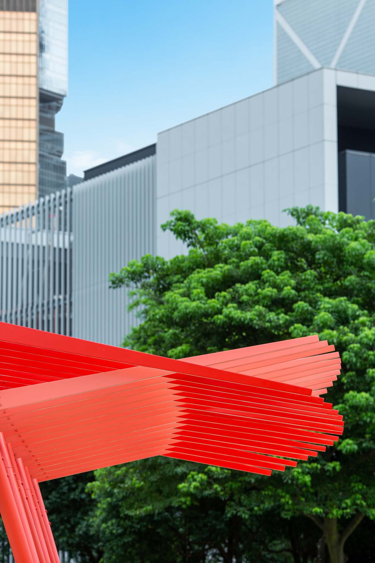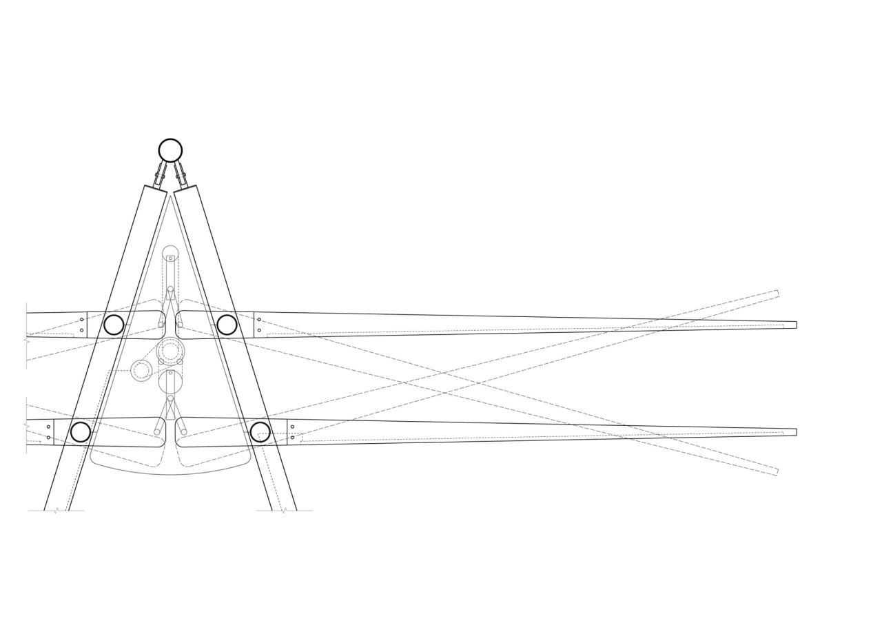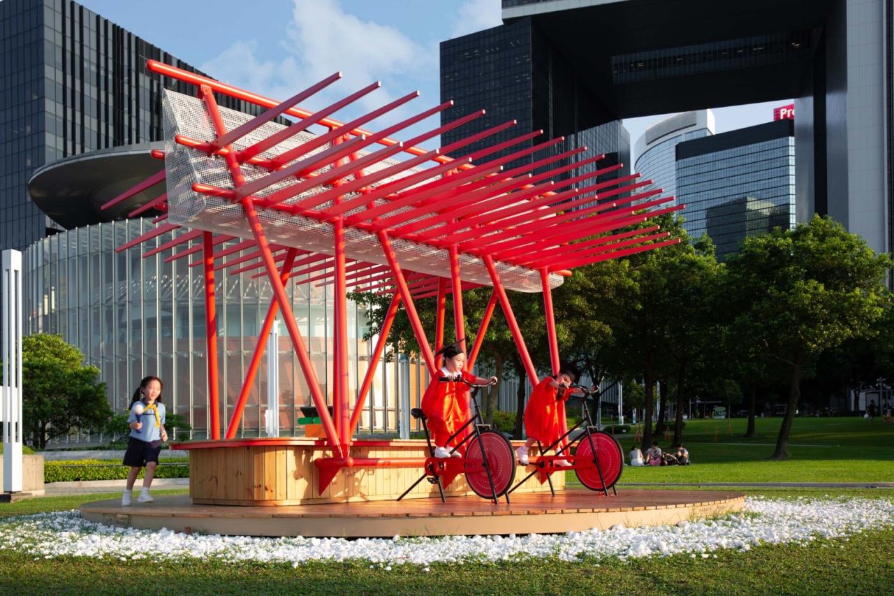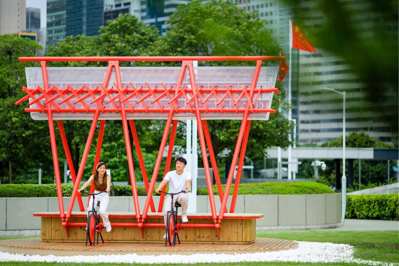此艺术装置的灵感启发自它们的机械原理,一对双层的飞机翅膀与单车装置,伫立在草地中央,透过婆娑光影,营造出遮荫的公共空间。