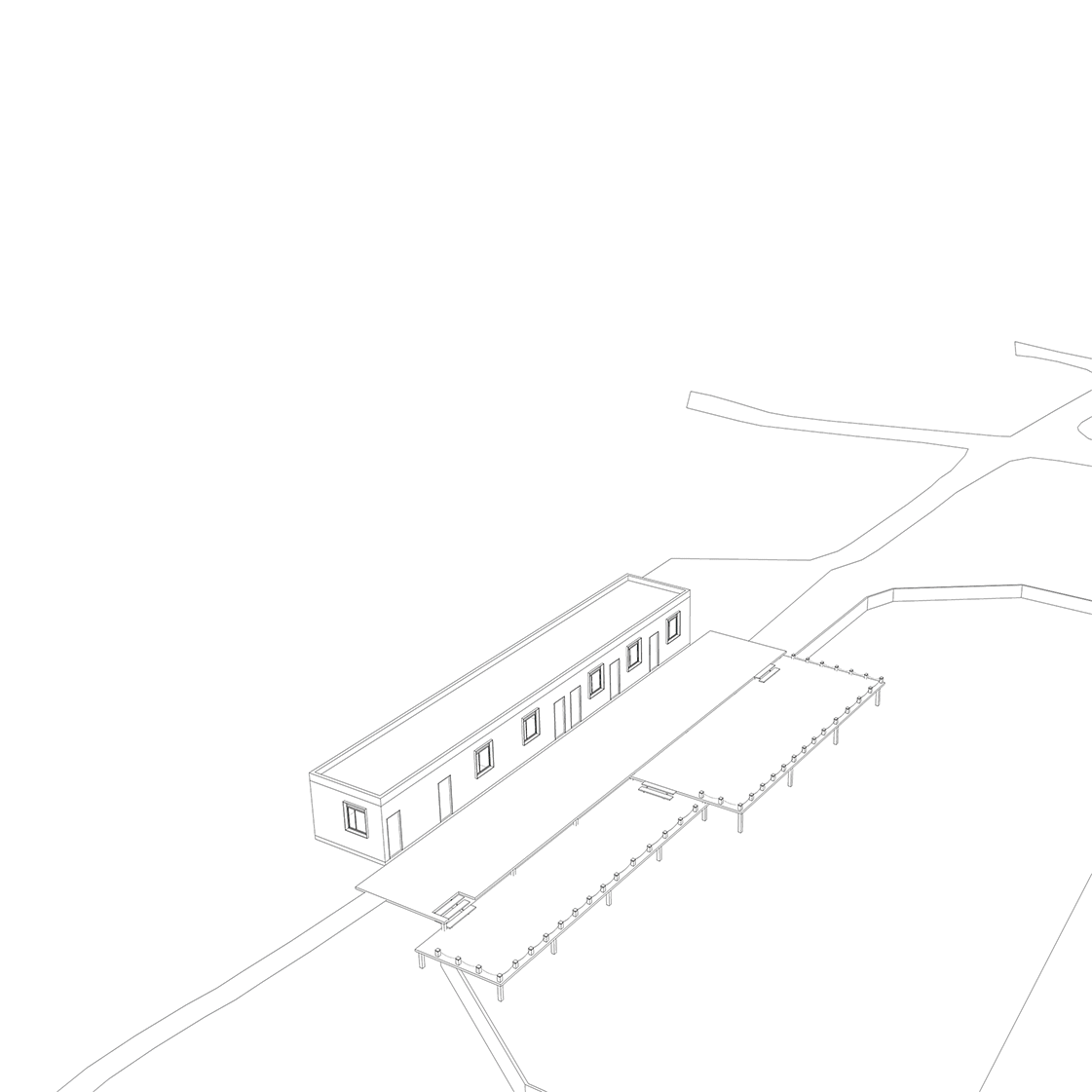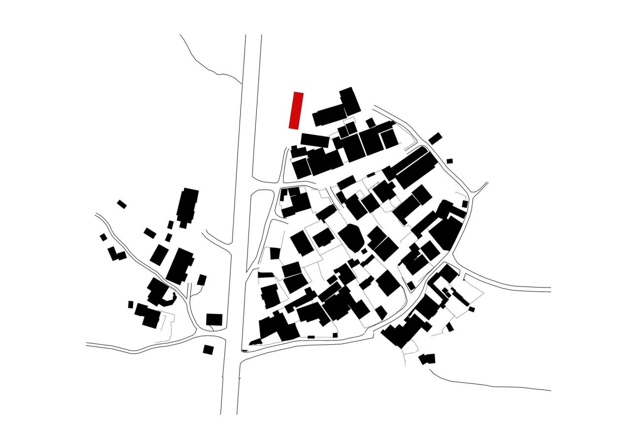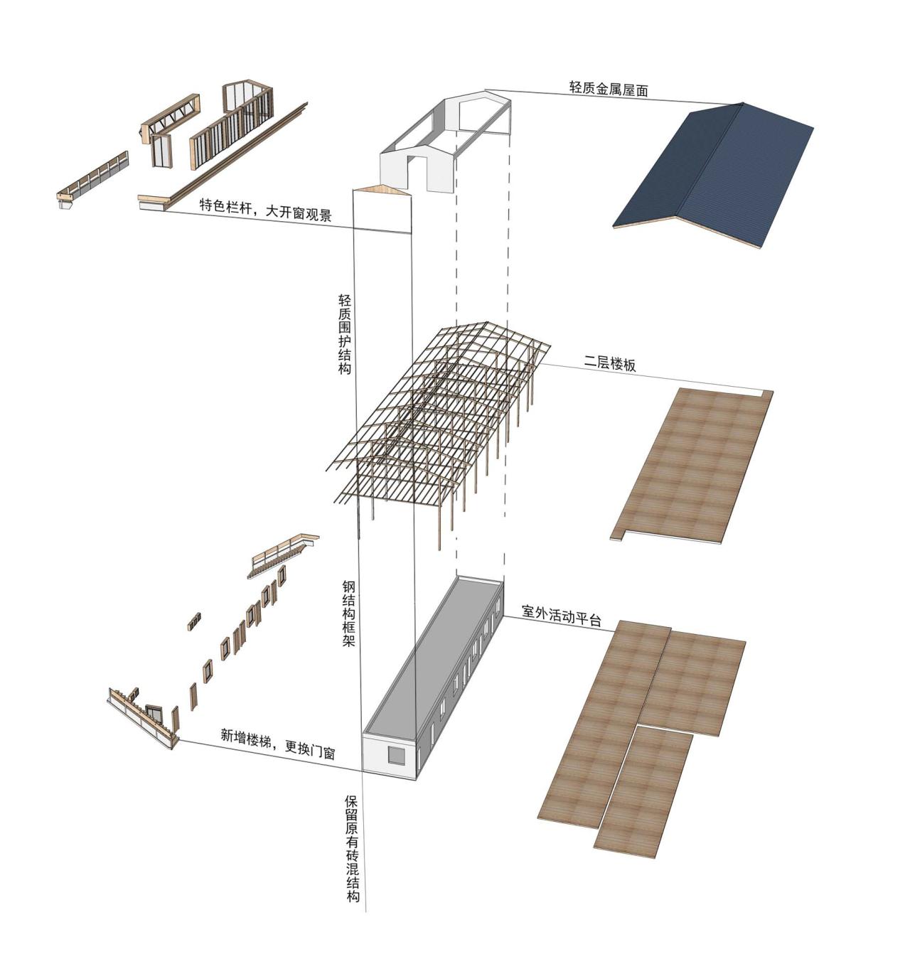 减少干预直接套建原建筑为一层平房,砖混结构,被村里弃置在村口,仅作为仓库,堆砌杂物之用。由于基础薄弱,在原始数据缺失的情况下,决定采用低干预、重新构建结构体系的手法进行改造。设计介入后,最低程度干预原建筑,再套建第二层,如此一来看似为两层的建筑,其实是由两个独立的建筑结构体系构成。为了确保结构安全性,一层墙段全部保留,仅做门窗更新。二层的加建作为一种新构筑,选择了极为轻盈的小型钢结构与板材墙、屋面进行建构。