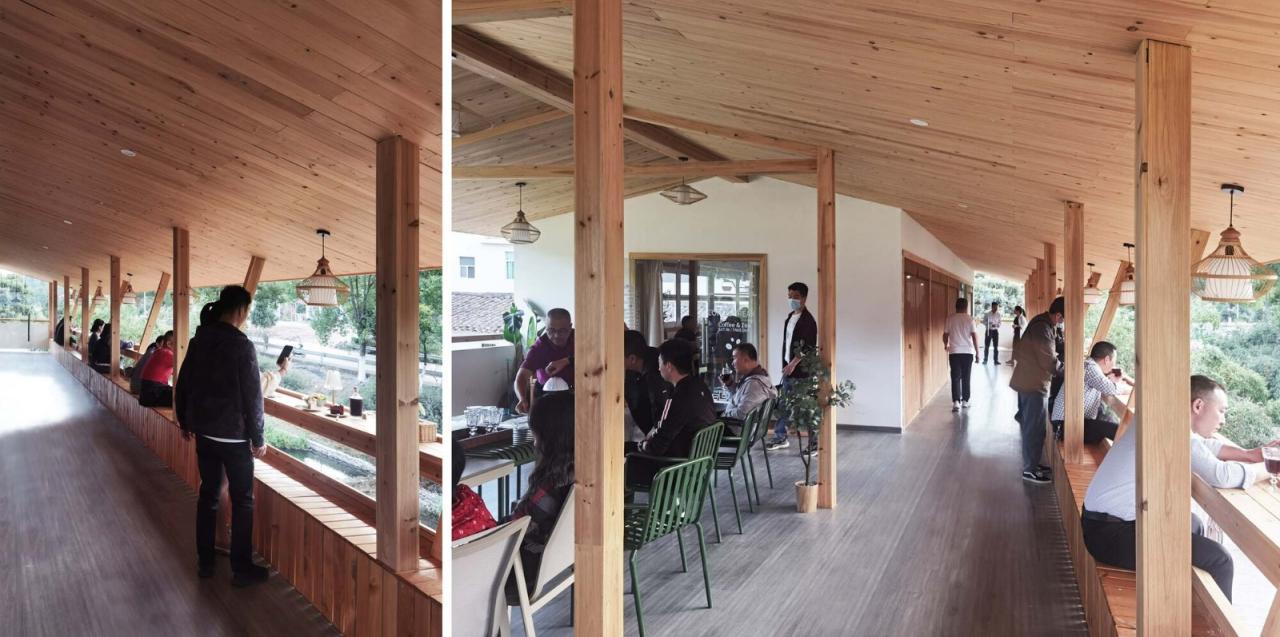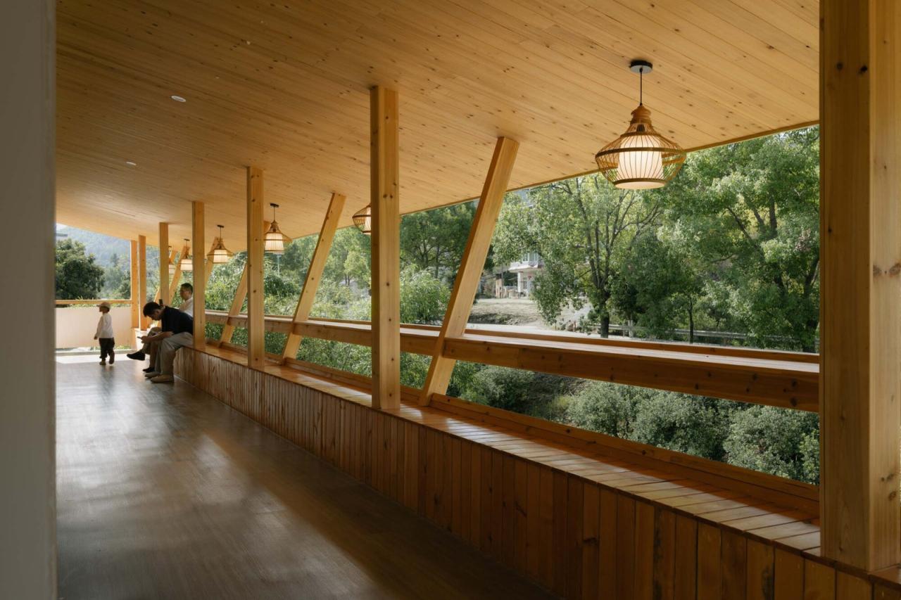 驿站与路对话因贴临国道,来往车辆川流不息,沿路面设计为可向外悬坐的长排美人靠座椅,实现动与静的碰撞:“你在驿站看车流,车流中的人在旅途中看你”。由建筑形态的存在来引导人的行为,让村民或游客都能自发的产生悬挂而坐并与道路互动的场景,体现了瑶理田园驿站作为乡村活化再造的实践具有很强的成效性。原本冷清寂静的瑶理村组如今成为不少市民的郊游首选,改造后的瑶理田园驿站产生巨大的内生动力,这份独特的吸引力,使得驿站的场所精神油然而生,这是为瑶理以及更广泛的福建南平邵武带来的乡村礼物,也是让更多人认识乡村,进入乡村的窗口,并且极具温度。