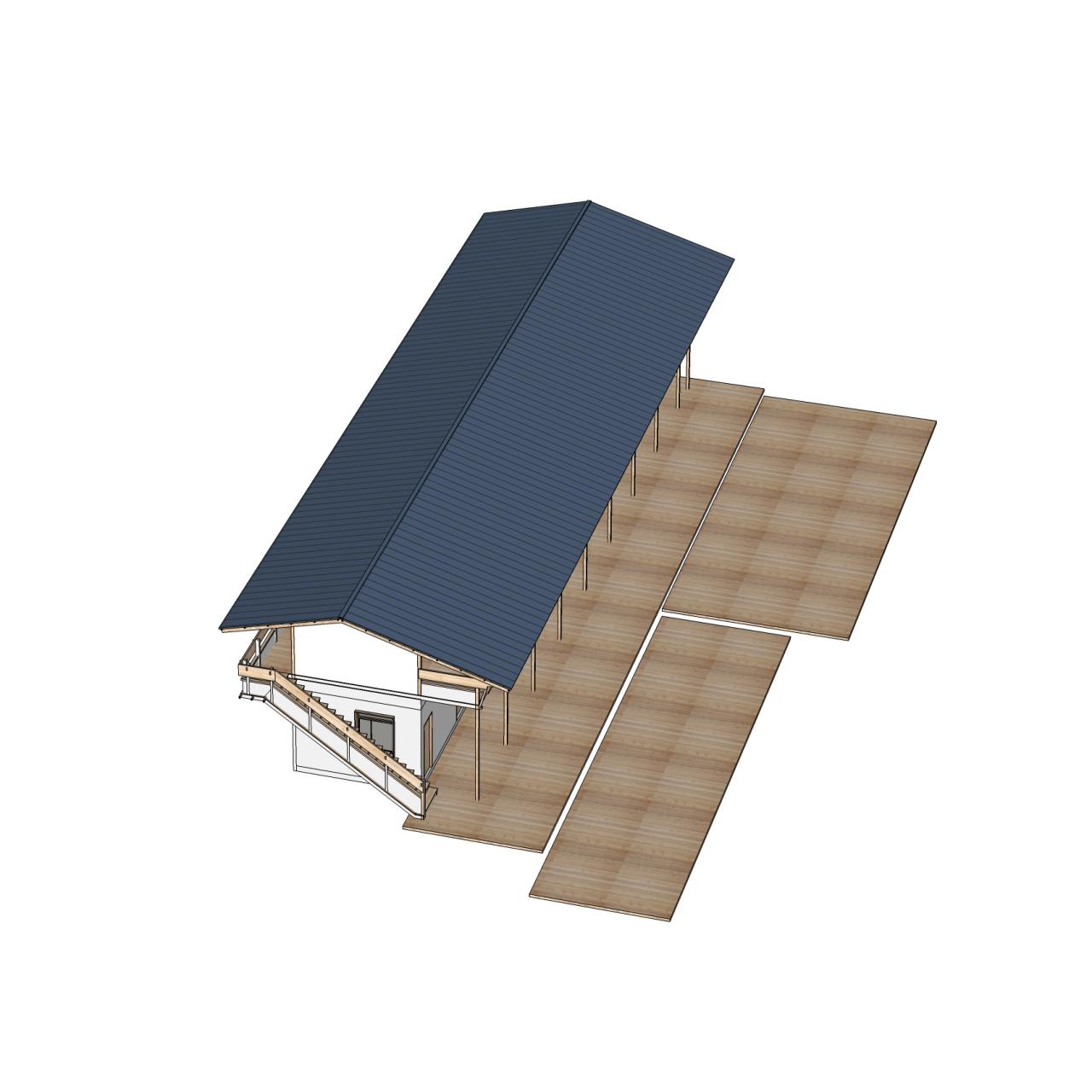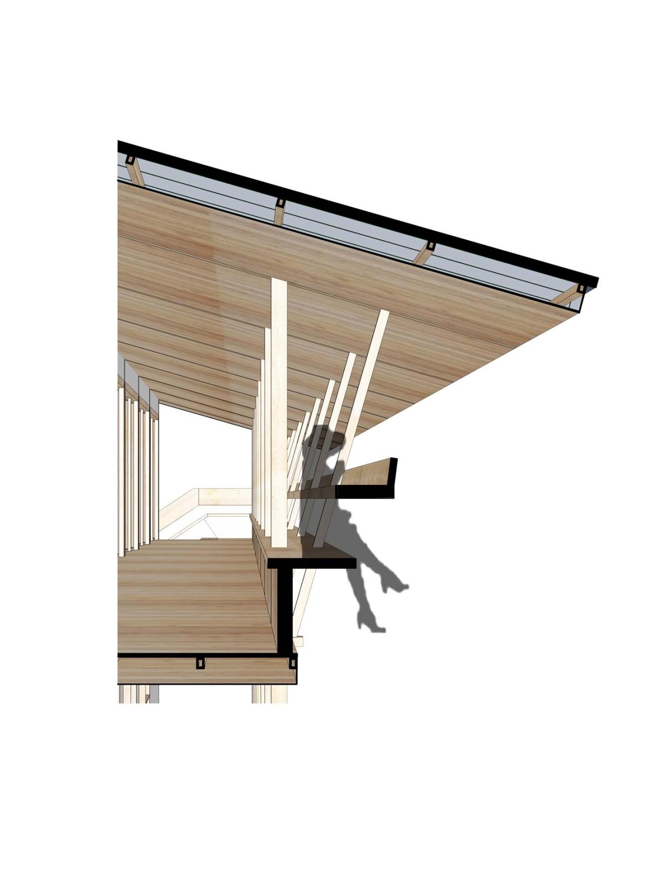 在地性的材质选用建筑呈现极其轻盈甚至略显“脆弱”的体积质感,但这种建构倾向也是设计的刻意而为,在功能上它不仅有利于对原建筑的保留,在语言上更是来自闽北乡村的众多自发搭建的屋顶雨棚。这类雨棚的主要特征就是轻薄、扁平以及清晰的建构逻辑。村民原本就是将其作为建筑改造、扩建、活用的一种最廉价最普通以及最易于操作的材料。设计将这种轻盈的建构转化为驿站的改造逻辑,选择扁平屋面,隐藏大部分的屋面底部结构,营造薄却深远的挑檐,使得整个建筑加建犹如一个大型凉棚,通过几根极细的立杆,支棱在村口的田野间。