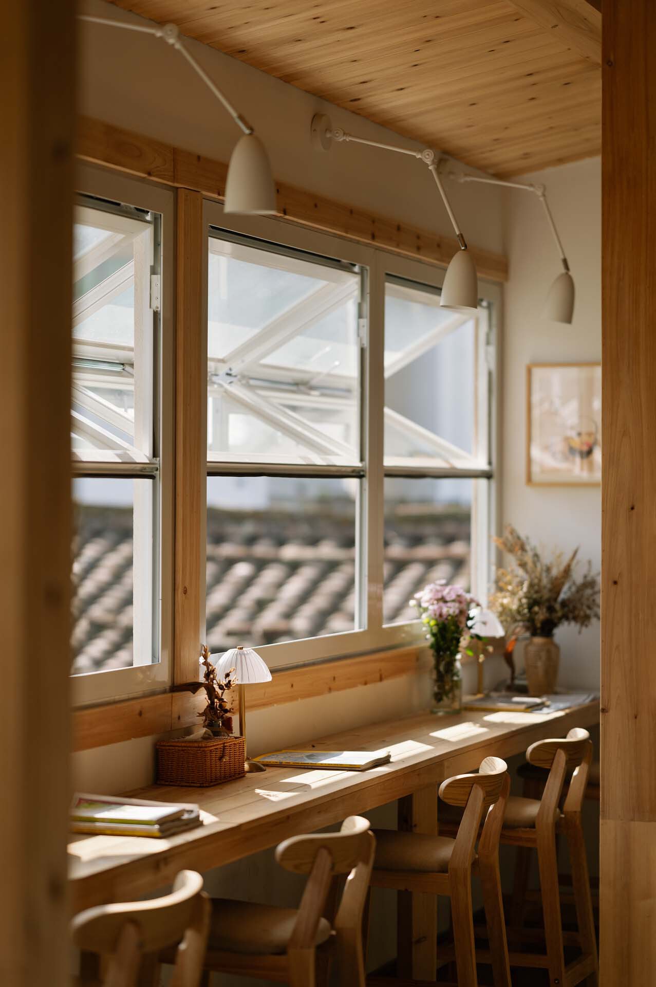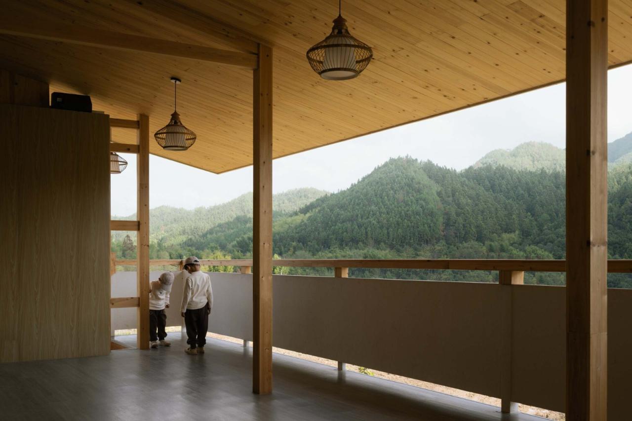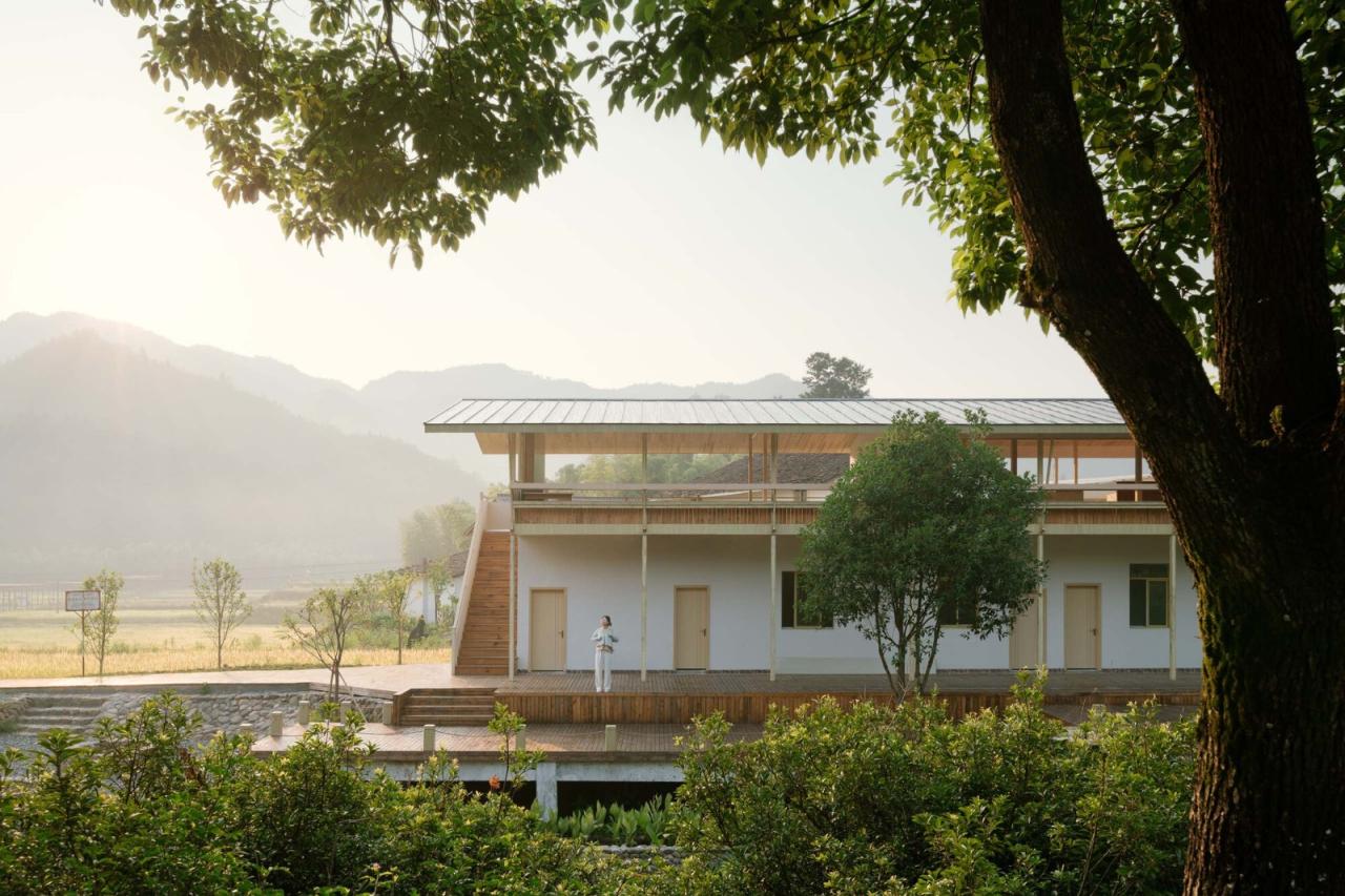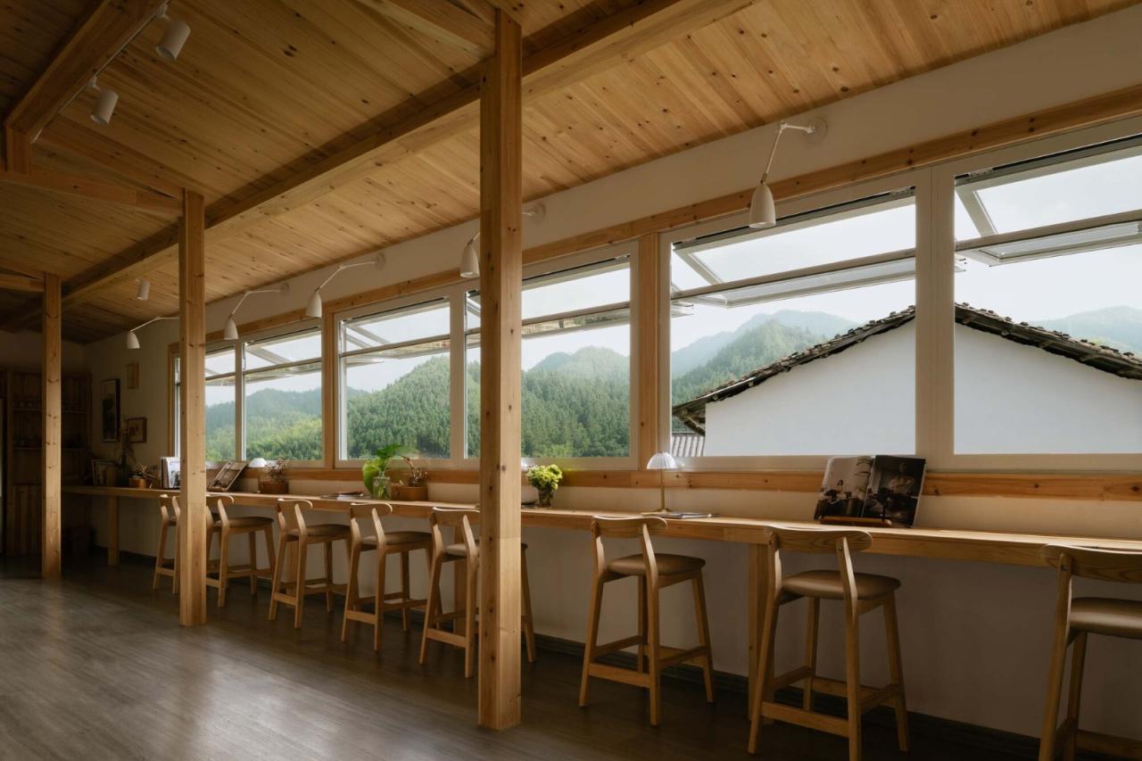驿站与村对视这种被田野包围,紧挨村落,又交通便利的环境条件,使得改造后的小小瑶理驿站成为了周边市民走走出城镇,走进乡村,摆脱纷繁,体验宁静的最佳去处。设计在二层加强了建筑的横向走势,通过两个楼梯率先链接的灰空间,再进入室内,使得空间流线异常亲和,呈现开放有趣的结构。同时,建筑的横向长窗,以及刻意拉伸压低的屋檐,让建筑的对外视线始终保持一种宽幅扁平状,这使得村落的风景犹如中国山水画横轴一般,充满了叙事与流动性。