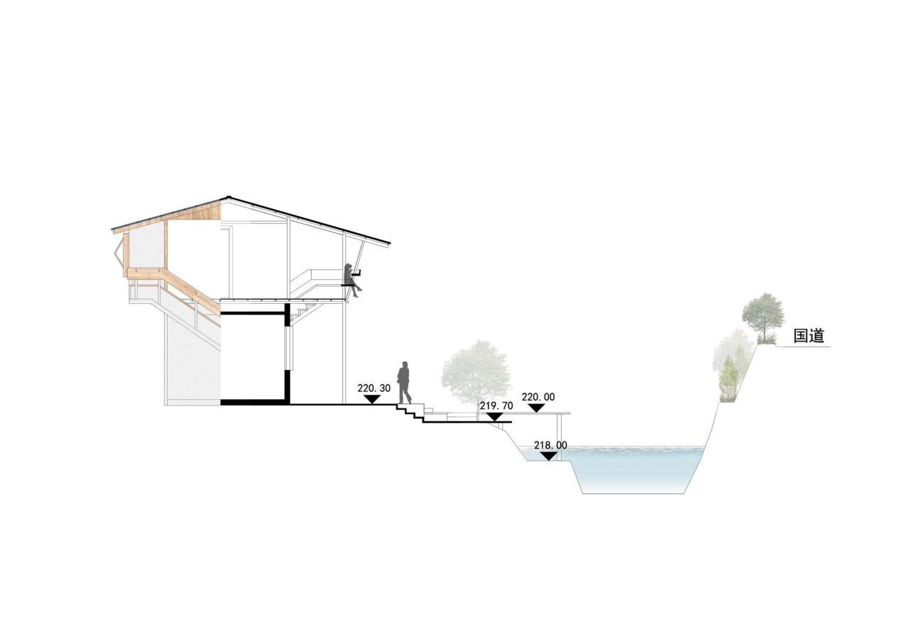 场地阅读延续肌理建构的前提一定是阅读场地与判断建筑走向。场地贴临国道福兰线一侧,而原主体建筑基本平行道路走势,因此设计在二者之间进行了景观手法干预。在保留周围所有乔木的前提下增加水塘面积,并设置木构平台,提供休憩玩耍的活动可能,建立一个相对热闹的场所,以接纳路面传来的噪音。与之相对的是在建筑背面,面对乡村、稻田及山峦,尽可能的选择融合,无任何的隔离与排斥,将驿站作为村落内部的外延,自然的衔接村落肌理。