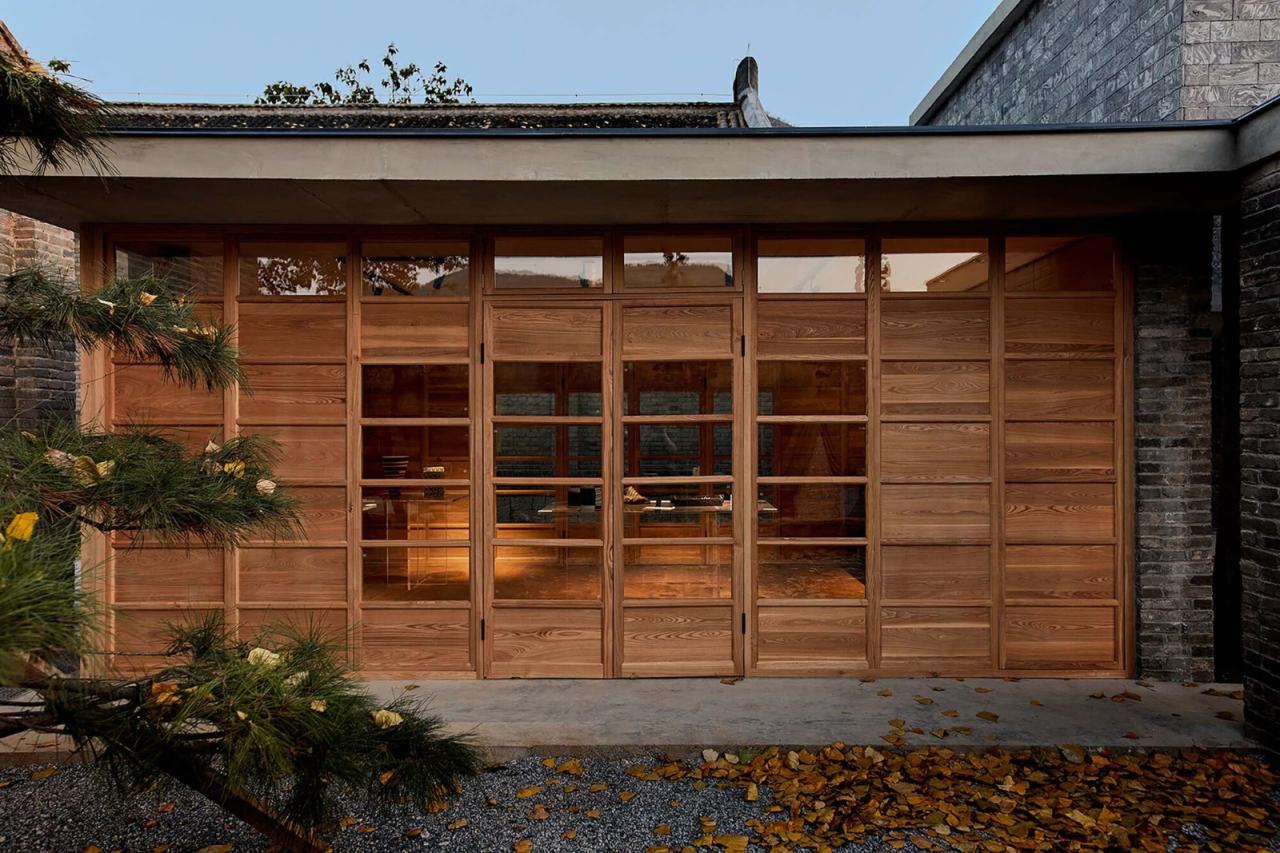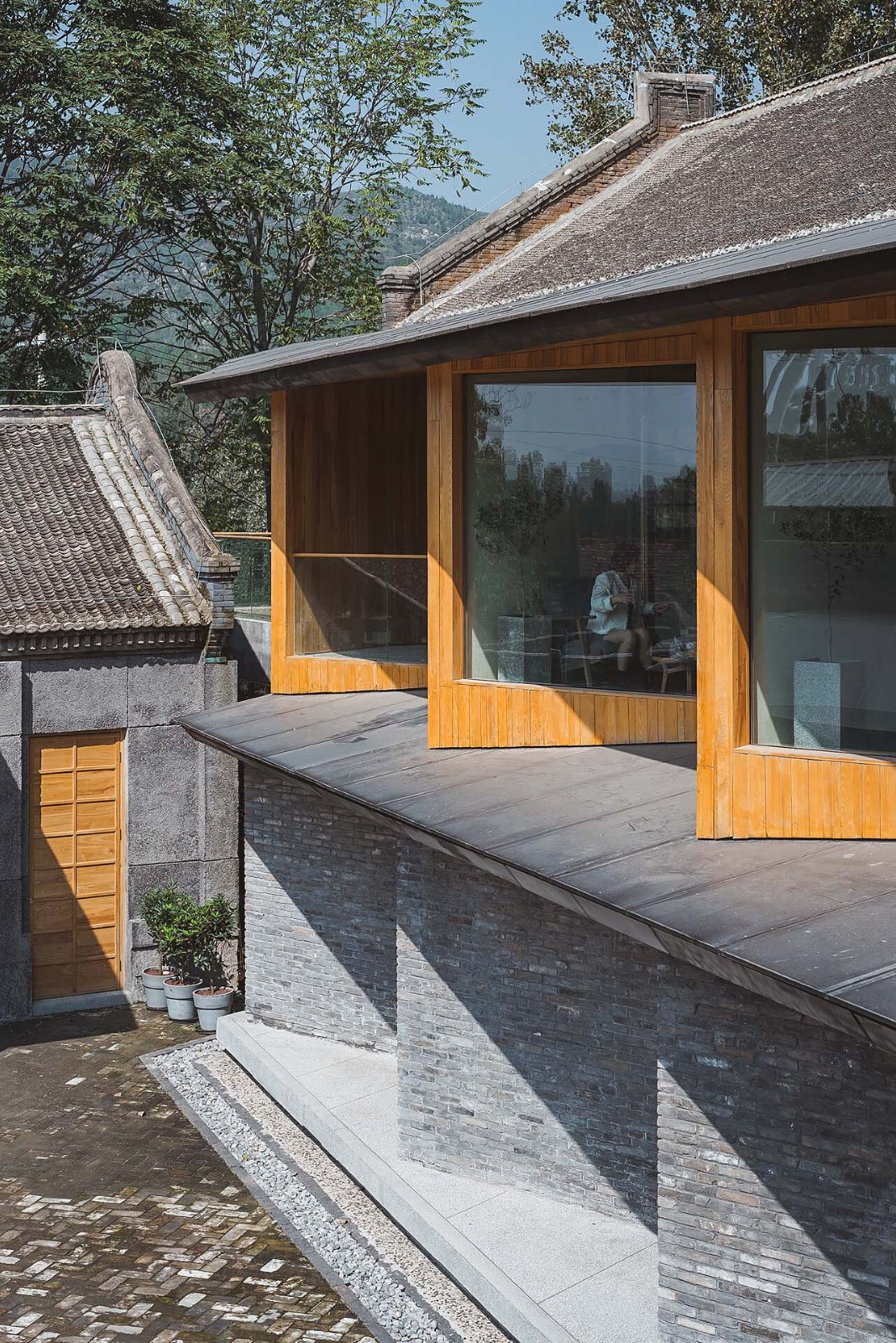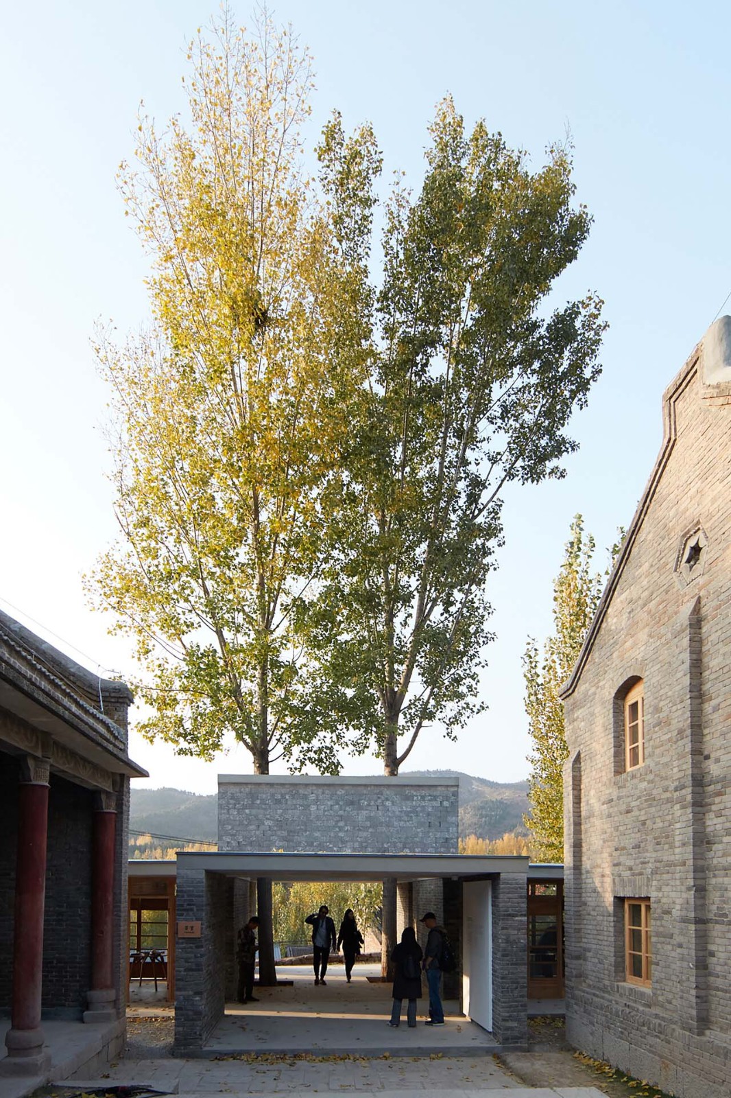 另一处新建的空间是位于艺术中心前后两排展厅联系通道的茶室。作为空间提示,建造完成的茶室成为隐藏在后排不可见的第二展厅新的“可见的入口”。茶室不仅仅是展览的过渡与休憩区域,同时也作为展示功能的伸延,其室内外空间,均可作为各种临时展览场地。茶室建筑将场地划分为数个不同的户外庭院空间。居中的一处留给了场地内现存的两棵挺拔的杨树,一大一小两个茶室之间的垂直天井将其围合。在水平方向上,则形成一条通长的视觉通廊,将远处的山景框入建筑之中。