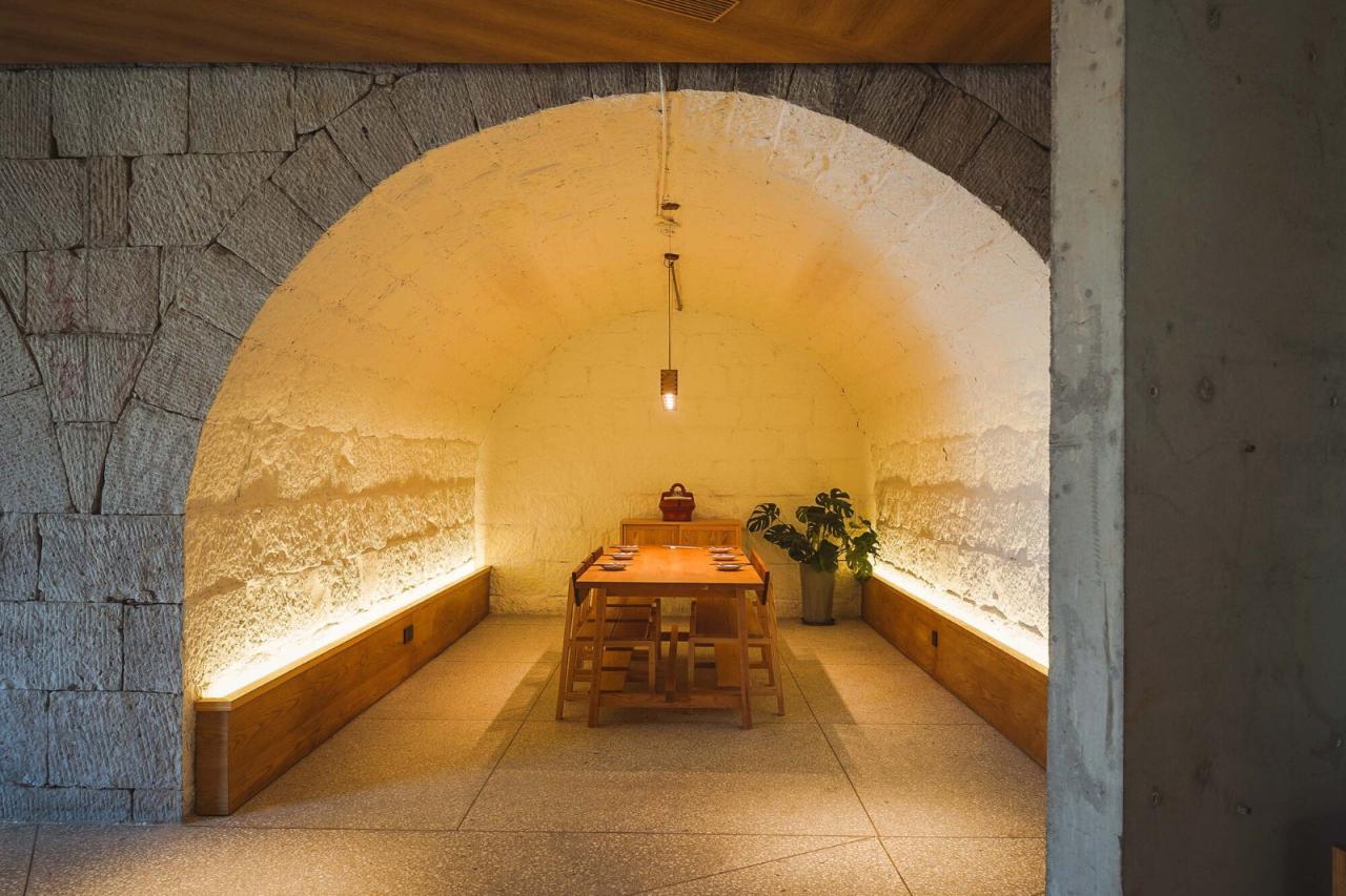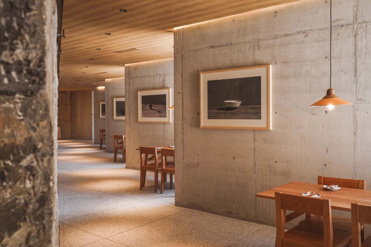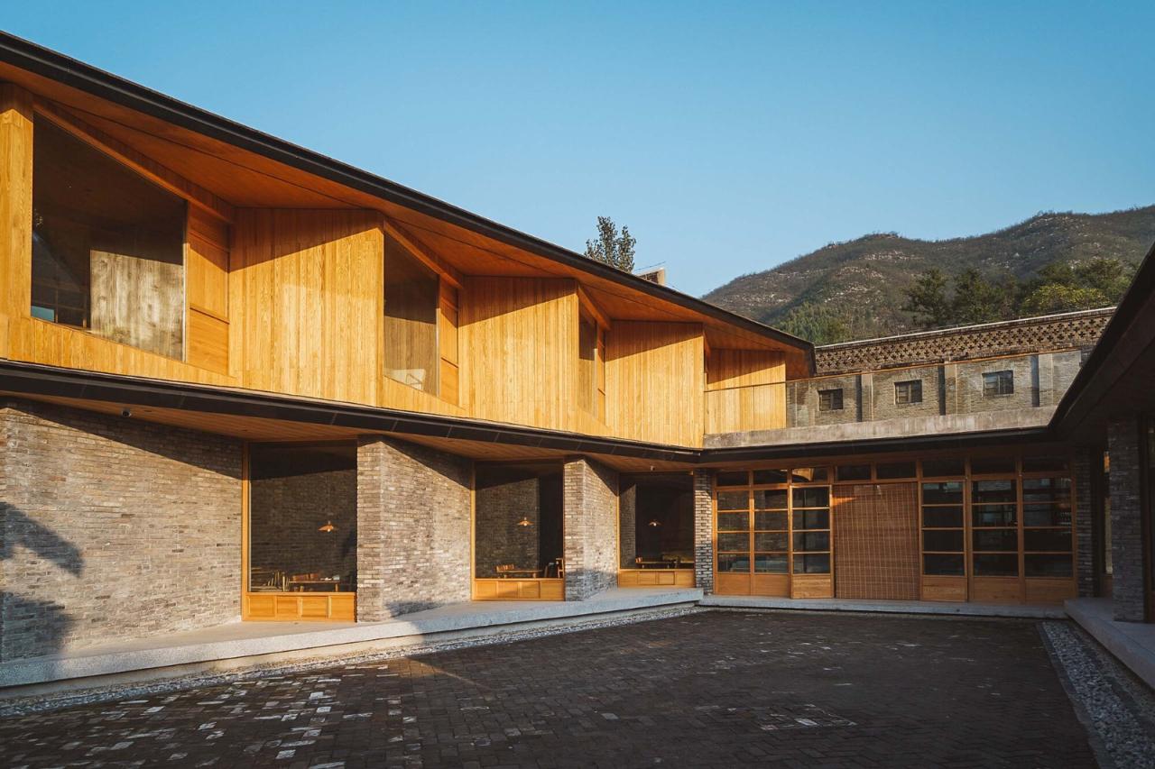 下沉院的餐厅主体由石拱修车库、村卫生所及老院墙围合成的狭长院落组成。新建的餐厅空间将原有的院落一分二调和成两个尺度更协调独立庭院,一个用于组织垂直交通和后勤的内庭院,另一个作为公共活动的中心庭院。七个旧石拱被改造成了七个不同的包间,而餐厅临庭院的座位都设有面向中心庭院的落地窗,折墙的设计保证每个餐桌都能直面庭院里的戏台,同时能兼顾私密性。新建的戏台作为大南坡本村的怀梆戏艺术团的活动和表演场所,背后的村卫生所旧址则改造成了排练室,兼做一些日常传播怀梆戏文化和展览空间。餐厅的屋顶露台,则作为二层联通方所乡村文化的交通平台,和局部延伸的阅读休息区,串联了多个空间。