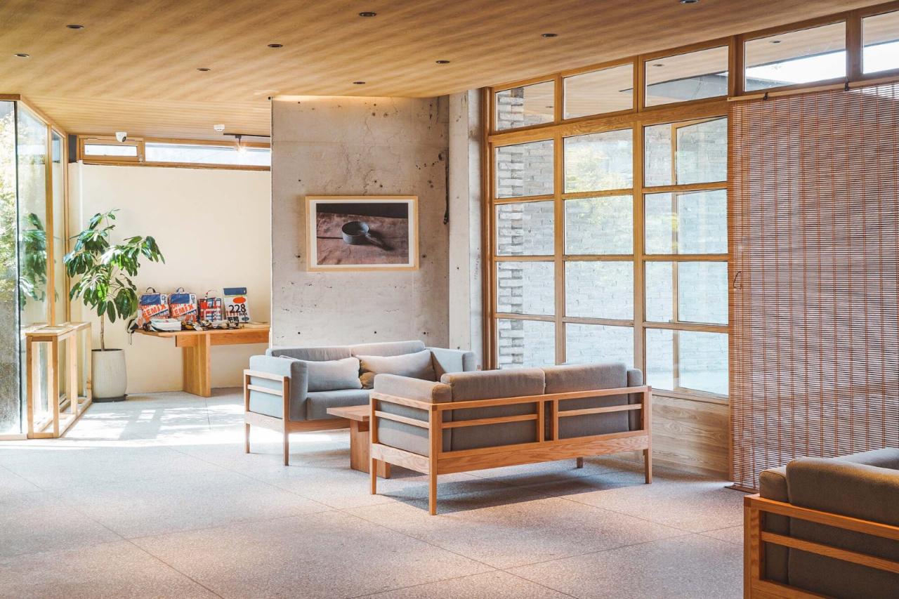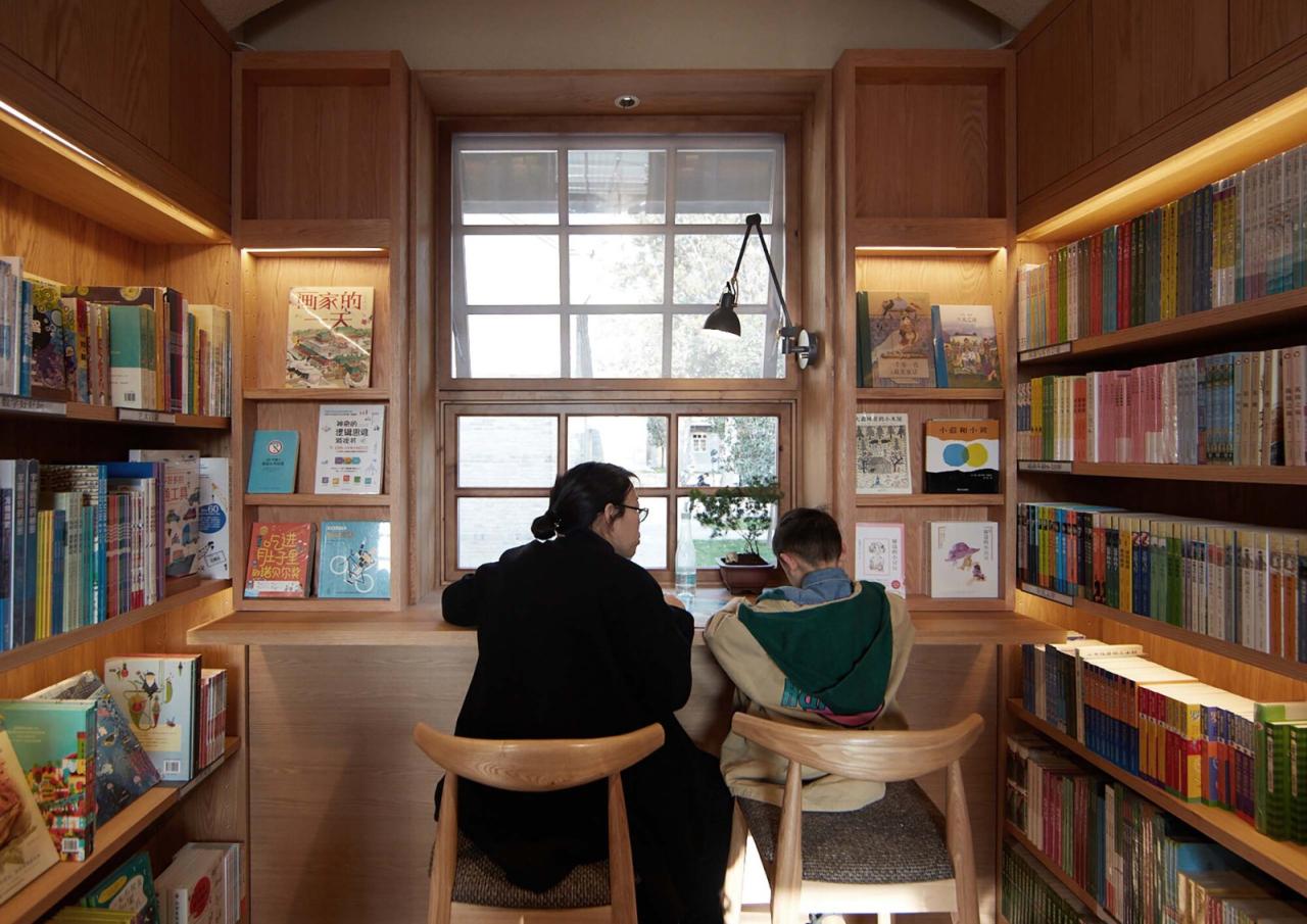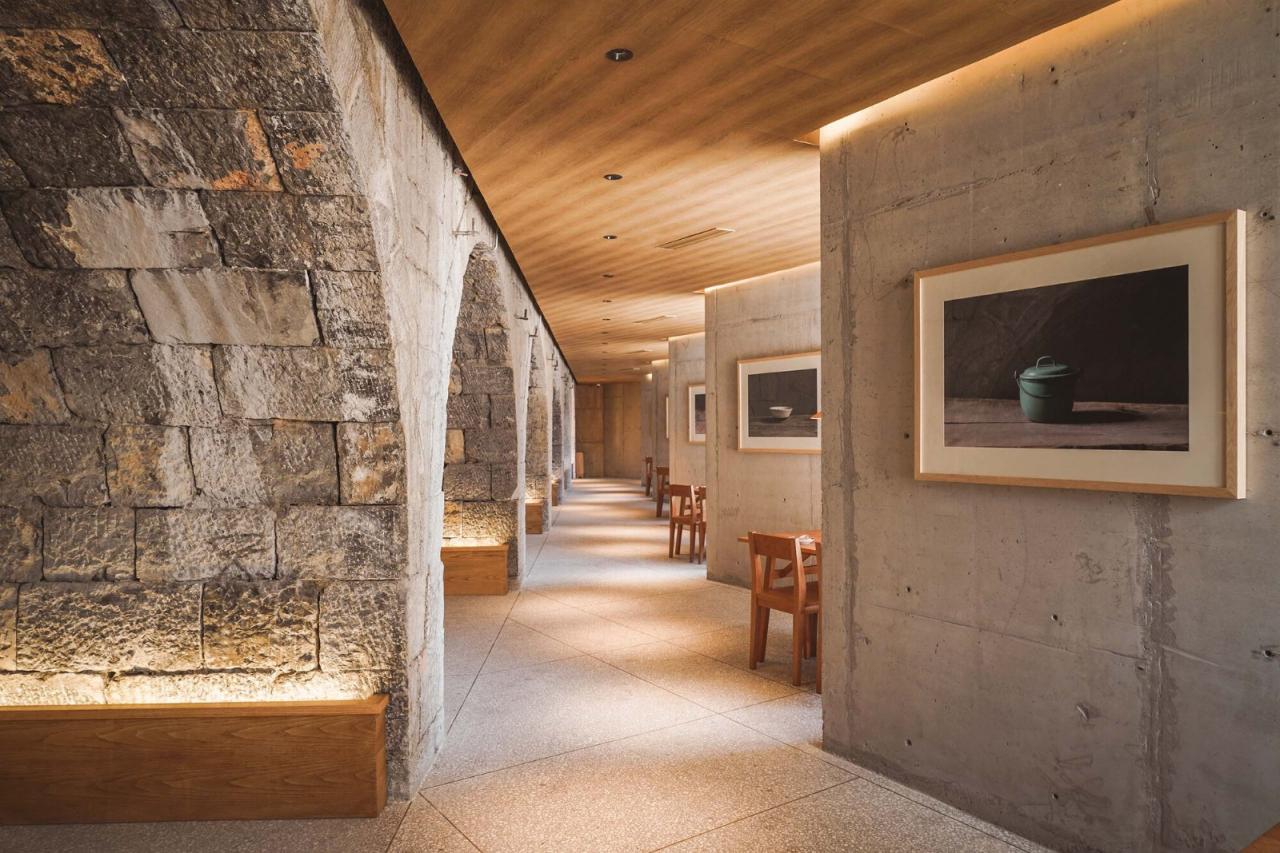 下沉院的餐厅主体由石拱修车库、村卫生所及老院墙围合成的狭长院落组成。新建的餐厅空间将原有的院落一分二调和成两个尺度更协调独立庭院,一个用于组织垂直交通和后勤的内庭院,另一个作为公共活动的中心庭院。七个旧石拱被改造成了七个不同的包间,而餐厅临庭院的座位都设有面向中心庭院的落地窗,折墙的设计保证每个餐桌都能直面庭院里的戏台,同时能兼顾私密性。新建的戏台作为大南坡本村的怀梆戏艺术团的活动和表演场所,背后的村卫生所旧址则改造成了排练室,兼做一些日常传播怀梆戏文化和展览空间。餐厅的屋顶露台,则作为二层联通方所乡村文化的交通平台,和局部延伸的阅读休息区,串联了多个空间。