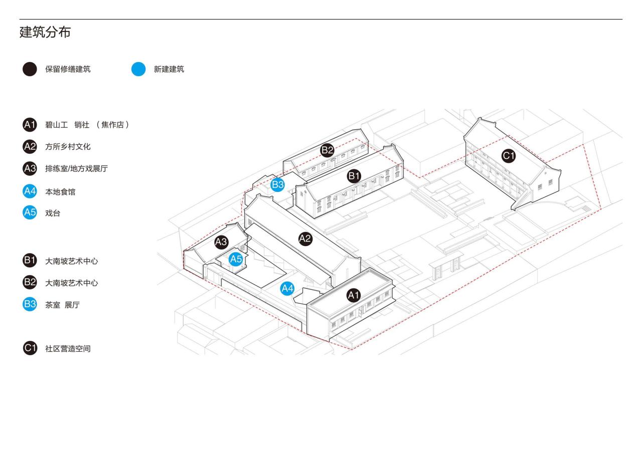 原大队部建筑群由地形高差不同的三组院落组成。居中的院落为主院,旁边的下沉院与主院之间有一层高差,高台院约比主院地坪高约一米。改造完成后的建筑群,将具备吸引外来访客的多个功能空间。如展示本地风物的大南坡艺术中心,销售本地土特产及艺术商品的碧山工销社,供外来访客就餐的家宴餐厅,特别针对本村居民提供了服务村民的社区营造空间,供当地“怀梆戏”艺术团成员和爱好者准备的排练室及戏台,和欢迎所有人的阅读、学习及交往空间——方所乡村文化。