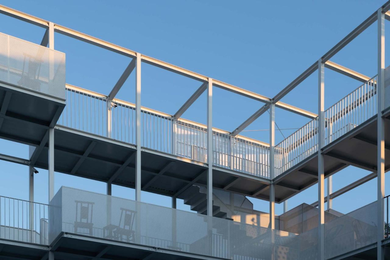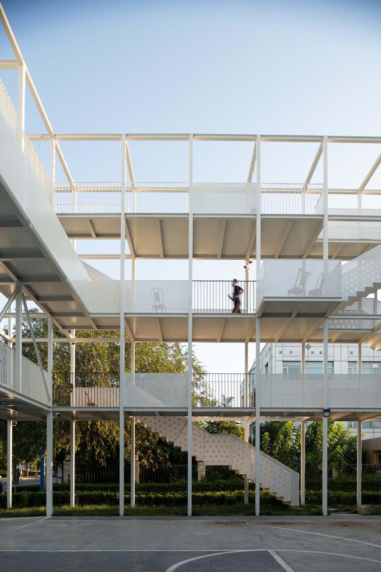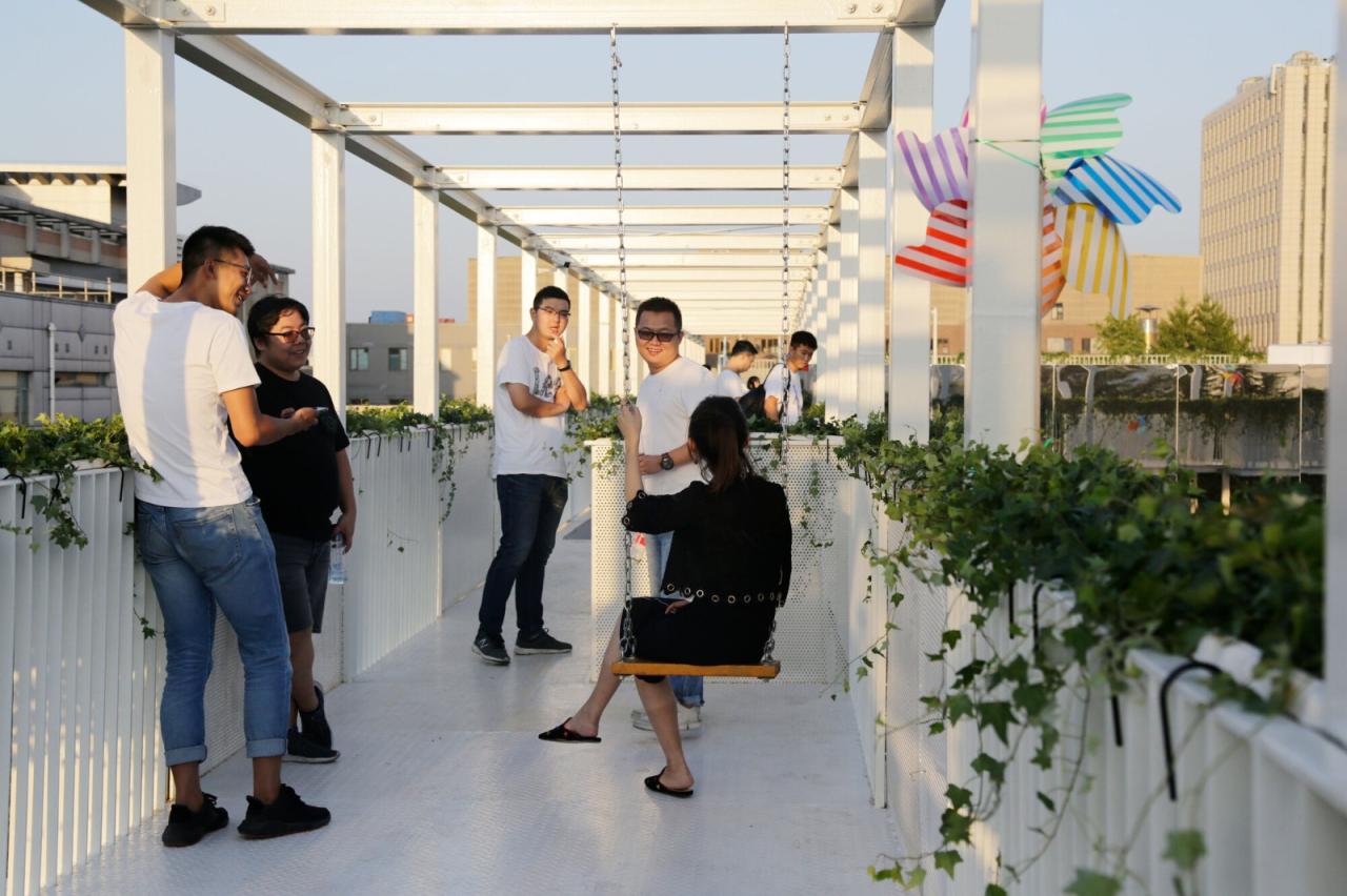 “自由生长”的公园我们在“公园”中还设置了秋千、吊床、拳击袋、跷跷板、滑滑梯等各种有趣设施,吸引人们参与其中,鼓励人们相互遇见,继而触发更多的有趣活动。人们也可以把这个公园想象成一个巨型“乐高玩具”,只要有新的想法都可以“插接”上去,让这个“公园”可以伴随人们的想象力“自由生长”。“折叠公园”结构构件的最初设想是采用常见于工地的脚手架,目的是让“折叠公园”可以成为一种极其廉价且可快速组装、拆卸和复制的城市“触媒空间”通用策略。但由于结构工程师实在无法找到关于脚手架作为民用结构体系的计算依据,当时也没有任何可以参考的案例,无奈最后只好选用“可以计算的”方钢管和工字钢。