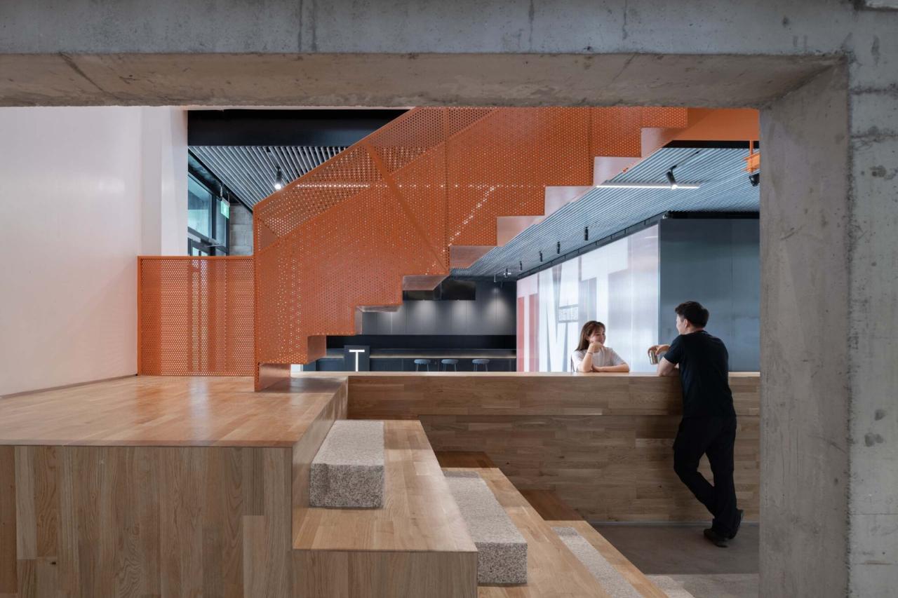 门厅南侧的楼梯间被扩大成通高中庭,使原本相互隔离的三个楼层可以取得视线与空间上的联系。楼梯自身也被拆解和重构,错位穿插于中庭之间,旨在创造尽可能多的让人们相互看见的机会。通过空间“微腾挪”与功能复合,大量空间被赋予多重用途,例如走廊宽度通过精确计算,融入了阅览室功能;楼梯最底部梯段被放大成原木退台,可兼做展示台和休息阶梯;首层空间向内院拓展,围绕立柱形成吧台工作区;空中向外生长的玻璃盒既是会议室,又是可以荡秋千的休息室。