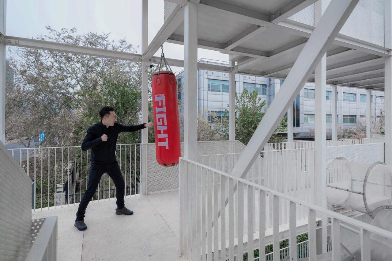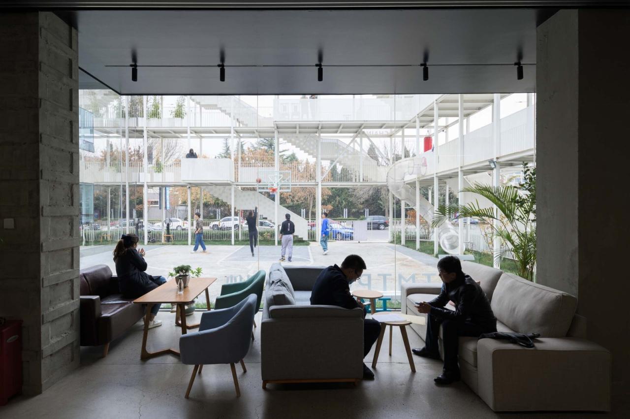 安装在“折叠公园”上的篮筐使前院成为了街道中唯一的篮球场,随时可能上演一场街头篮球,而此时“折叠公园”则成为了看台,为观众提供不同的观赛视角。“折叠公园”中的游步道将人们自然引至屋顶,使原本闲置的屋面也成为了“公园”的一部分。“F”形屋面的长边被设计成慢跑区,两个短边被设计成酒会区和迷你GOLF健身区,屋面之间的高差则被设计成了半围合的小剧场。开阔的视野和便捷的可达性鼓励人们在此运动、休憩、聚会,也可以举办各种有趣的社区活动。面对撑满了整个用地的建筑,设计并没有对其外观进行雕琢,而是用镜面蜂窝板覆盖了所有朝向场地内部的立面,让建筑尽可能消失在环境中,也让变化的环境和人们的活动成为最生动的建筑“表情”。原本狭小的庭院和有限的“公园”也在镜面反射中被无限放大,在亦虚亦实之中,空间实现了“反折叠”。