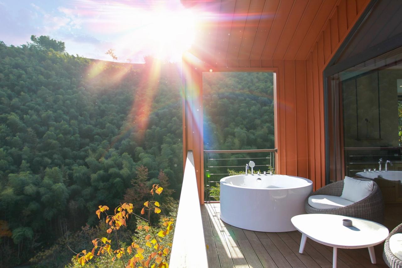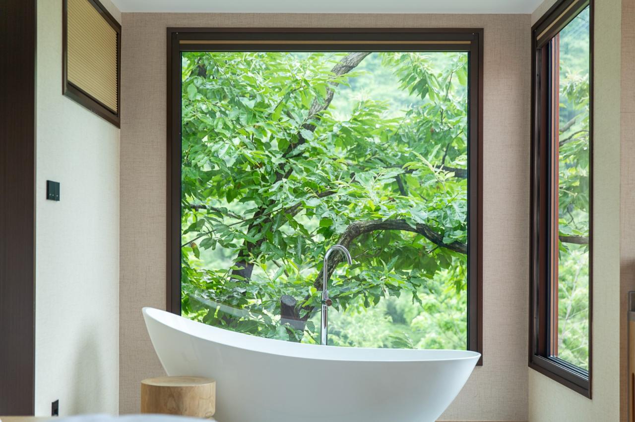 室内功能齐全,有独立卫生间、吧台、阳台休息座椅,还特意在户型上设置了两 个“小耳朵”,客房的两边分别放置了浴缸和榻榻米,且都采用了落地窗的方式,在林中沐浴,在绿意中品茶,感受人与自然的契合。山景套房隐匿在林间半坡处,由林间穿梭的台阶和休憩平台进入房间,自然光透过落地窗洒满了房间的每个角落,为冬日森林中憩息的游客温暖了身心。