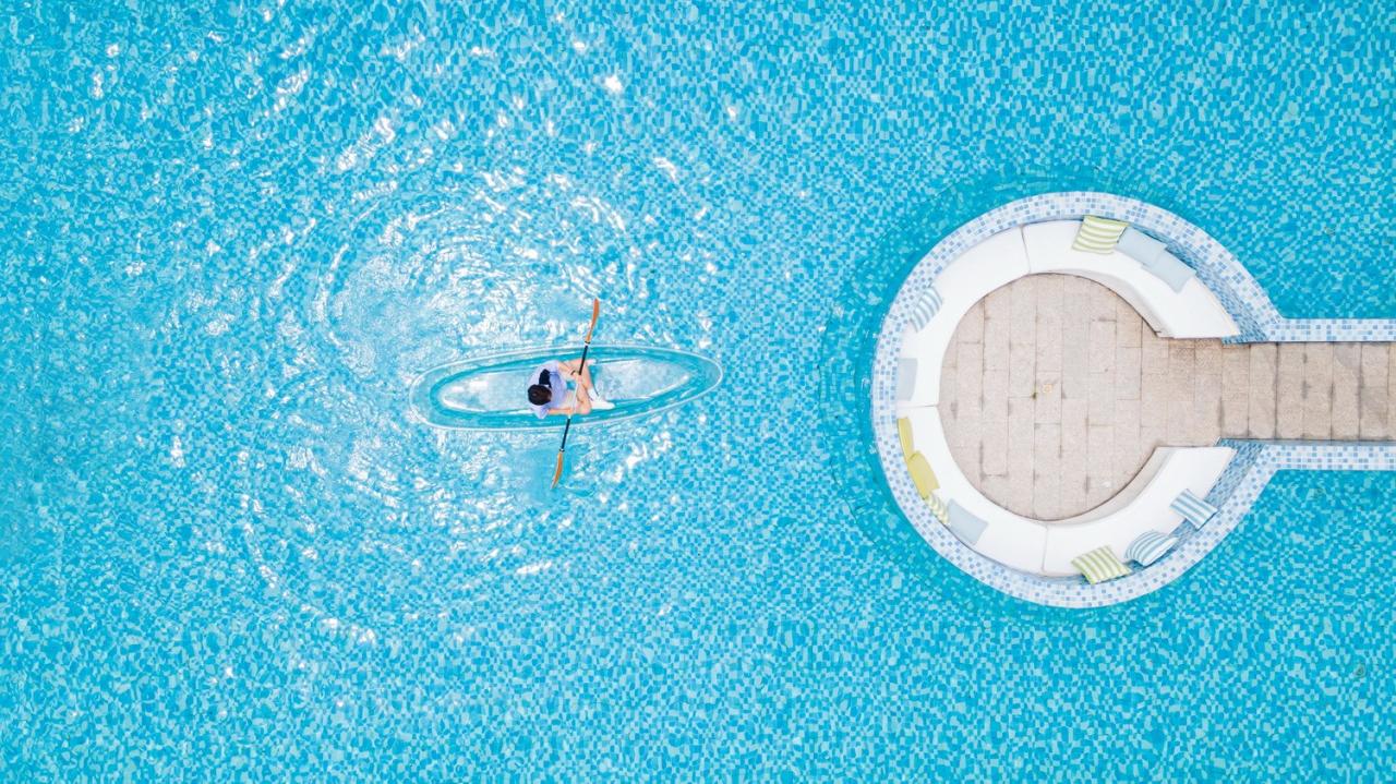 在养心墅更多的度假体验中,设计师希望消除建筑内外的“界限感”。二层客房与一层公共空间利用水平高差保证了视线绝对隐私和最大限度的风景资源,内部格调强调舒适自然的调性。负一层的温泉泡池与上方泳池通过玻璃池底视线相映成趣,同时兼顾了更衣、室内高尔夫、棋牌、桌球等娱乐配套功能。