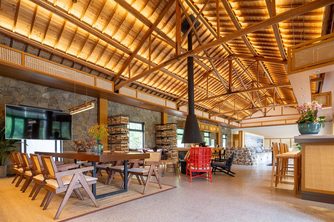 接待区门厅设计营造类似一种度假别墅客厅的氛围;穿过书吧门廊,可以到达休闲吧、餐厅区域,这个空间功能多保留还原了原建筑的结构风貌,但是通过落地大窗的界面,室内休闲、餐饮功能最大限度地接纳感受到室外无边际泳池和景色宜人的山景。