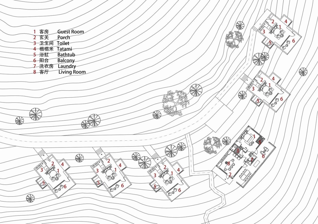 六个小房子也是对传统村落的一个模拟,盘山的楼梯就像山村中的蜿蜒的小路,在 从山下公共空间走到自己房间的过程中已经不自觉地完成了和自然的交流互动。小 房子的排列呈“V”字型,让客房私密性增强的同时更大程度的开阔视野,远眺前面的美景。