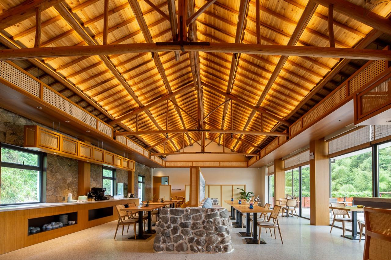 我们将餐厅、客房、员工宿舍、水吧、书吧、无边泳池、泡池等多种公共空间置于 改造房中,这样既符合功能流线、满足来客的生活需求,同时还能充分利用原始的 建筑,营造自然野趣的公共空间,也以此希望除了为来客提供舒适的居住体验,还可以提供更为全面、有趣的生活体验。