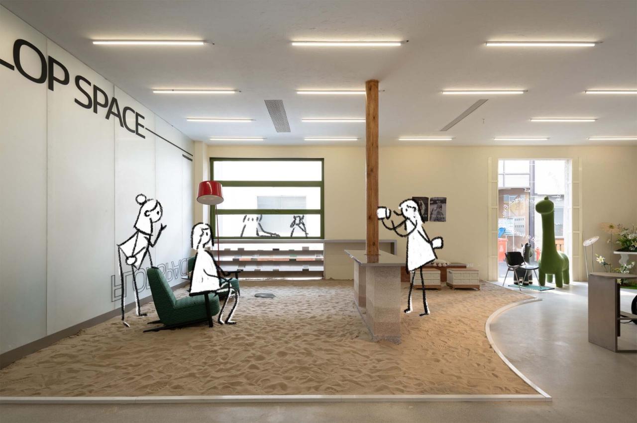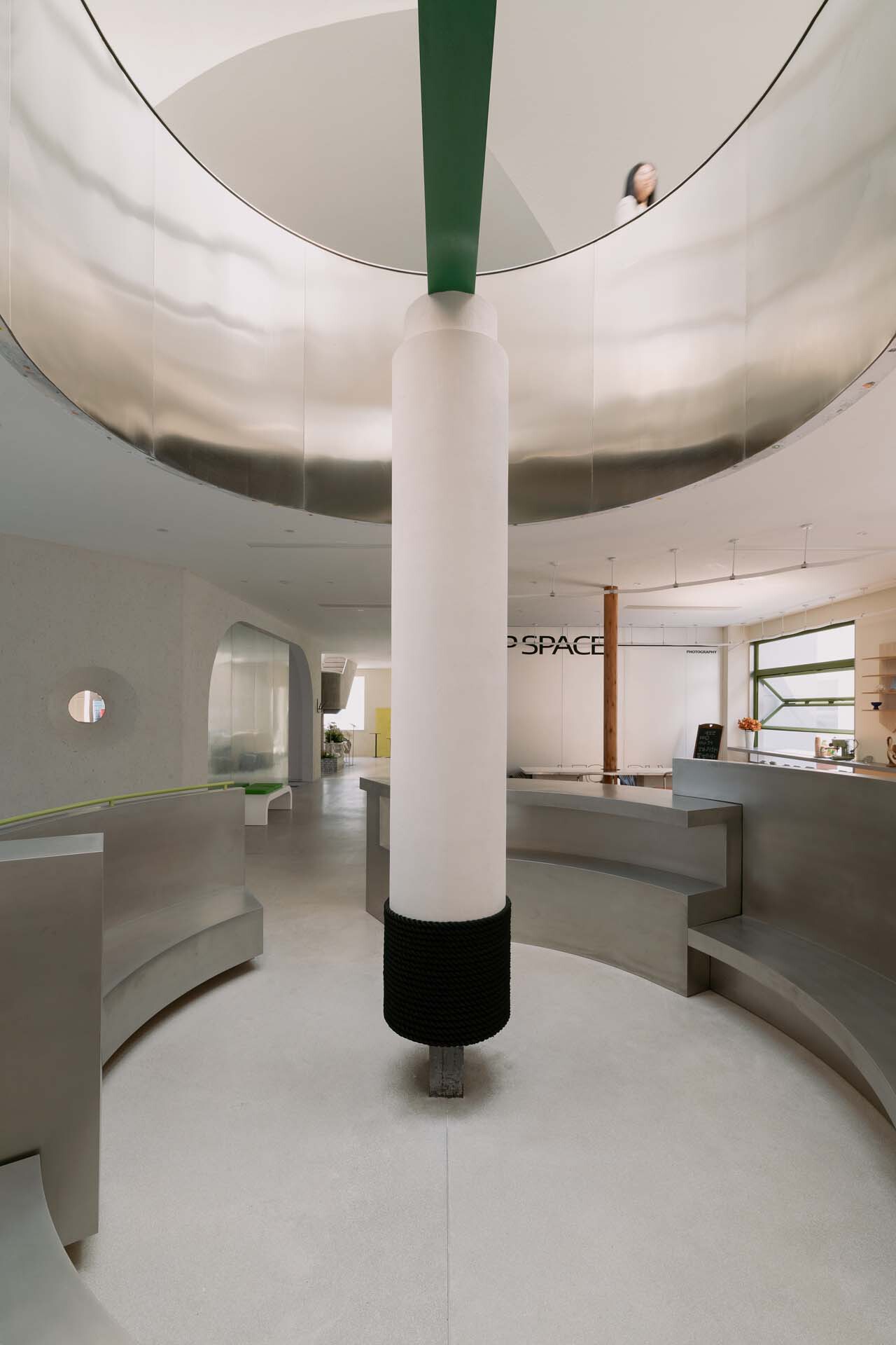 我们利用增加的二层结构层和通高空间结合起来。座椅围绕一楼的柱结构和二层的梁结构结构成为一个内向的休息空间,并与上方的二层空间形成视线交流。