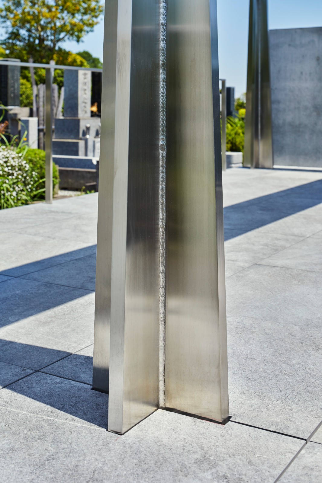 从前的旧建筑和防水层都被拆除重做。平台离地面高度为 650 毫米,十字架的底部高于平台 1850 毫米。结构的最大高度离地面 3 米。漂浮在空中的十字架,给坟墓带来一种抽象感,从世人的视角基本认不出十字架的结构。