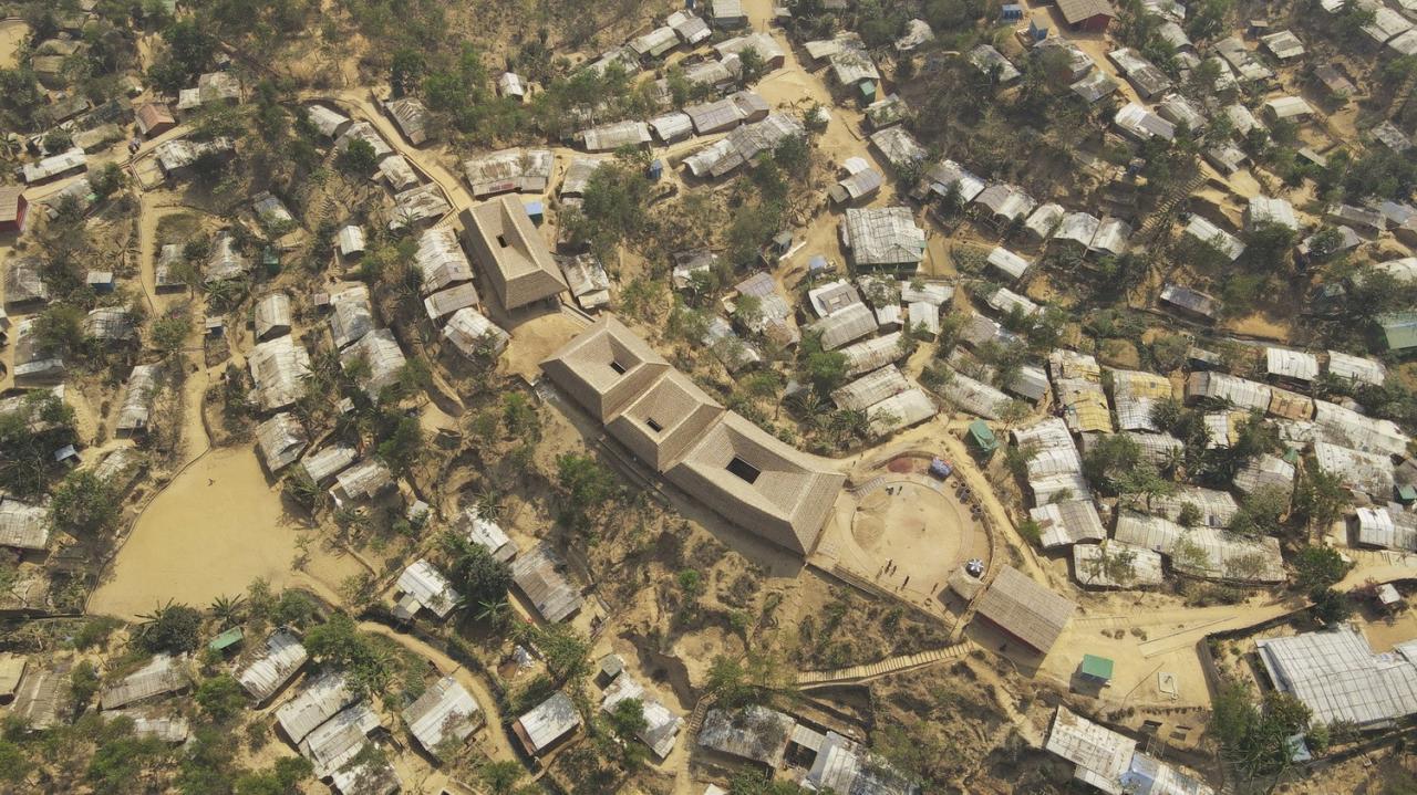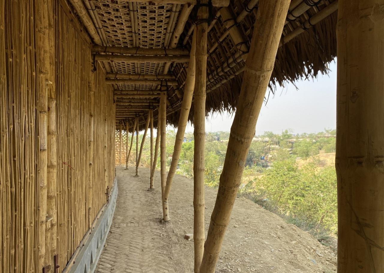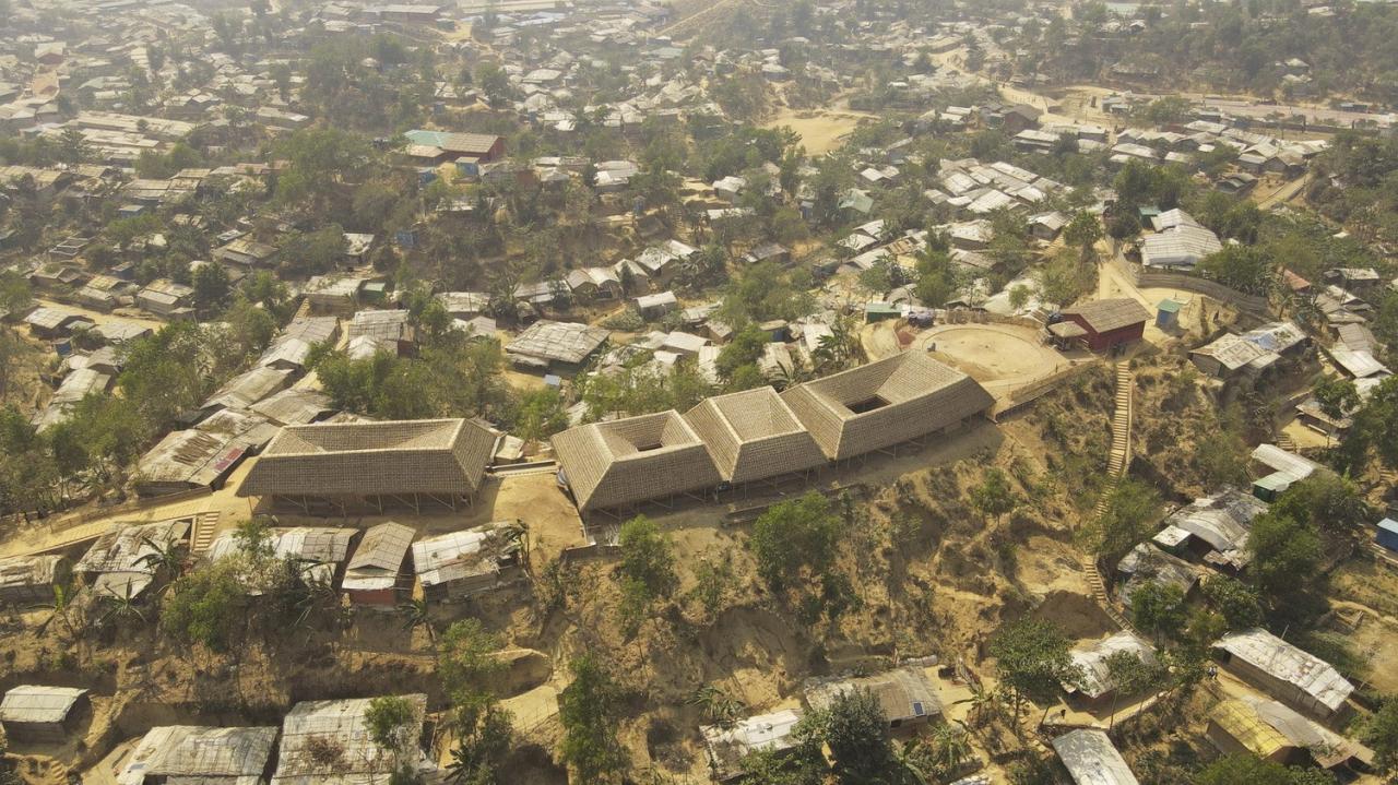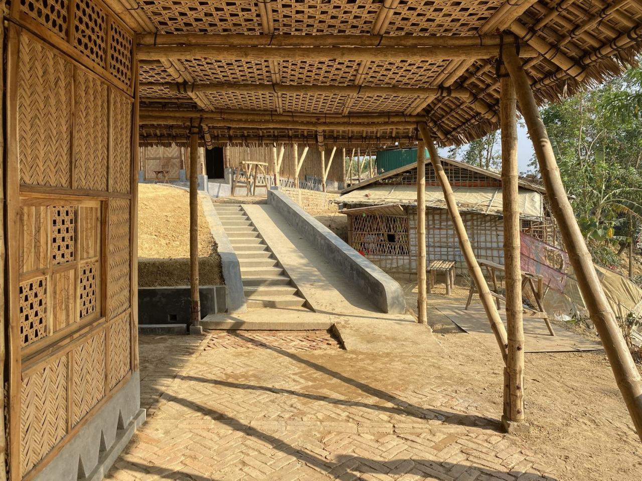 罗兴亚文化记忆中心位于难民营营地中心的山顶上。其施工确保了营地中临时建筑的灵活性,并使用了易于拆卸的预制柱,地板组件、螺母螺栓接头等。此外,罗兴亚文化记忆中心有着较大的屋檐,由此屋顶延伸的部分既形成了凉爽的遮阴空间,同时也确保了建筑内部免受来自垂直方向及水平方向的雨水影响。并且,罗兴亚文化记忆中心在建筑主厅周围为所有人打造了可以自由活动的空间,从而让其内部环境更具吸引力。
