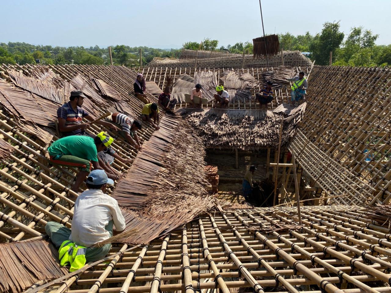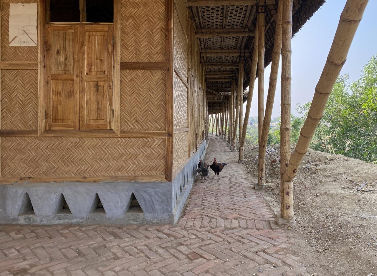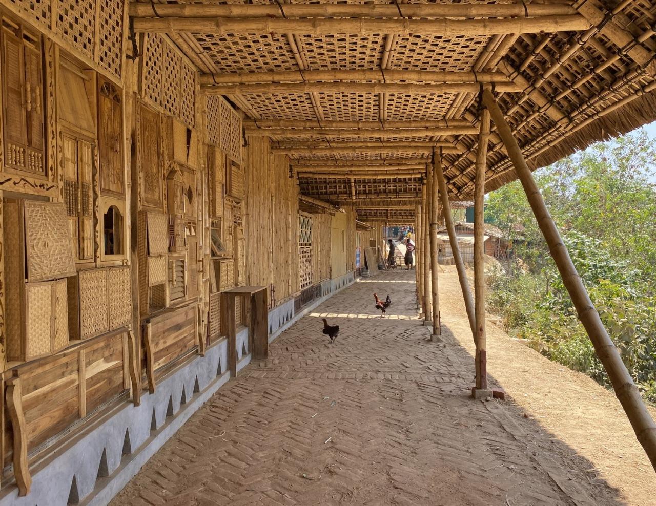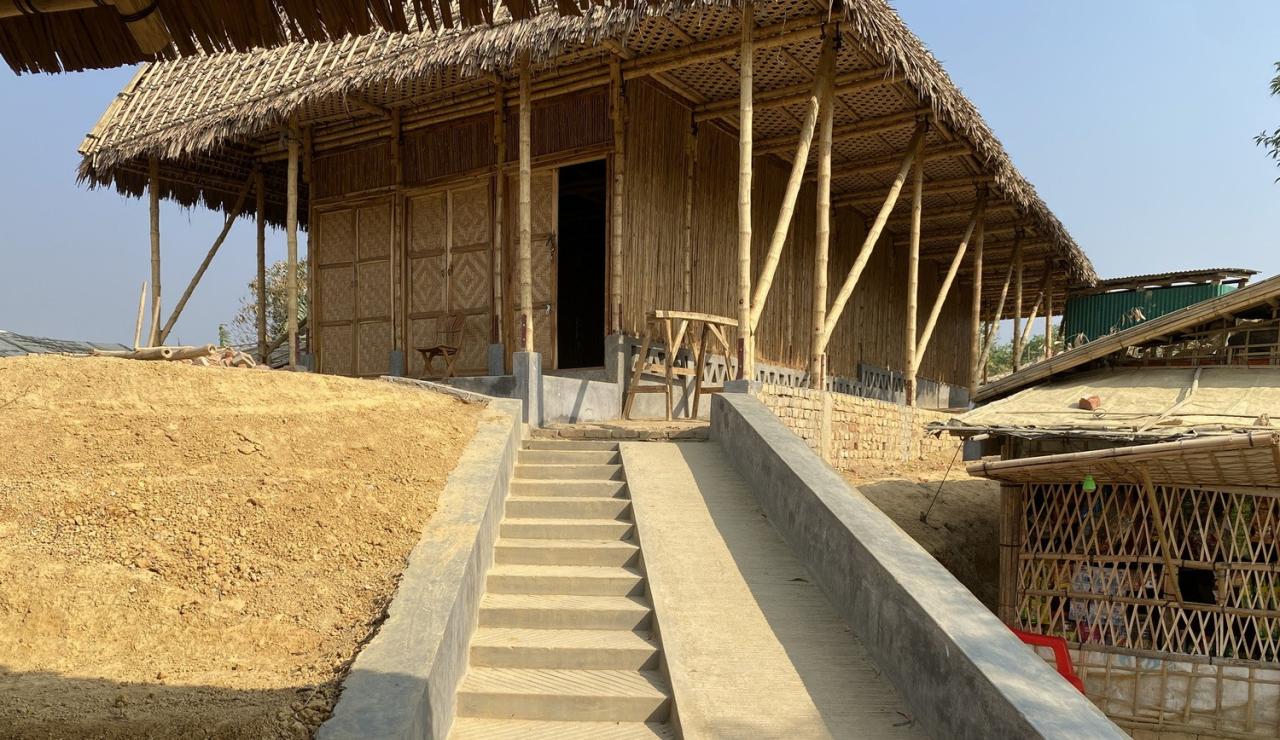 罗兴亚文化记忆中心位于难民营营地中心的山顶上。其施工确保了营地中临时建筑的灵活性,并使用了易于拆卸的预制柱,地板组件、螺母螺栓接头等。此外,罗兴亚文化记忆中心有着较大的屋檐,由此屋顶延伸的部分既形成了凉爽的遮阴空间,同时也确保了建筑内部免受来自垂直方向及水平方向的雨水影响。并且,罗兴亚文化记忆中心在建筑主厅周围为所有人打造了可以自由活动的空间,从而让其内部环境更具吸引力。