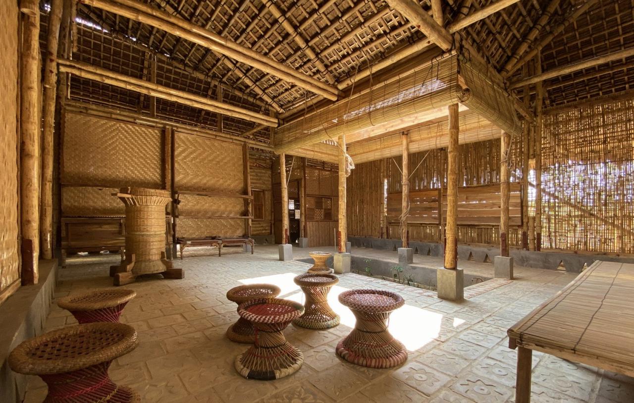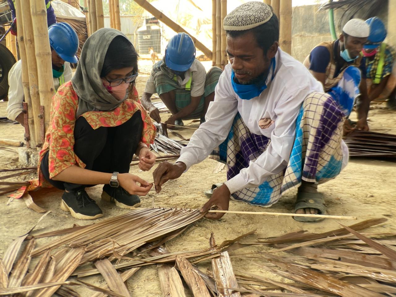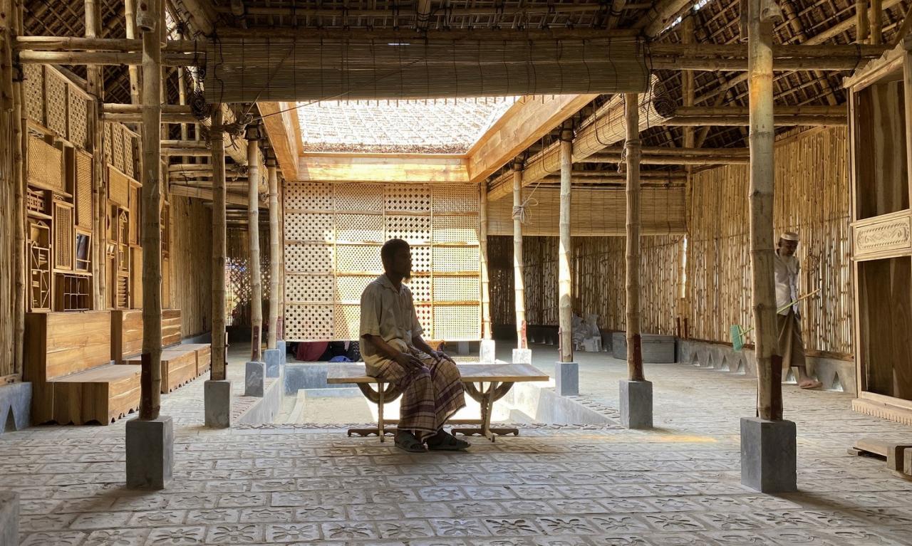 尽管生活环境动荡不安,但是罗兴亚人拥有着许多故事、知识及智慧,从而为创造积极、关怀的建筑创造可能。“罗兴亚文化记忆中心”位于罗兴亚人最大的难民营区,并意在收集、保护、传播属于罗兴亚人的知识与故事,由此即便在最不稳定的情况下,也可以为流离失所的人群建造充满善意的空间。罗兴亚的工匠及当地社区成员为此贡献了他们的本土知识、技术、生活方式及故事,从而帮助建筑师恰当地形象化设计空间。并且,建筑师利用了当地的水椰叶(om pata/gol pata)构筑了屋檐、各种竹编工艺品、传统样式的门窗、家具以及其他刻有当地文化印记的物件,以此由内而外地打造了仅属于罗兴亚人的建筑。