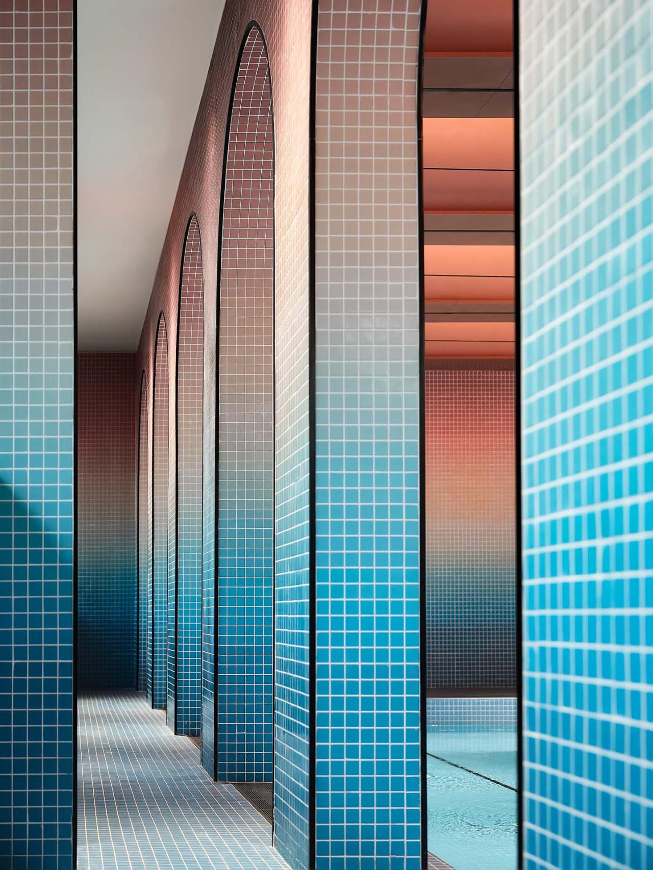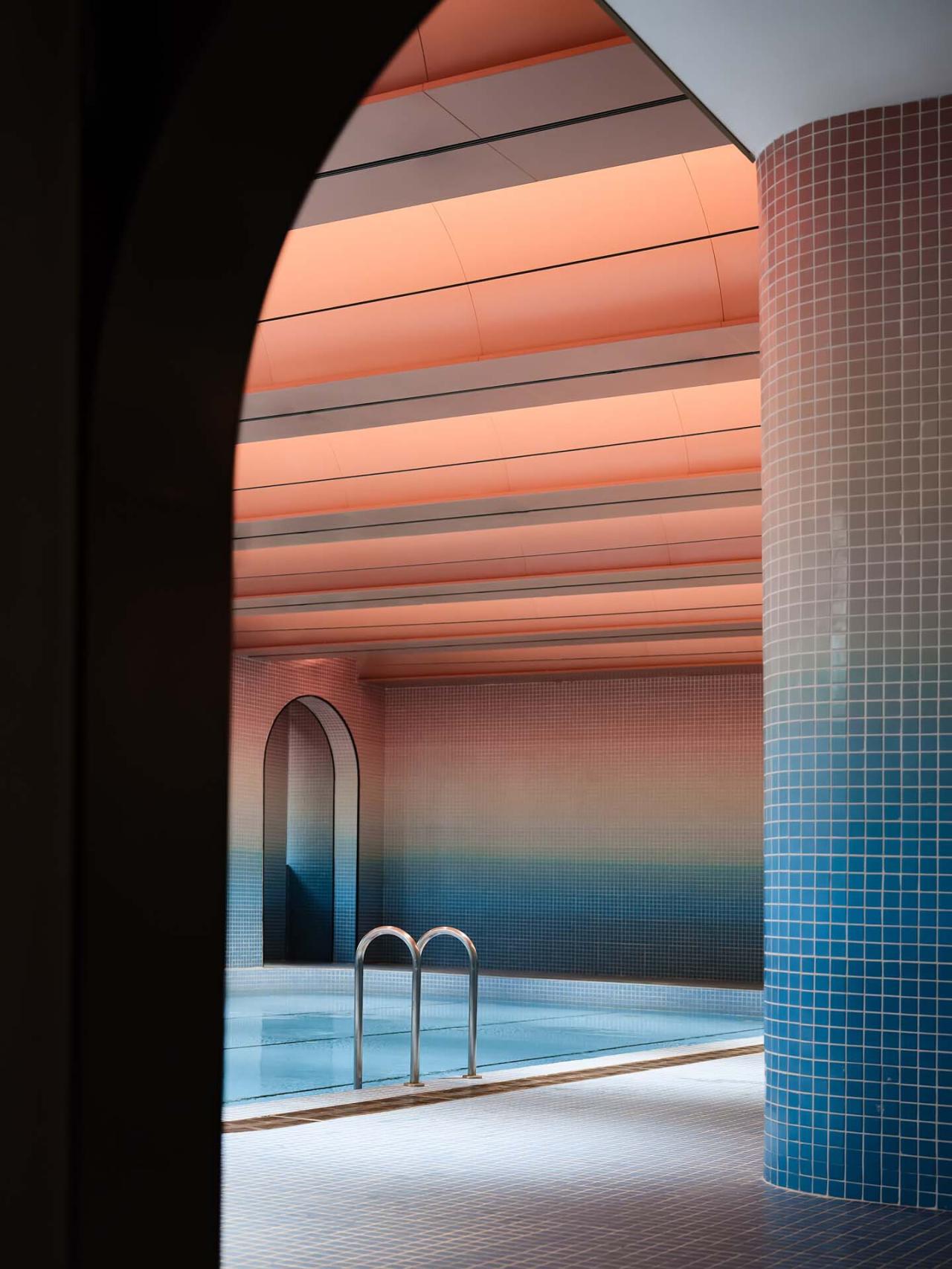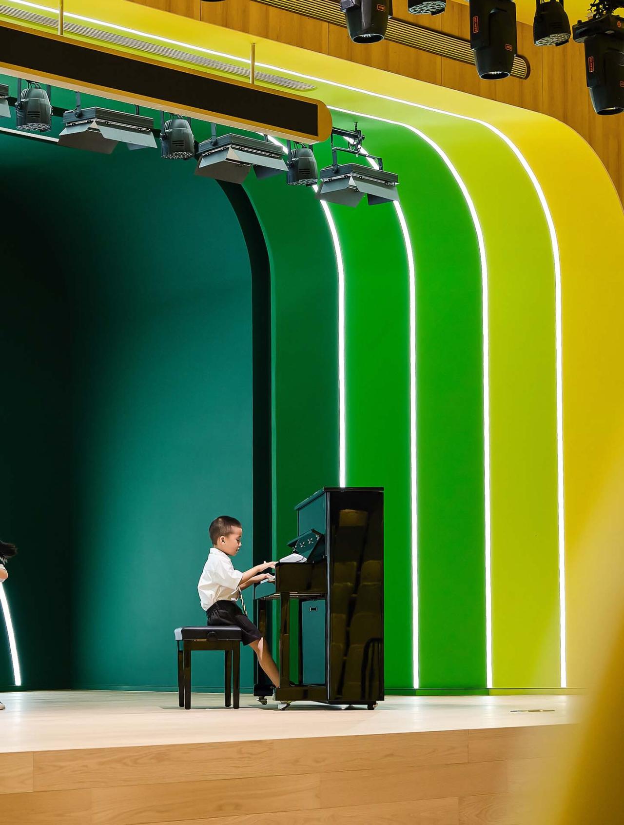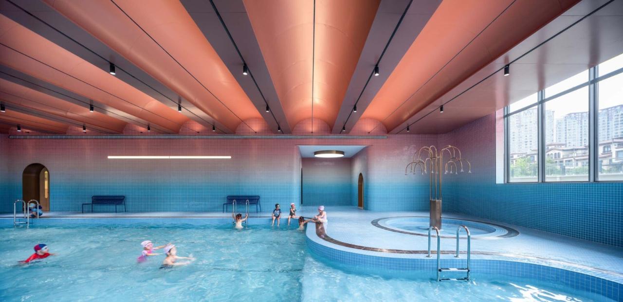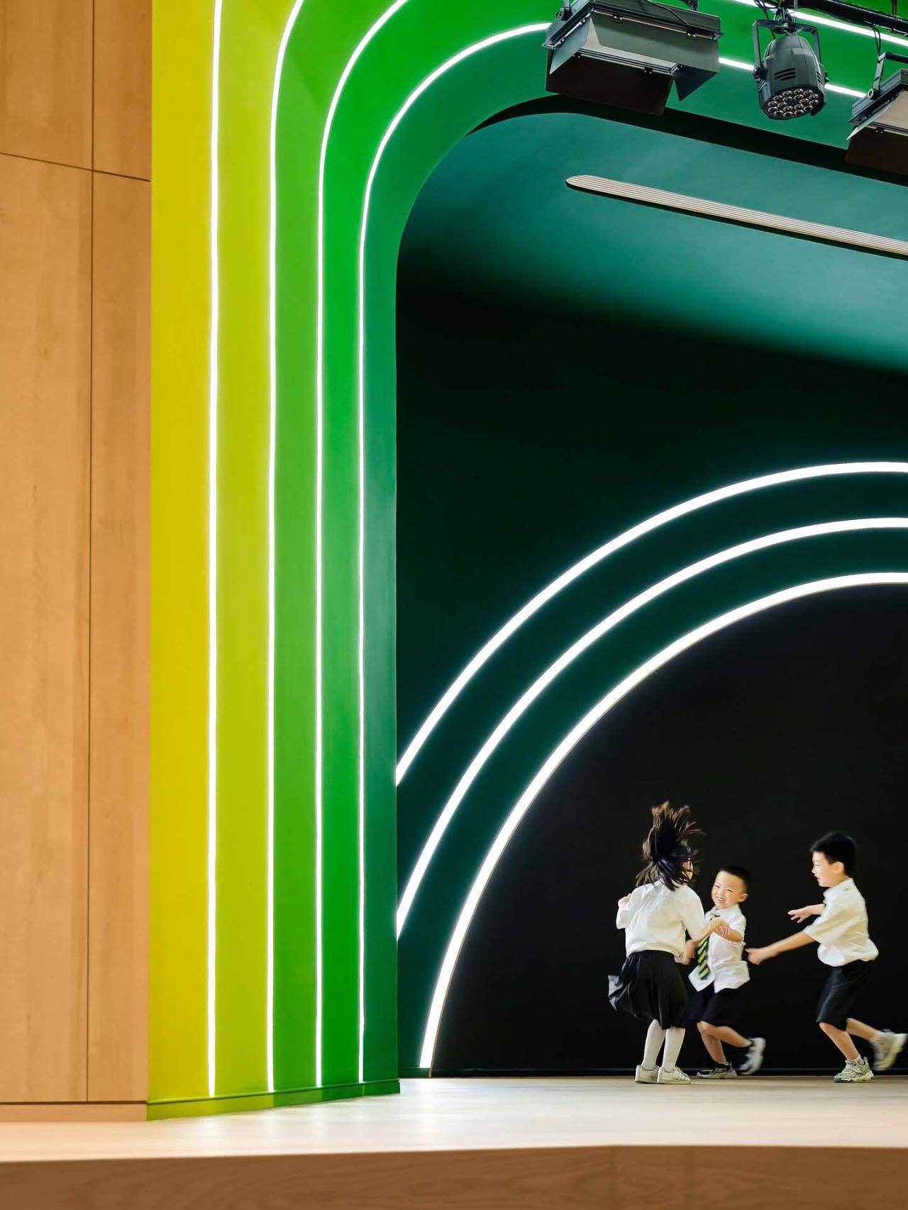 从孩子们的视角出发,校园里本身就是一场森林奇遇记,喜爱的滑滑梯、趣味装置会在某个转角不期而遇,为孩子们准备的玩耍空间随处可见。与此同时,细节处的设计如适宜儿童身高的栏杆扶手、阳角处的圆润处理,都在默默地为孩子们的探险之旅保驾护航。文化活动空间是孩子们重要的交往场所,篮球馆、小剧场、亲子餐吧、绘本馆和游泳馆设置在建筑一层的主动线上,仿佛一场“梦幻巡游”,是孩子们最初的社交启蒙。小剧场可容纳200人,是孩子们日常及表演活动的重要场所,空间采用了灵活可收纳的座椅以适应差异化的活动需求,高饱和度的色彩做出的多层次吊顶与舞台设计调动空间氛围,激发孩子们的表演欲。游泳馆是孩子们在炎炎夏日下最爱的去处,与千篇一律的游泳馆不同,蒙德的游泳馆由粉蓝色的渐变瓷砖满铺空间,连续的拱形吊顶、门洞激发空间的趣味性,打造夏日梦幻的氛围,水花四溅,孩子们嬉笑打闹的声音不绝于耳。