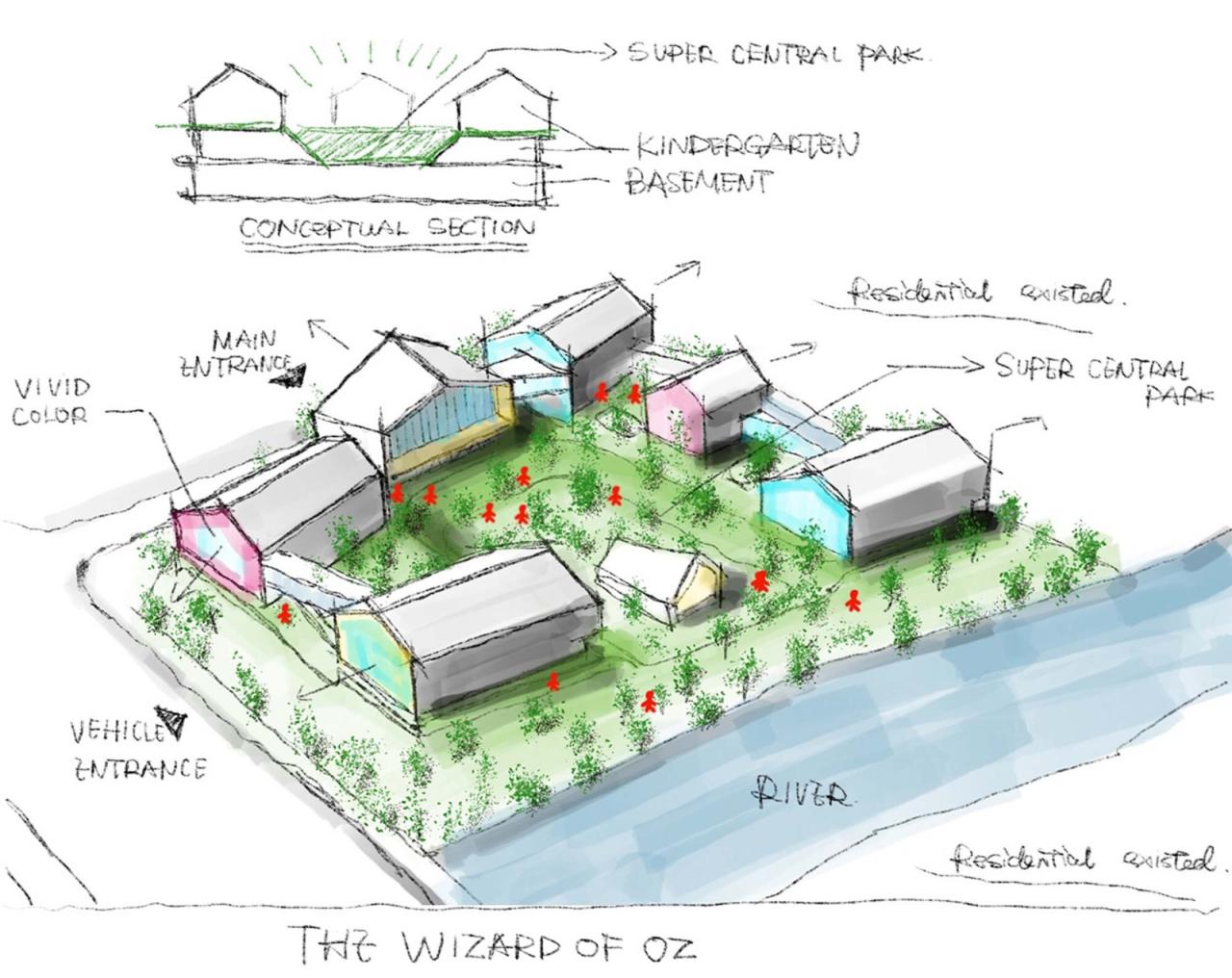 “绿野仙踪”设计团队围绕“探索”的主题提出了“绿野仙踪”的设计概念,将建筑分为六座白色“小屋”,小屋们面朝河流,围坐在一块起伏的“绿毯”之上,“白屋”和“绿毯” 巧妙地将部分建筑隐藏,创造出多维度的立体活动空间,将建筑隐匿于自然之中,再现绿野仙踪的天真烂漫。