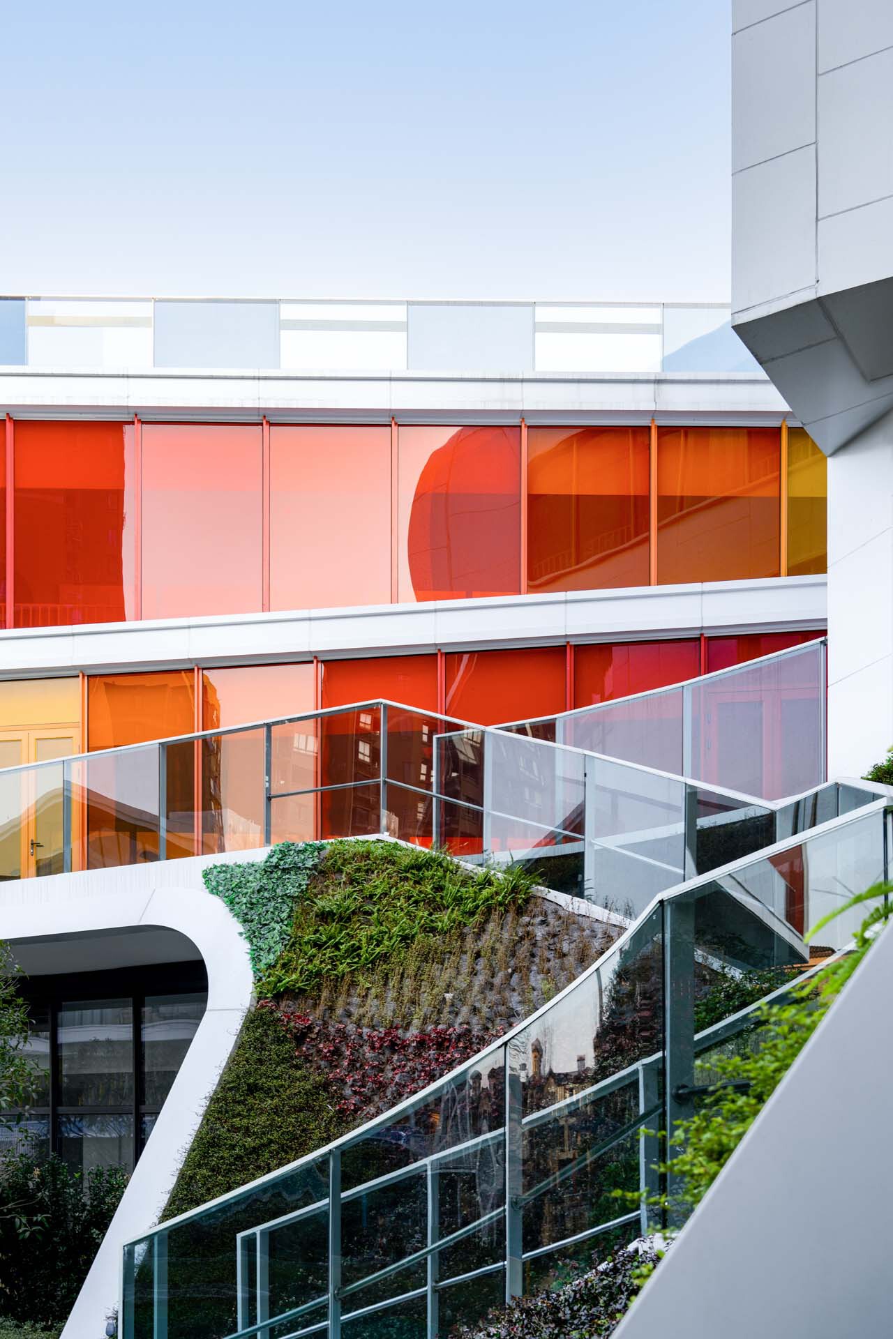 六座小尺度建筑由彩色玻璃的连廊相连,上下交错的连廊不仅丰富了立面的变化,也增加不同体块间的交流体验。光线穿过彩色玻璃,形成富有童趣的空间感受的同时加强空间引导性,孩子们透过彩色玻璃观察窗外的世界,感知和往常不一样的景致。屋顶活动空间是地面室外活动的小尺度延伸,承载了因天气、时间、场地等客观因素影响后的活动,除了可以自由活动外,屋顶空间还可以提供多种泛学习活动,如:种植、阅览、观星、展示、表演等。从地面的景观花园到屋顶的游乐场,孩子们可以自主规划其所需的相应活动空间,自在地去探索、发现,在探索的过程中不知不觉地增加运动量。