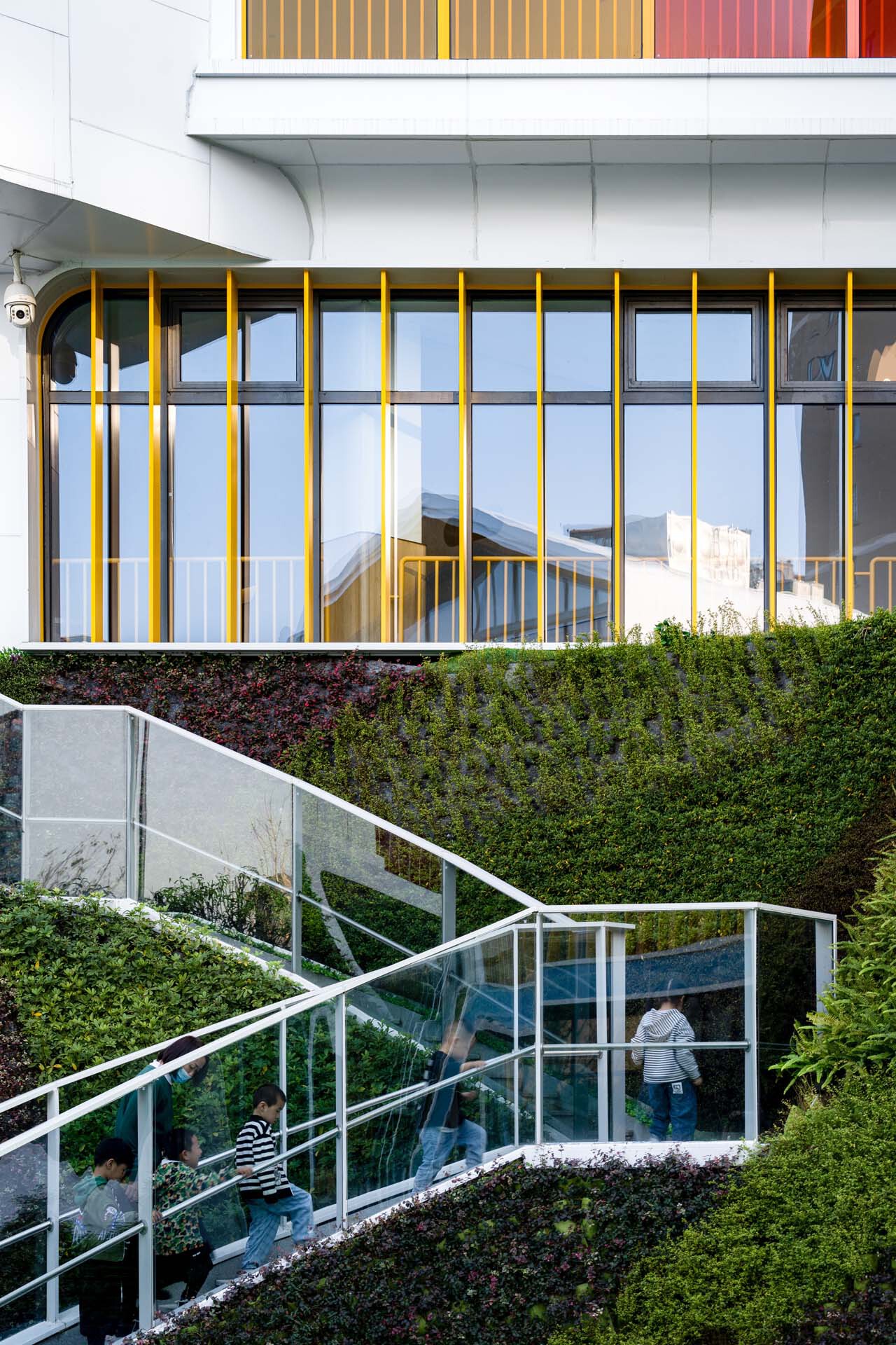 多向度的互连空间绿野仙踪由多向度的立体活动空间构成。蒙台梭利认为儿童的心理发展应是由“通过探索环境时所获得的经验的”结果,不同于层与层之间明确划分且独立的做法,垂直绿化的草坡将建筑划分为上下两个层次,再通过楼梯、连廊等将内外上下贯通,进一步弱化体量的同时形成多层次的开放空间,孩子们可以经由草坡上的楼梯到达二层的户外连廊,或是下课后快速到达中央的大庭院玩耍。