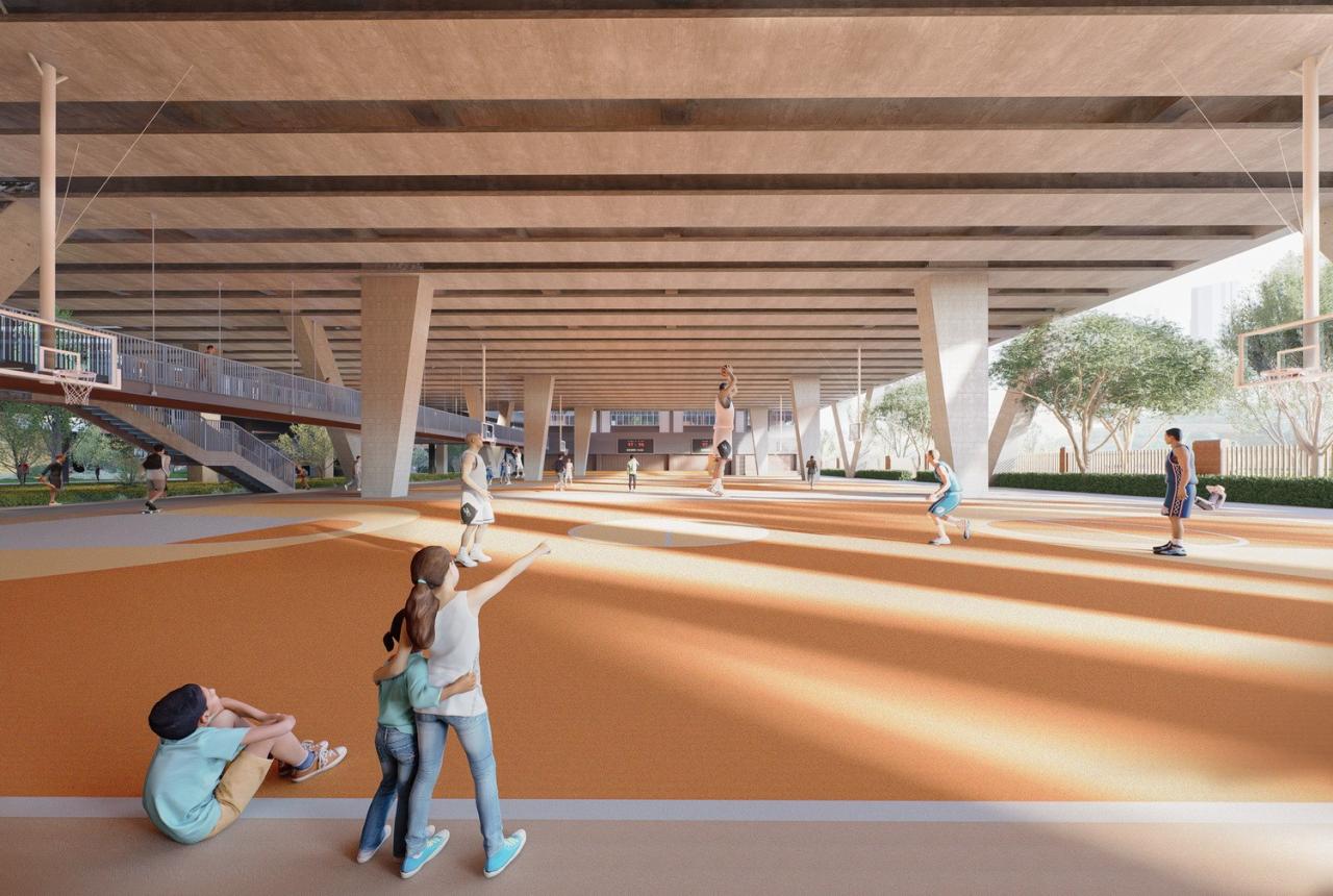 绿意从学校内部院落相互渗透,孩子们在院落中学习、玩耍、探索,多元空间的体验能让他们在学习中更好的发挥自己的潜能,培养学生的创新能力和实践能力,以满足未来社会发展的需求。运动区布置在初中校区的西侧是一座11米高的双层运动操场,操场一层架空层布置了篮球场、羽毛球场、游泳馆等多功能活动场所,V形架空运动场与教学主体通过简练的线条构成标志性的校园形象。